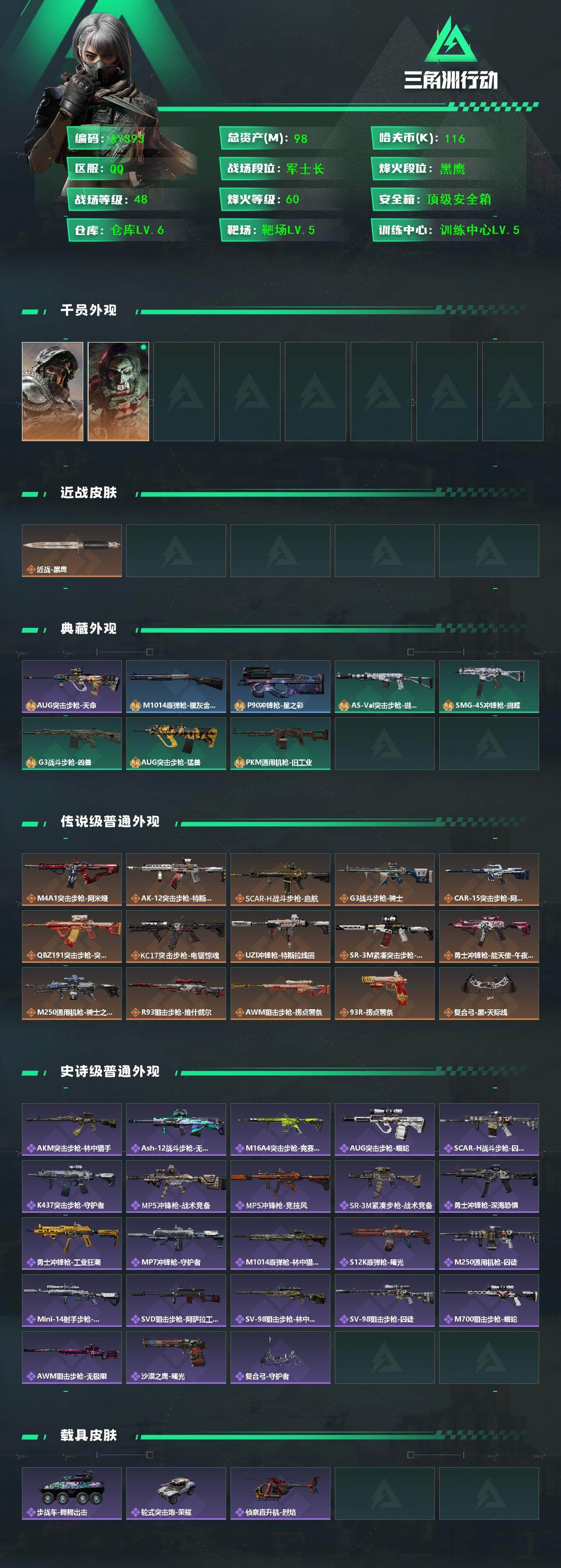 [14295630]【店主推荐捡漏号!可直接换绑】116k哈伏币-91m流动资产-60烽火等级-黑鹰-48战场等级-军士长 【干员外观】:深蓝-不破誓约,红狼-电锯惊魂 【近战皮肤】:近战-黑鹰 【传说级普通外观】:M4A1突击步枪-阿米娅,AK-12突击步枪-特斯拉线圈,SCAR-H战斗步枪-启航,G3战斗步枪-骑士,CAR-15突击步枪-阿米娅,腾龙突击步枪-捞点薯条,KC17突击步枪-电锯惊魂,UZI冲锋枪-特斯拉线圈,SR-3M紧凑突击步枪-特斯拉线圈,勇士冲锋枪-能天使-午夜邮差,M250通用机枪-骑士之心,R93狙击步枪-维什戴尔,AWM狙击步枪-捞点薯条,93R-捞点薯条,复合弓-黑·天际线 【史诗级普通外观】:AUG突击步枪-天命,AKM突击步枪-林中猎手,ASh-12战斗步枪-无极限,M16A4突击步枪-竞赛选手,AUG突击步枪-蝮蛇,SCAR-H战斗步枪-囚徒,K437突击步枪-守护者,MP5冲锋枪-战术竞备,MP5冲锋枪-竞技风,SR-3M紧凑突击步枪-战术竞备,勇士冲锋枪-深海恐惧,勇士冲锋枪-工业狂潮,MP7冲锋枪-守护者,M1014霰弹枪-林中猎手,S12K霰弹枪-曙光,M250通用机枪-囚徒,Mini-14射手步枪-守护者,SVD狙击步枪-阿萨拉工艺,SV-98狙击步枪-林中猎手,SV-98狙击步枪-囚徒,M700狙击步枪-蝮蛇,AWM狙击步枪-无极限,沙漠之鹰-曙光,复合弓-守护者 【稀有级普通外观】:M1014霰弹枪-银灰金属,P90冲锋枪-星之彩,M4A1突击步枪-前沿科技,AKM突击步枪-战术演练,AKM突击步枪-肃杀,QBZ95-1突击步枪-公平竞技,M16A4突击步枪-街头涂鸦,AUG突击步枪-全金属外壳,AUG突击步枪-前沿科技,M7战斗步枪-前沿科技,M7战斗步枪-捣蛋鬼,AK-12突击步枪-前沿科技,SCAR-H战斗步枪-荣耀列队,SCAR-H战斗步枪-黄昏,G3战斗步枪-战术演练,G3战斗步枪-主宰,AS Val突击步枪-哈夫克科技,腾龙突击步枪-前沿科技,腾龙突击步枪-冰天雪地,MP5冲锋枪-弄臣,MP5冲锋枪-巡逻队,MP5冲锋枪-虎啸,MP5冲锋枪-哈夫克卫队,P90冲锋枪-医疗协议,P90冲锋枪-黄昏,Vector冲锋枪-先锋,UZI冲锋枪-亚特兰蒂斯,野牛冲锋枪-公平竞技,SMG-45-行动开启,SMG-45冲锋枪-幻影结构