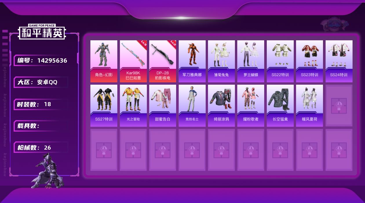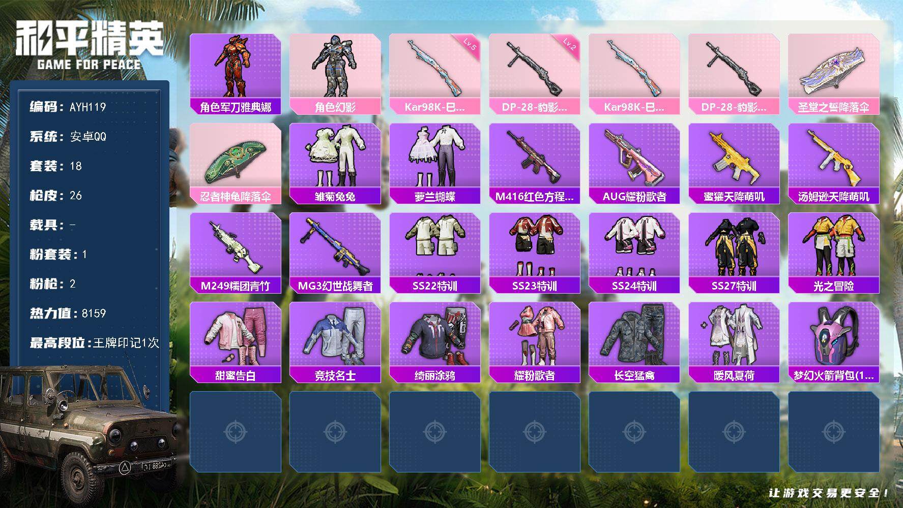 [14295636]地铁满天赋/可二次【店主推荐捡漏号!可直接换绑】安卓 手Q-1粉装-2特效枪-0载具-0粉色飞行器-8159热力值-1王牌印记-18套装-26枪皮【热门品类】:角色-军刀雅典娜【粉色套装】:角色-幻影【粉色枪皮等级】:Kar98K-巳巳如意(五级),DP-28-豹影疾电(二级)【粉色枪皮】:Kar98K-巳巳如意,DP-28-豹影疾电