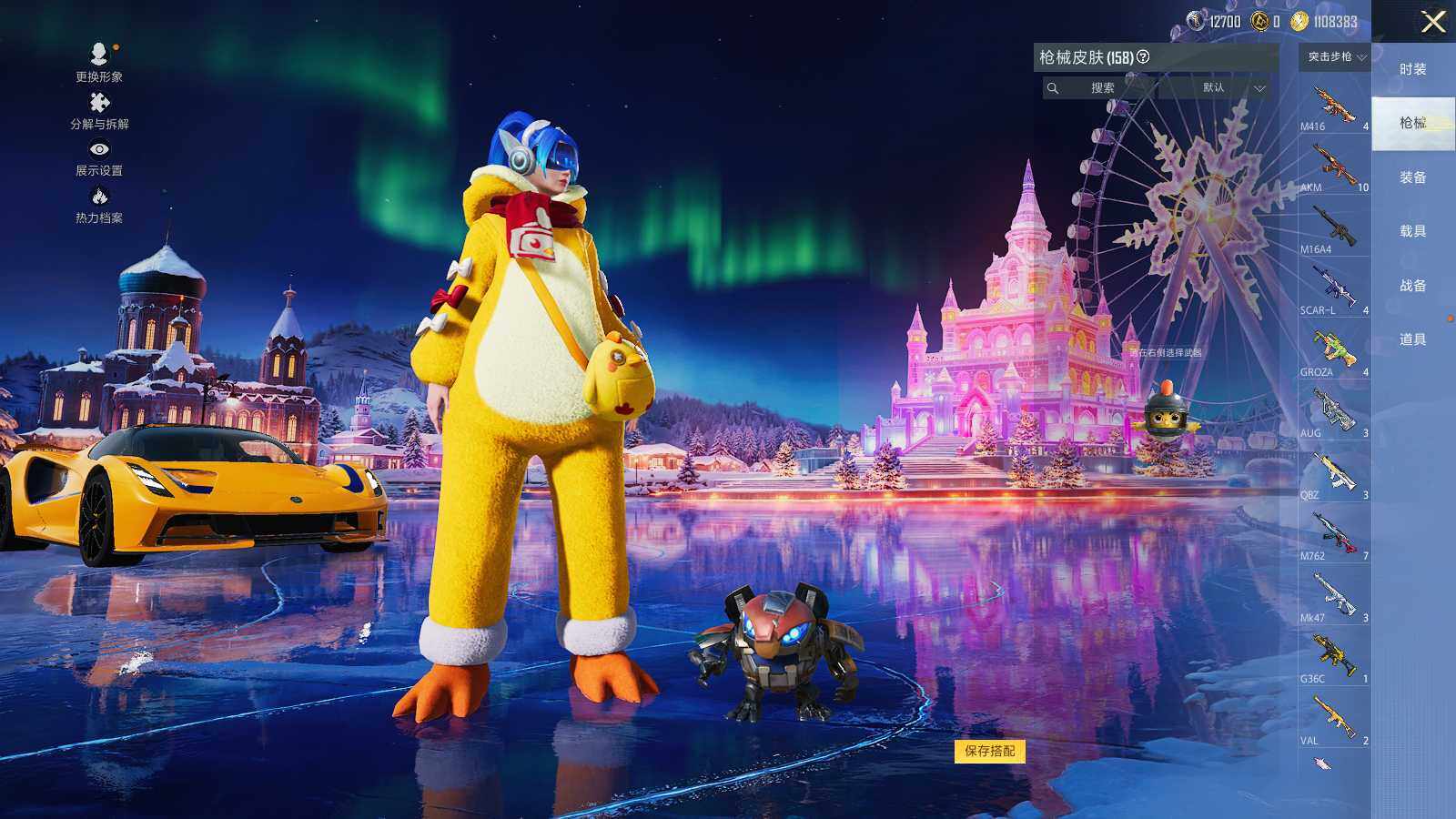 AKM-甜心宝贝,SCAR-L-青春物语,M416-至情至圣,UMP45-相思残雪,Vector-环太平洋,P90-能量风暴,Kar98K-巳巳如意,M200-伏羲圣卦,M249-绒雪飘舞