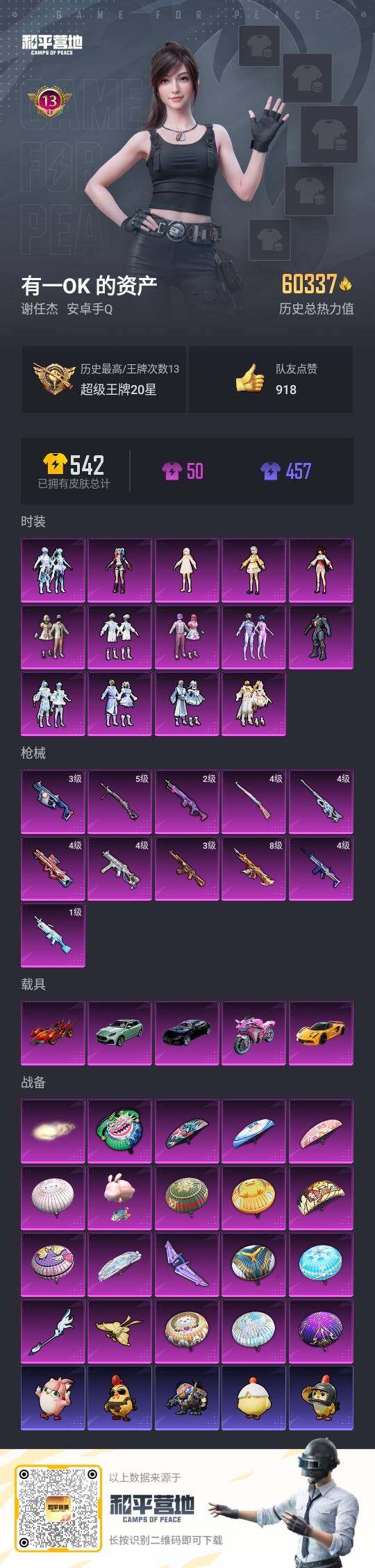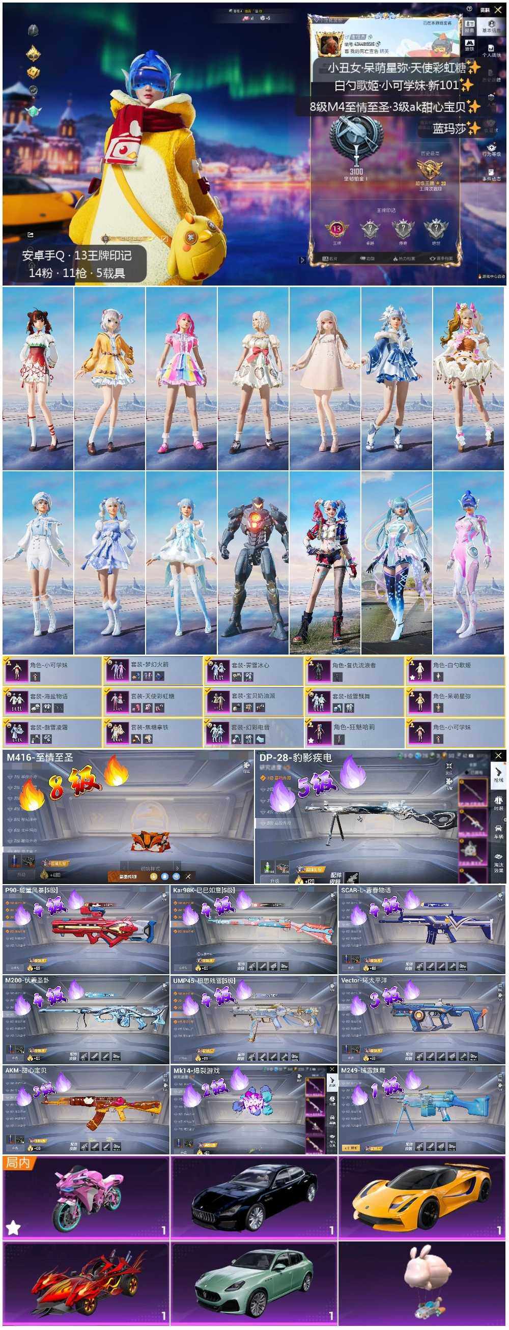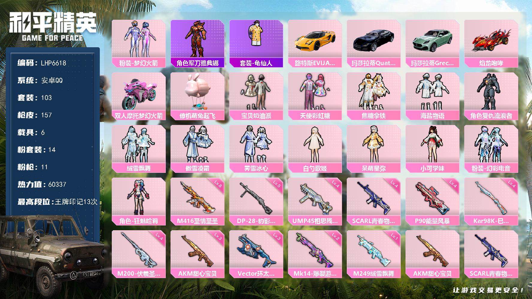 [14295707]可二次【店主推荐捡漏号!可直接换绑】/素材身法号 安卓 手Q-14粉装-11特效枪-6载具-4粉色飞行器-6w热力值-13王牌印记-103套装-157枪皮【热门品类】:粉装-梦幻火箭,角色-军刀雅典娜,套装-龟仙人【粉色载具】:路特斯EVIJA(星际黄),玛莎拉蒂Quattroporte(夜幕蓝),玛莎拉蒂Grecale(薄荷绿),焰龙咆哮,双人摩托-梦幻火箭,僚机-萌兔起飞【粉色套装】:粉装-宝贝奶油派,粉装-天使彩虹糖,粉装-梦幻火箭,粉装-焦糖拿铁,粉装-海盐物语,角色-复仇流浪者,粉装-绒雪飘舞,粉装-傲雪凌霜,粉装-霁雪冰心,角色-白勺歌姬,角色-呆萌星弥,角色-小可学妹,粉装-幻彩电音,角色-狂魅哈莉【粉色枪皮等级】:AKM-甜心宝贝(三级),SCAR-L-青春物语(四级),M416-至情至圣(八级),UMP45-相思残雪(四级),Vector-环太平洋(三级),P90-能量风暴(四级),Kar98K-巳巳如意(四级),Mk14-爆裂游戏(二级),M200-伏羲圣卦(四级),M249-绒雪飘舞(一级),DP-28-豹影疾电(五级)【粉色飞行器】:梦幻火箭飞行器,齐天大圣飞行器,庄周梦蝶飞行器,绒雪飘舞飞行器