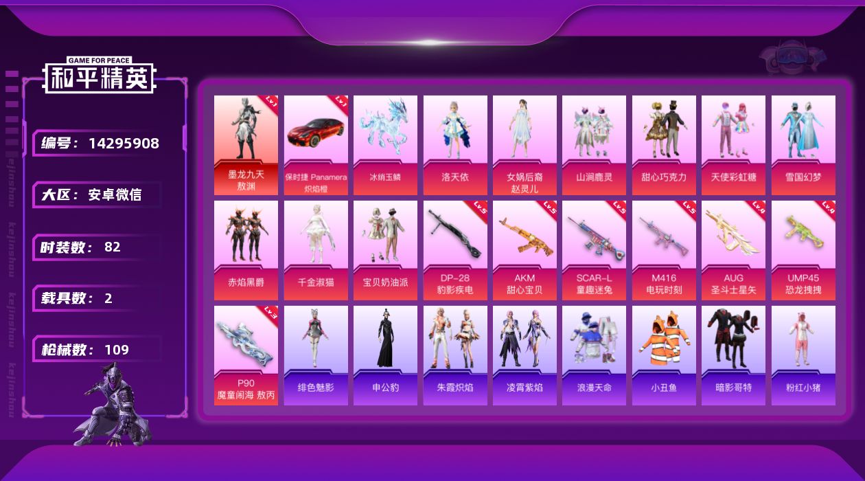 [14295908]素材身法号/无敌战神框1/老木乃伊 安卓 微信-无敌战神框-1神装-9粉装-7特效枪-2载具-6粉色飞行器-4.3w热力值-5王牌印记-82套装-109枪皮【红色载具】:保时捷Panamera(炽焰橙)(一级)【红色神装等级】:墨龙九天-敖渊(一级)【热门品类】:粉装-雪国幻梦,套装-浪漫天命,套装-冥河战士,套装-深海小丑鱼,套装-小丑鱼,套装-暗影哥特,套装-粉红小猪,M416-星际漫游,熔岩游骑兵连帽夹克【粉色载具】:保时捷Panamera(炽焰橙),冰绡玉鳞【粉色套装】:粉装-甜心巧克力,粉装-宝贝奶油派,粉装-天使彩虹糖,粉装-雪国幻梦,粉装-山涧鹿灵,角色-洛天依,粉装-赤焰黑爵,女娲后裔-赵灵儿,角色-千金淑猫【粉色枪皮等级】:AKM-甜心宝贝(五级),SCAR-L-童趣迷兔(五级),M416-电玩时刻(五级),AUG-圣斗士星矢(四级),UMP45-恐龙拽拽(四级),P90-魔童闹海 敖丙(三级),DP-28-豹影疾电(五级)【粉色飞行器】:太空嘟嘟飞行器,繁龙极客飞行器,灵珠游龙飞行器,极意拳锋飞行器