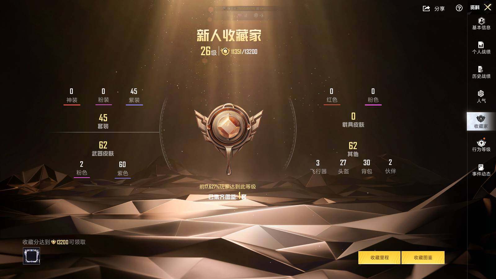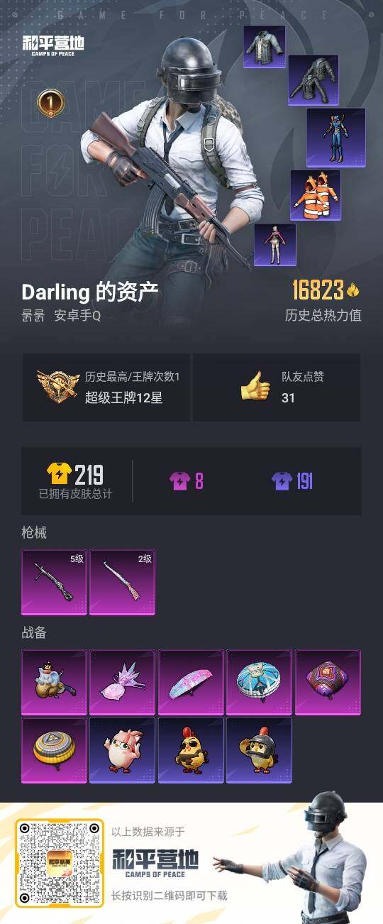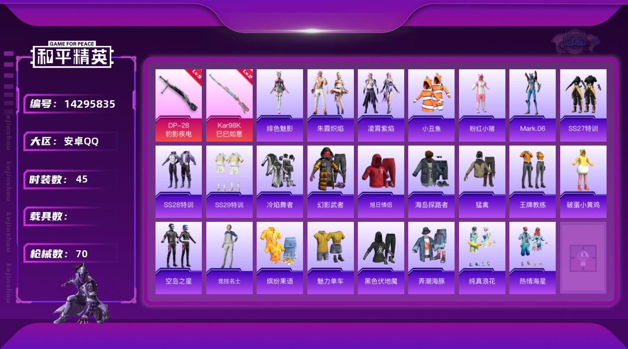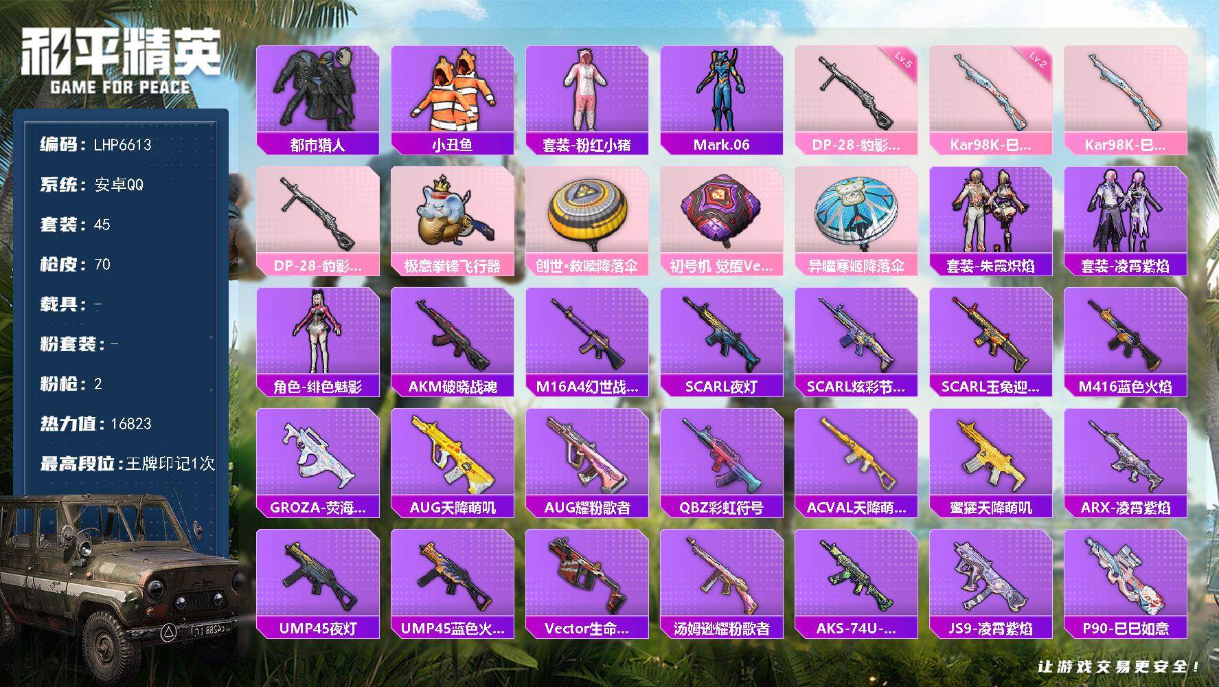 [14295835]可二次【店主推荐捡漏号!可直接换绑】/地铁满天赋 安卓 手Q-2特效枪-2粉色飞行器-1.6w热力值-1王牌印记-45套装-70枪皮【热门品类】:套装-都市猎人,套装-小丑鱼,套装-粉红小猪,角色-Mark.06【粉色枪皮等级】:Kar98K-巳巳如意(二级),DP-28-豹影疾电(五级)【粉色飞行器】:极意拳锋飞行器