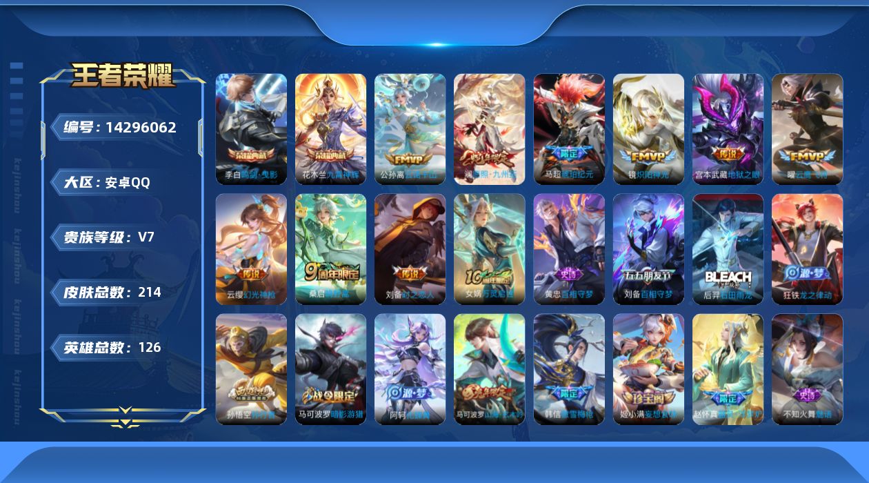 [14296062]【店主推荐捡漏号!可直接换绑】安卓Q-V7-最强王者段位-126英雄-214皮肤-2典藏皮肤-9传说-67史诗