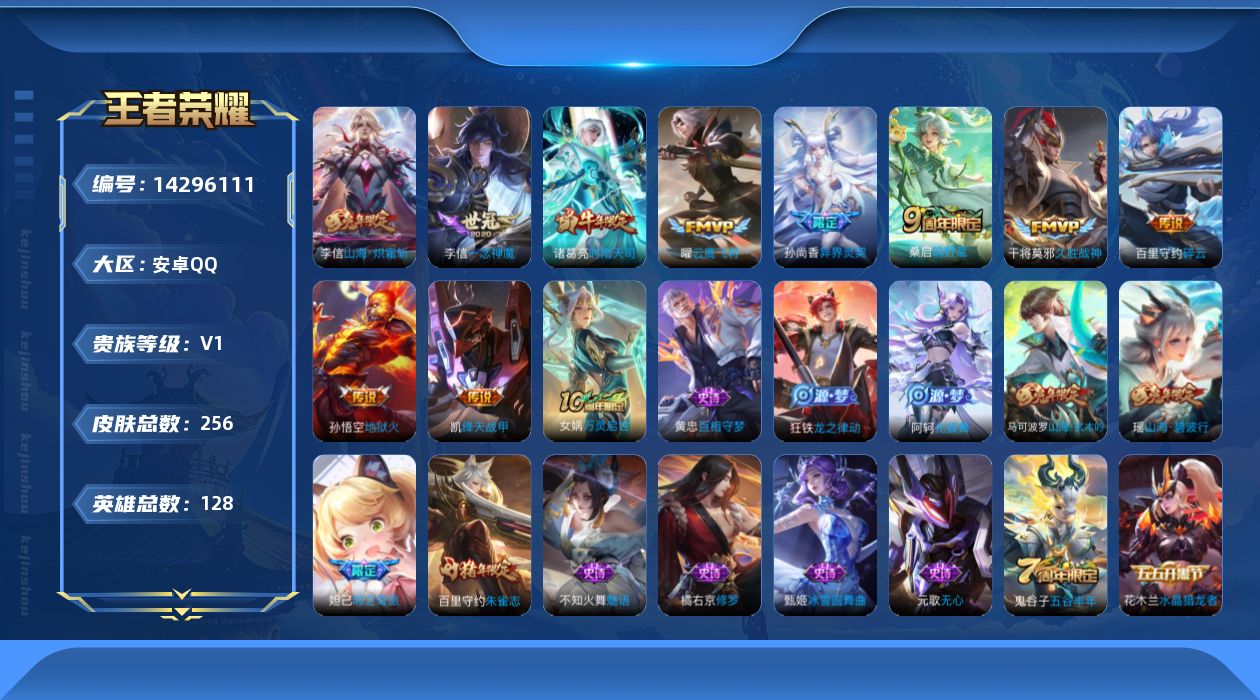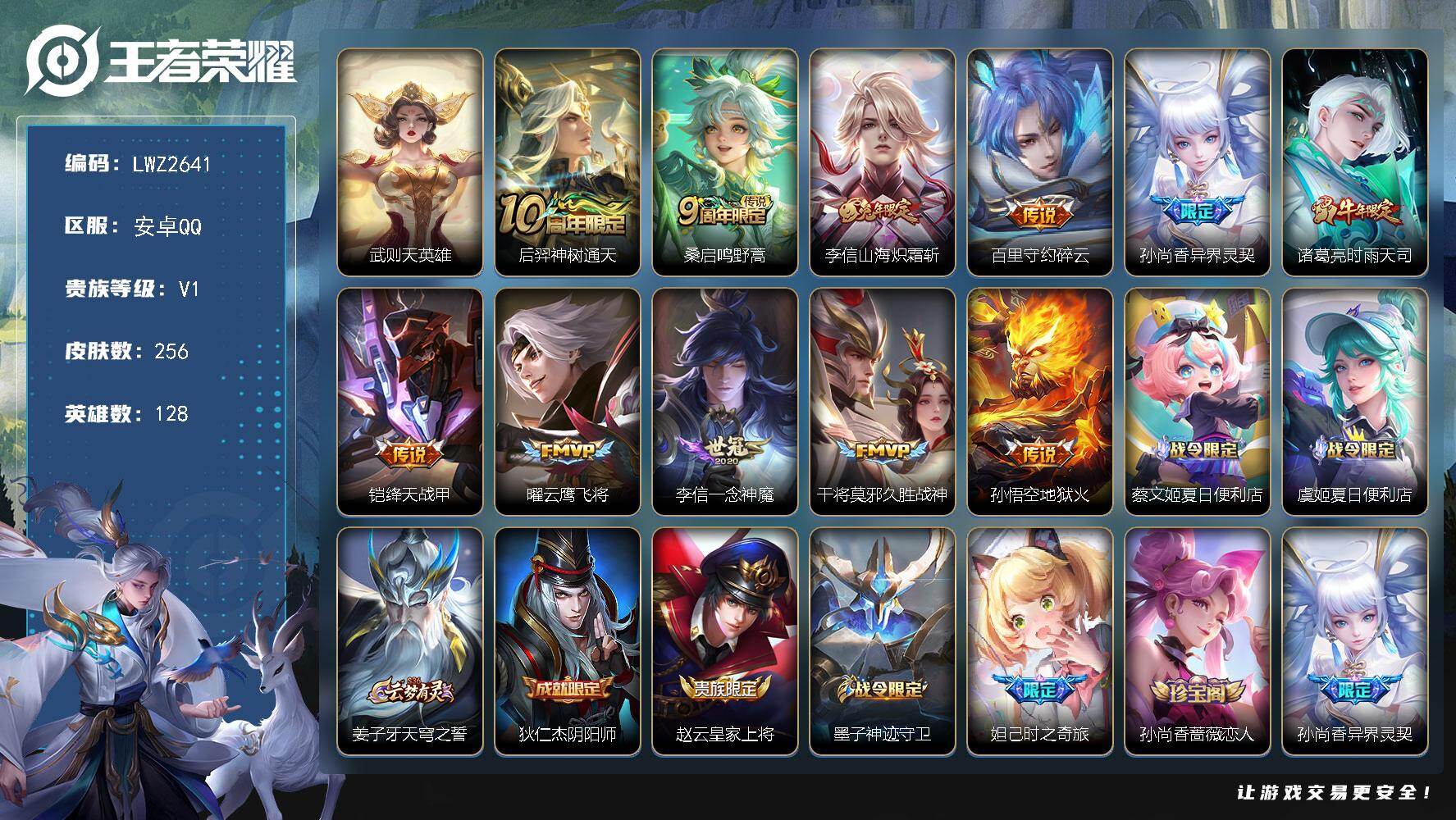 [14296111]【店主推荐捡漏号!可直接换绑】安卓Q-V1-最强王者段位-128英雄-256皮肤-1典藏英雄-11传说-56史诗