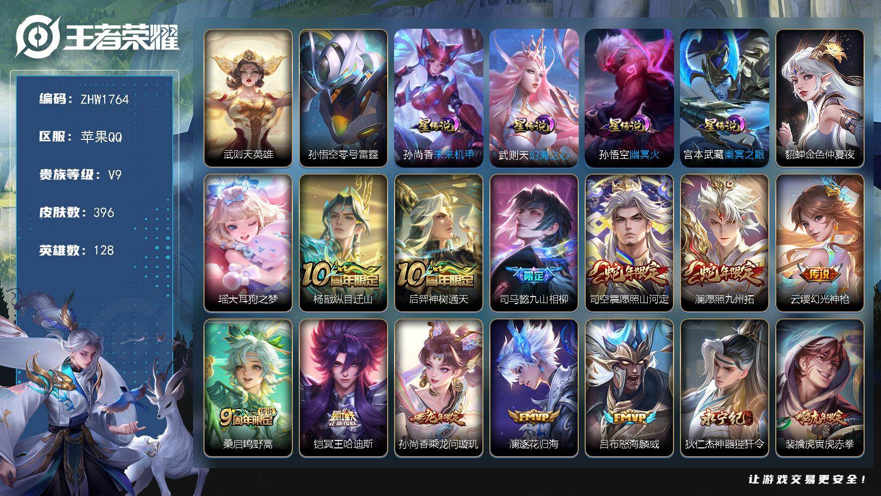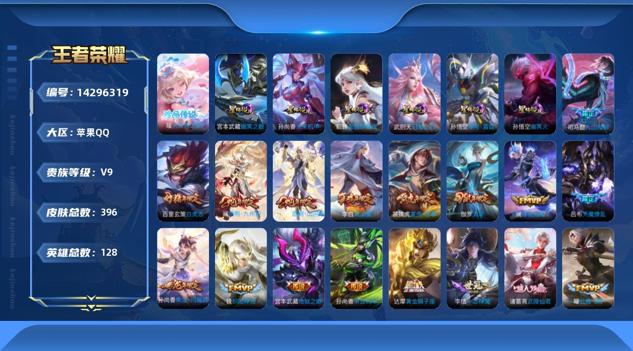 [14296319]可二次【店主推荐捡漏号!可直接换绑,背包一颗水晶】,,苹果Q-V9-最强王者段位-128英雄-396皮肤-1典藏英雄-1珍品传说-35传说-122史诗