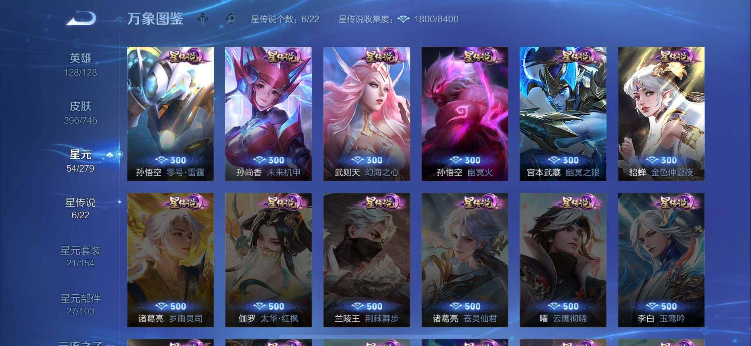 孙膑妖精王,扁鹊炼金王,虞姬凯尔特女王,白起狰,太乙真人饕餮,曹操烛龙,典韦穷奇,狂铁御狮,米莱狄御霄,牛魔御旌,盾山御銮,夏侯惇朔风刀,明世隐疑决卦,老夫子醍醐杖,鬼谷子原初探秘者,狄仁杰万华元夜,程咬金演武夺筹,钟馗驱傩正仪,苏烈千军破阵,吕布猎兽之王,嬴政白昼王子,女娲朔望之晖,典韦蓝屏警告,钟馗神迹守卫,鲁班七号狮舞东方,沈梦溪星空之诺,李元芳银河之约,刘邦夺宝奇兵,马可波罗暗影游猎,蒙犽狂想玩偶喵,元歌云间偶戏,弈星混沌棋,达摩沙漠行僧,兰陵王金庭之子,沈梦溪大漠名商,李元芳云中旅人,桑启海盐诗旅,裴擒虎擒涛扼浪,鲁班大师探海日志,项羽苍威无极,镜青焰无极