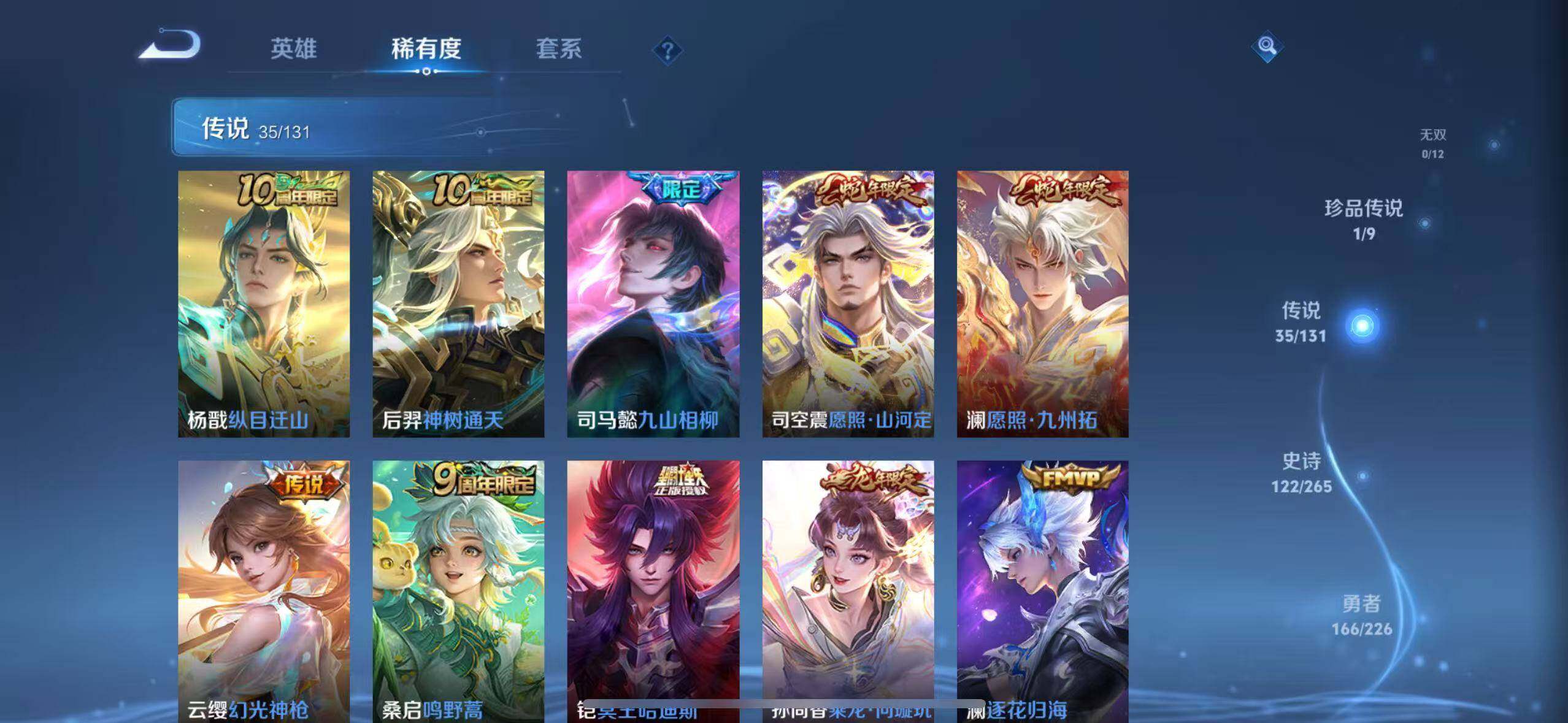 【传说皮肤】:杨戬纵目迁山,后羿神树通天,司马懿九山相柳,司空震愿照山河定,澜愿照九州拓,云缨幻光神枪,桑启鸣野蒿,铠冥王哈迪斯,孙尚香乘龙问璇玑,澜逐花归海,吕布怒海麟威,狄仁杰神器狴犴令,裴擒虎寅虎赤拳,赵云淬星耀世,西施游龙清影,镜炽阳神光,虞姬启明星使,孙悟空零号赤焰,曜云鹰飞将,李信一念神魔,伽罗太华,干将莫邪久胜战神,虞姬云霓雀翎,达摩黄金狮子座,百里玄策白虎志,花木兰冠军飞将,后羿黄金射手座,诸葛亮武陵仙君,貂蝉仲夏夜之梦,李白凤求凰,孙尚香末日机甲,宫本武藏地狱之眼,孙悟空地狱火,吕布天魔缭乱,武则天海洋之心