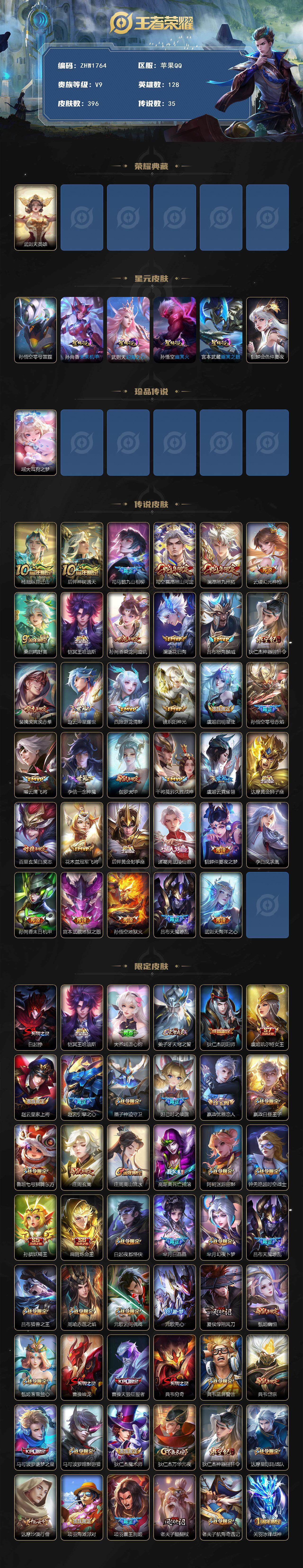 [14296319]可二次【店主推荐捡漏号!可直接换绑,背包一颗水晶】,,苹果Q-V9-最强王者段位-128英雄-396皮肤-1典藏英雄-1珍品传说-35传说-122史诗 【英雄全皮】:阿轲全皮,司马懿全皮,孙权全皮,鬼谷子全皮,猪八戒全皮,蒙恬全皮,空空儿全皮 【荣耀典藏】:武则天英雄 【珍品传说】:瑶大耳狗之梦 【传说皮肤】:杨戬纵目迁山,后羿神树通天,司马懿九山相柳,司空震愿照山河定,澜愿照九州拓,云缨幻光神枪,桑启鸣野蒿,铠冥王哈迪斯,孙尚香乘龙问璇玑,澜逐花归海,吕布怒海麟威,狄仁杰神器狴犴令,裴擒虎寅虎赤拳,赵云淬星耀世,西施游龙清影,镜炽阳神光,虞姬启明星使,孙悟空零号赤焰,曜云鹰飞将,李信一念神魔,伽罗太华,干将莫邪久胜战神,虞姬云霓雀翎,达摩黄金狮子座,百里玄策白虎志,花木兰冠军飞将,后羿黄金射手座,诸葛亮武陵仙君,貂蝉仲夏夜之梦,李白凤求凰,孙尚香末日机甲,宫本武藏地狱之眼,孙悟空地狱火,吕布天魔缭乱,武则天海洋之心 【限定皮肤】:白起狰,铠冥王哈迪斯,大乔绒语心约,姜子牙天穹之誓,狄仁杰阴阳师,虞姬凯尔特女王,赵云皇家上将,赵云引擎之心,墨子神迹守卫,妲己时之彼端,嬴政优雅恋人,嬴政白昼王子,鲁班七号狮舞东方,庄周玄嵩,庄周高山流水,高渐离死亡摇滚,阿轲迷踪丽影,钟无艳超时空战士,孙膑妖精王,扁鹊炼金王,白起夜都怪侠,芈月白晶晶,芈月幻夜卜梦,吕布天魔缭乱,吕布猎兽之王,周瑜赤莲之焰,元歌云间偶戏,元歌无心,夏侯惇朔风刀,甄姬幽恒,甄姬落雪兰心,曹操烛龙,曹操天狼征服者,典韦穷奇,典韦蓝屏警告,典韦岱宗,马可波罗逐梦之星,马可波罗暗影游猎,狄仁杰魔术师,狄仁杰万华元夜,狄仁杰神器狴犴令,达摩星际陆战队,达摩沙漠行僧,项羽海滩派对,项羽霸王别姬,老夫子醍醐杖,老夫子航海奇遇记,关羽冰锋战神,程咬金演武夺筹,刘邦夺宝奇兵,韩信飞衡,兰陵王驯魔猎人,兰陵王金庭之子,花木兰青春决赛季,亚瑟潮玩骑士王,孙悟空至尊宝,孙悟空零号赤焰,牛魔御旌,后羿辉光之辰,后羿如梦令,后羿圣弓游侠,刘备百相守梦,李元芳银河之约,李元芳云中旅人,虞姬霸王别姬,虞姬启明星使,钟馗神迹守卫,钟馗驱傩正仪,杨玉环遇见飞天,杨戬潮玩骑兵,女娲朔望之晖,干将莫邪冰霜恋舞曲,干将莫邪真爱魔法,雅典娜单词大作战,雅典娜黎明之约,蔡文姬奇迹圣诞,蔡文姬繁星吟游,太乙真人饕餮,太乙真人华丽摇滚,鬼谷子原初探秘