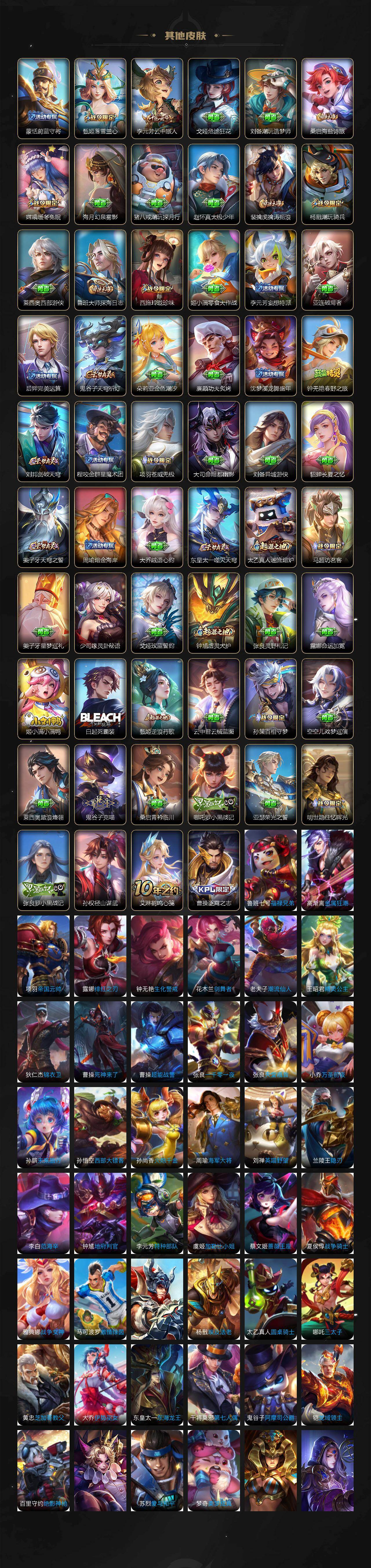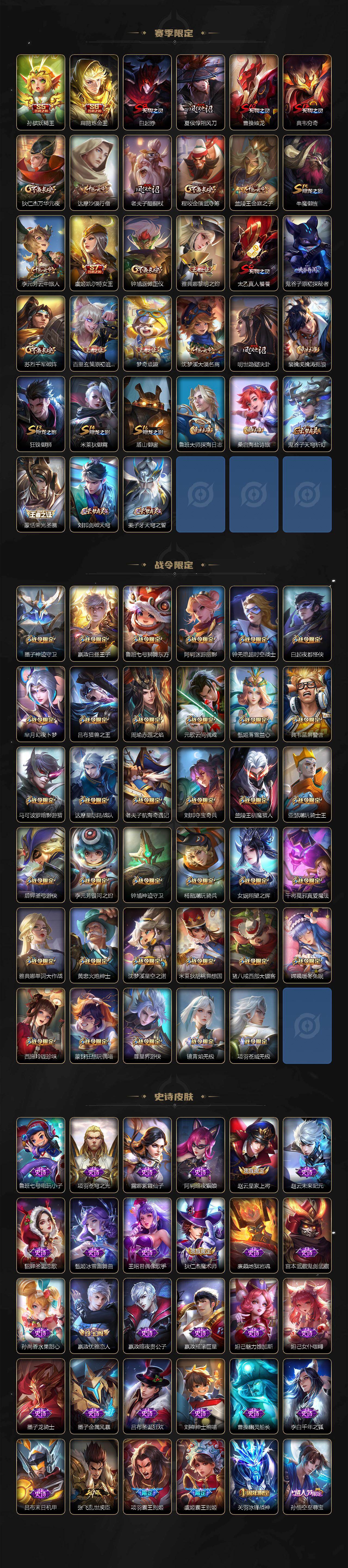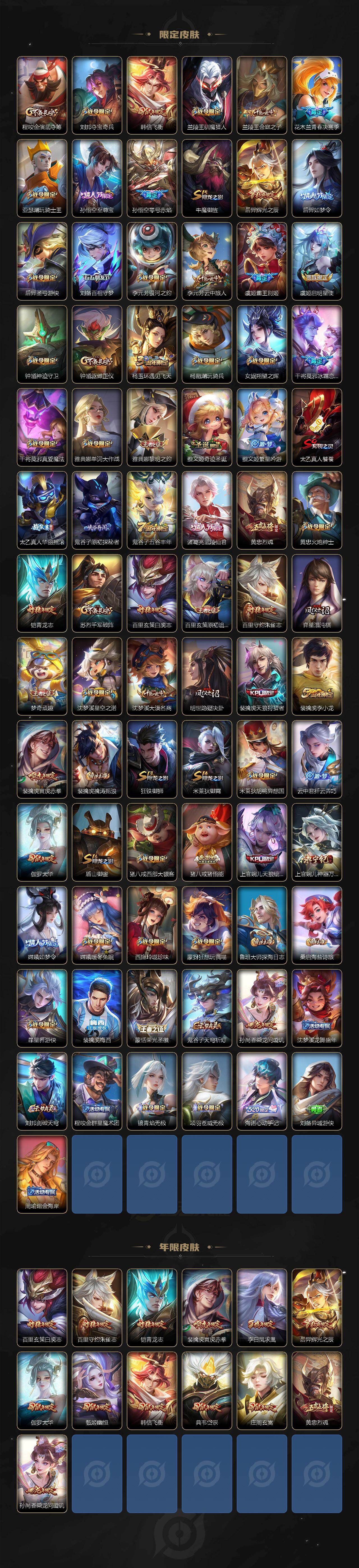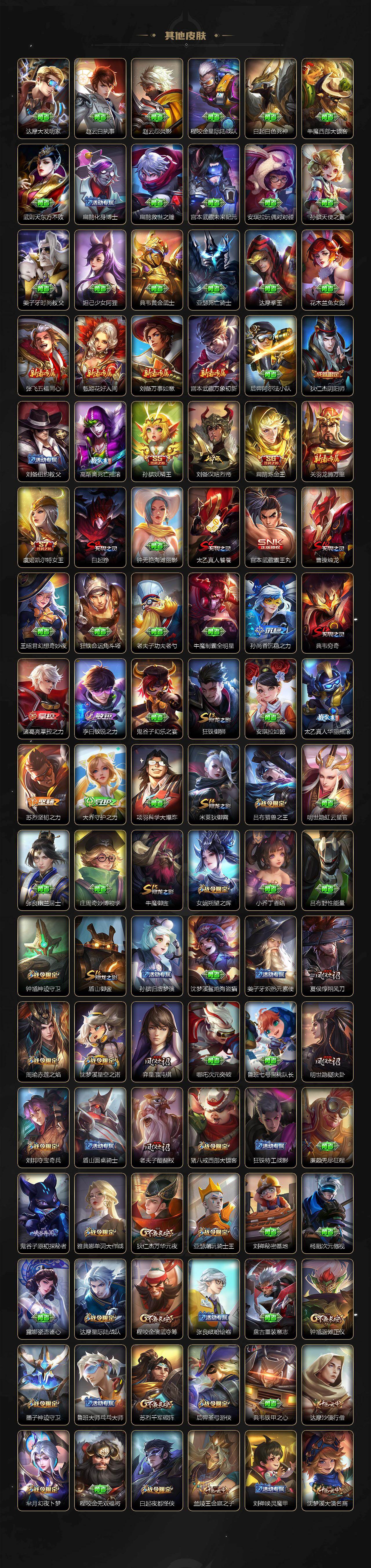 【限定皮肤】:白起狰,铠冥王哈迪斯,大乔绒语心约,姜子牙天穹之誓,狄仁杰阴阳师,虞姬凯尔特女王,赵云皇家上将,赵云引擎之心,墨子神迹守卫,妲己时之彼端,嬴政优雅恋人,嬴政白昼王子,鲁班七号狮舞东方,庄周玄嵩,庄周高山流水,高渐离死亡摇滚,阿轲迷踪丽影,钟无艳超时空战士,孙膑妖精王,扁鹊炼金王,白起夜都怪侠,芈月白晶晶,芈月幻夜卜梦,吕布天魔缭乱,吕布猎兽之王,周瑜赤莲之焰,元歌云间偶戏,元歌无心,夏侯惇朔风刀,甄姬幽恒,甄姬落雪兰心,曹操烛龙,曹操天狼征服者,典韦穷奇,典韦蓝屏警告,典韦岱宗,马可波罗逐梦之星,马可波罗暗影游猎,狄仁杰魔术师,狄仁杰万华元夜,狄仁杰神器狴犴令,达摩星际陆战队,达摩沙漠行僧,项羽海滩派对,项羽霸王别姬,老夫子醍醐杖,老夫子航海奇遇记,关羽冰锋战神,程咬金演武夺筹,刘邦夺宝奇兵,韩信飞衡,兰陵王驯魔猎人,兰陵王金庭之子,花木兰青春决赛季,亚瑟潮玩骑士王,孙悟空至尊宝,孙悟空零号赤焰,牛魔御旌,后羿辉光之辰,后羿如梦令,后羿圣弓游侠,刘备百相守梦,李元芳银河之约,李元芳云中旅人,虞姬霸王别姬,虞姬启明星使,钟馗神迹守卫,钟馗驱傩正仪,杨玉环遇见飞天,杨戬潮玩骑兵,女娲朔望之晖,干将莫邪冰霜恋舞曲,干将莫邪真爱魔法,雅典娜单词大作战,雅典娜黎明之约,蔡文姬奇迹圣诞,蔡文姬繁星吟游,太乙真人饕餮,太乙真人华丽摇滚,鬼谷子原初探秘