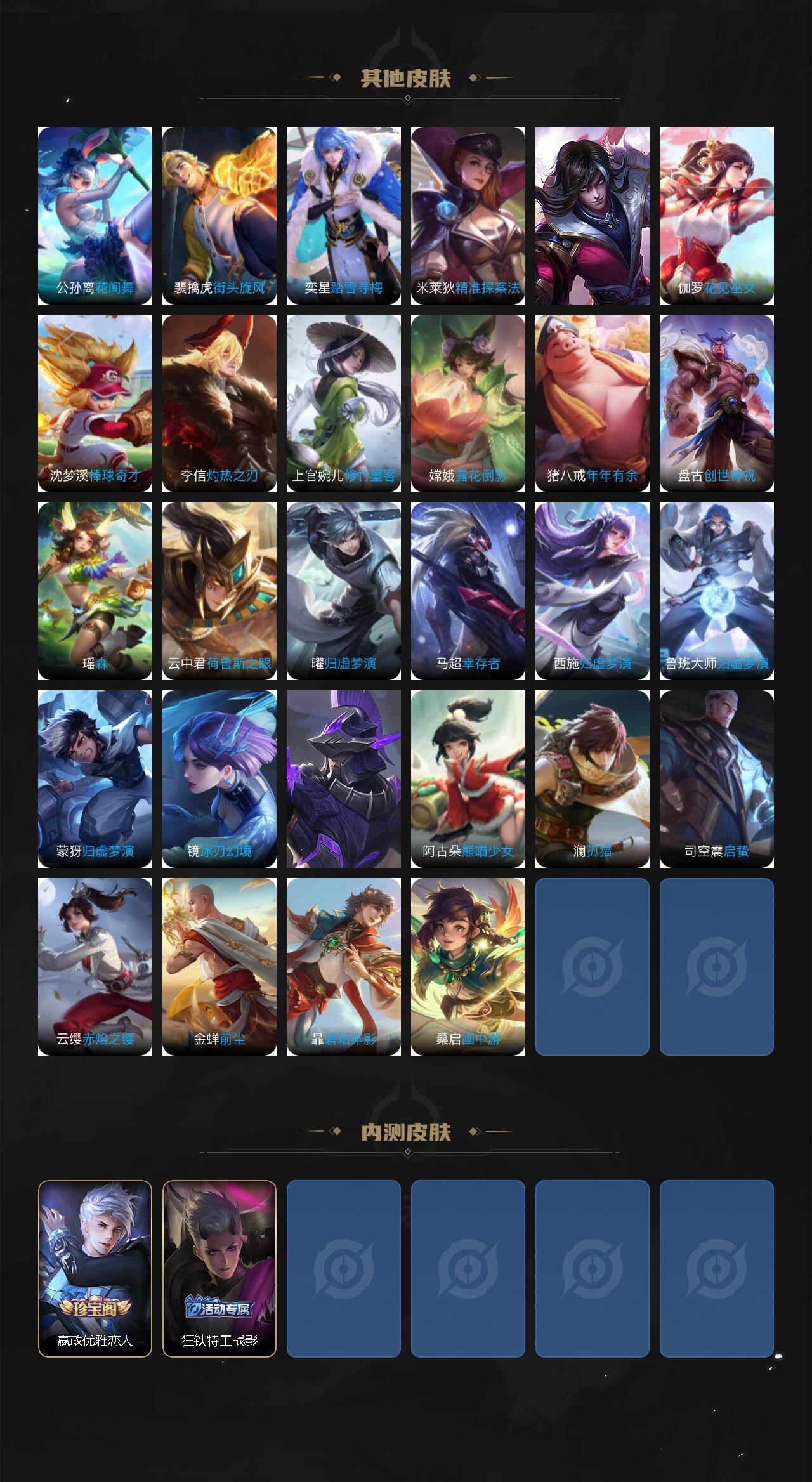关羽冰锋战神,裴擒虎李小龙,黄忠烈魂,后羿辉光之辰,庄周玄嵩,典韦岱宗,甄姬幽恒,韩信飞衡,伽罗太华,曹操天狼征服者,裴擒虎天狼狩猎者,上官婉儿天狼绘梦者,马可波罗逐梦之星,铠青龙志,百里玄策白虎志,百里守约朱雀志,项羽霸王别姬,虞姬霸王别姬,后羿如梦令,嫦娥如梦令,孙悟空至尊宝,裴擒虎梅西,干将莫邪冰霜恋舞曲,花木兰青春决赛季,蔡文姬奇迹圣诞,妲己时之彼端,芈月白晶晶,赵云引擎之心,猪八戒猪悟能,裴擒虎寅虎·赤拳,上官婉儿神器·万象笔,桑启鸣野蒿,澜愿照·九州拓,司空震愿照·山河定