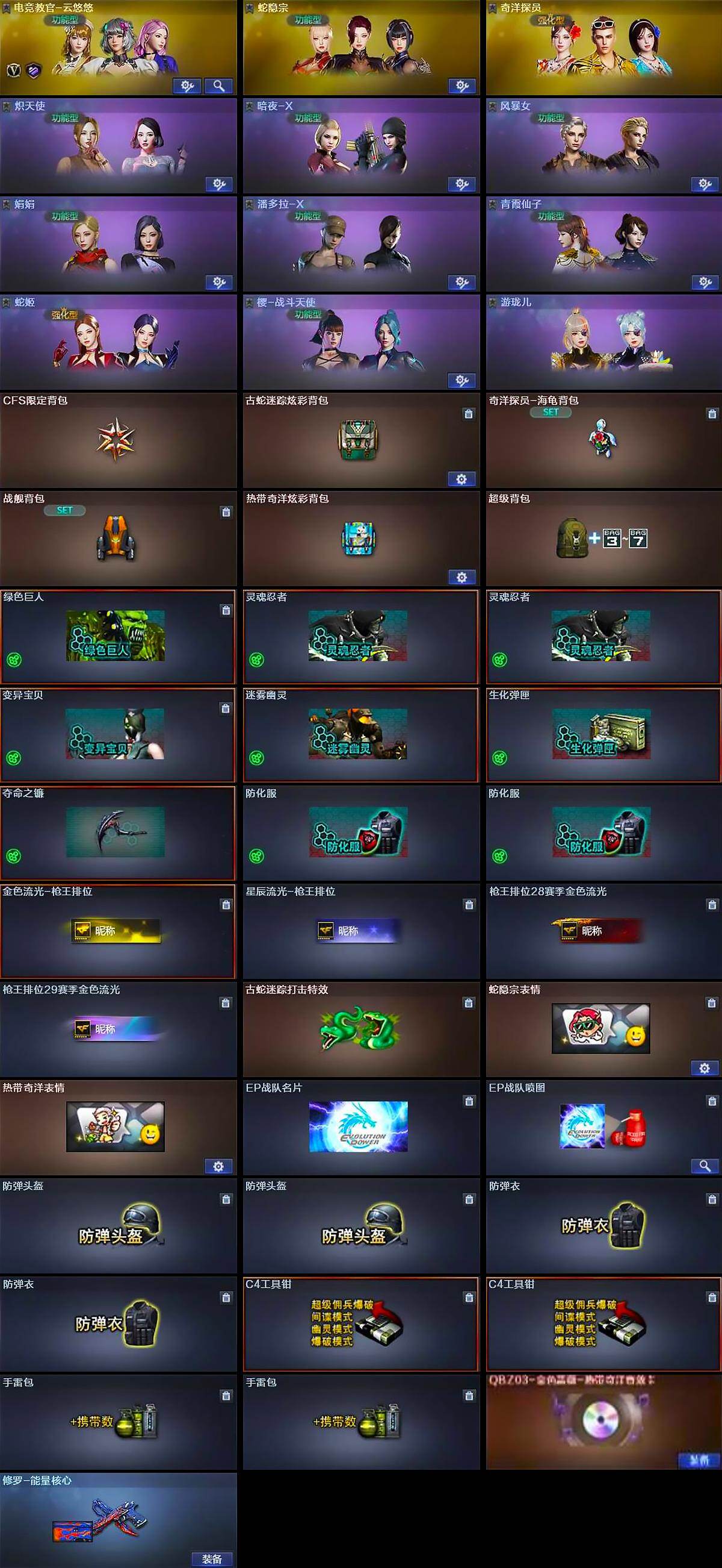 【道具】:CFS限定背包,古蛇迷踪炫彩背包,奇洋探员-海龟背包,战舰背包,热带奇洋炫彩背包,超级背包,绿色巨人,灵魂忍者*2,变异宝贝,迷雾幽灵,生化弹匣,夺命之镰,防化服*2,金色流光-枪王排位,星辰流光-枪王排位,枪王排位28赛季金色流光,枪王排位29赛季金色流光,古蛇迷踪打击特效,蛇隐宗表情,热带奇洋表情,EP战队名片,EP战队喷图,防弹头盔*2,防弹衣*2,C4工具钳*2,手雷包*2