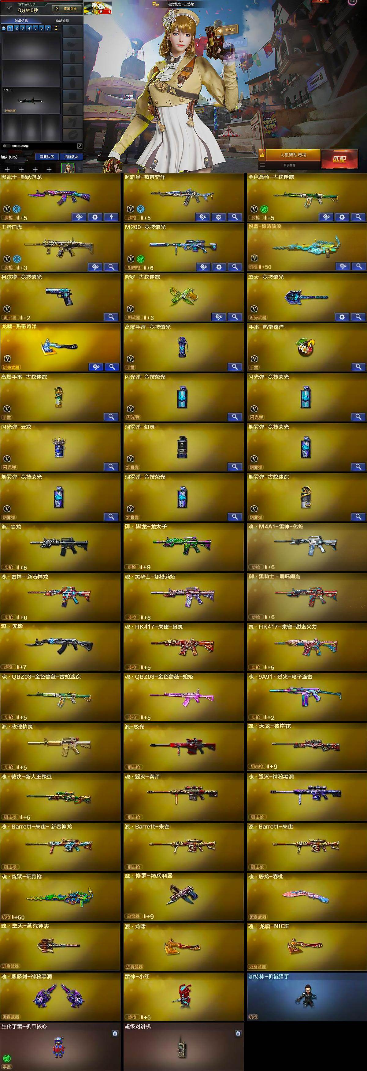 【英雄级武器】:黑武士-锦绣游龙,超新星-热带奇洋,金色蔷薇-古蛇迷踪,王者白虎-觉醒版,M200-竞技荣光,悦蓝-惊涛骇浪-觉醒版,柯尔特-竞技荣光,修罗-古蛇迷踪,擎天-竞技荣光,龙啸-热带奇洋,高爆手雷-竞技荣光,手雷-热带奇洋,高爆手雷-古蛇迷踪,闪光弹-竞技荣光*2,闪光弹-云龙,烟雾弹-幻灵,烟雾弹-竞技荣光*3,烟雾弹-古蛇迷踪