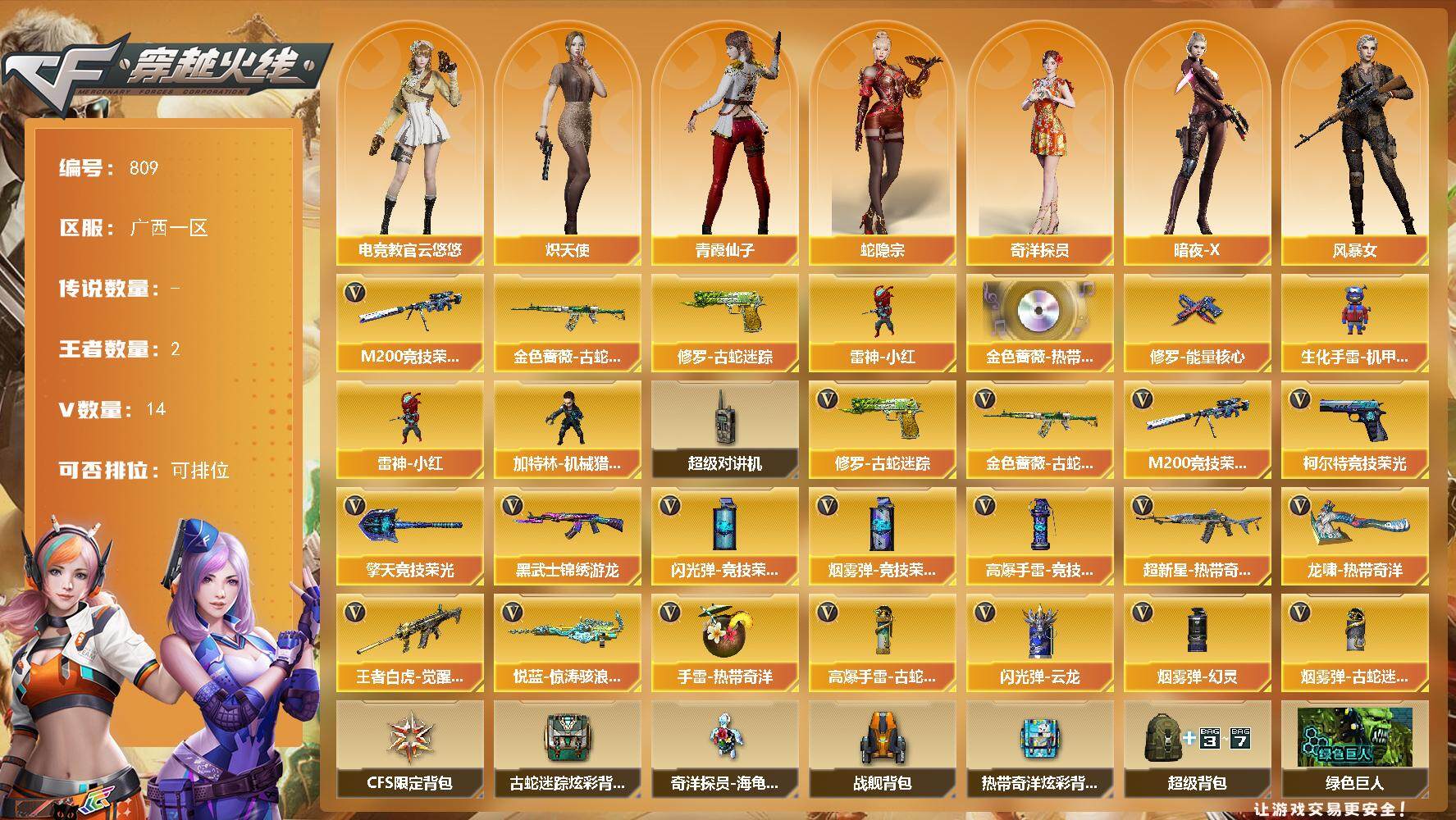[14297062]广西一区-14V-2王者-0炫金 【热门武器】:金色蔷薇-古蛇迷踪,修罗-古蛇迷踪,M200-竞技荣光,雷神-小红 【音效卡】:QBZ03-金色蔷薇-热带奇洋音效卡 【皮肤】:修罗-能量核心 【角色】:电竞教官-云悠悠,蛇隐宗,奇洋探员,炽天使,暗夜-X,风暴女,娟娟,潘多拉-X,青霞仙子,蛇姬,樱-战斗天使,游珑儿 【人偶武器】:雷神-小红,加特林-机械猎手,生化手雷-机甲核心 【暴走生化】:超级对讲机 【英雄级武器】:黑武士-锦绣游龙,超新星-热带奇洋,金色蔷薇-古蛇迷踪,王者白虎-觉醒版,M200-竞技荣光,悦蓝-惊涛骇浪-觉醒版,柯尔特-竞技荣光,修罗-古蛇迷踪,擎天-竞技荣光,龙啸-热带奇洋,高爆手雷-竞技荣光,手雷-热带奇洋,高爆手雷-古蛇迷踪,闪光弹-竞技荣光*2,闪光弹-云龙,烟雾弹-幻灵,烟雾弹-竞技荣光*3,烟雾弹-古蛇迷踪 【道具】:CFS限定背包,古蛇迷踪炫彩背包,奇洋探员-海龟背包,战舰背包,热带奇洋炫彩背包,超级背包,绿色巨人,灵魂忍者*2,变异宝贝,迷雾幽灵,生化弹匣,夺命之镰,防化服*2,金色流光-枪王排位,星辰流光-枪王排位,枪王排位28赛季金色流光,枪王排位29赛季金色流光,古蛇迷踪打击特效,蛇隐宗表情,热带奇洋表情,EP战队名片,EP战队喷图,防弹头盔*2,防弹衣*2,C4工具钳*2,手雷包*2 【特殊枪械】: