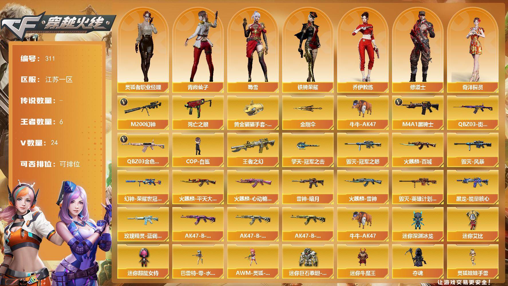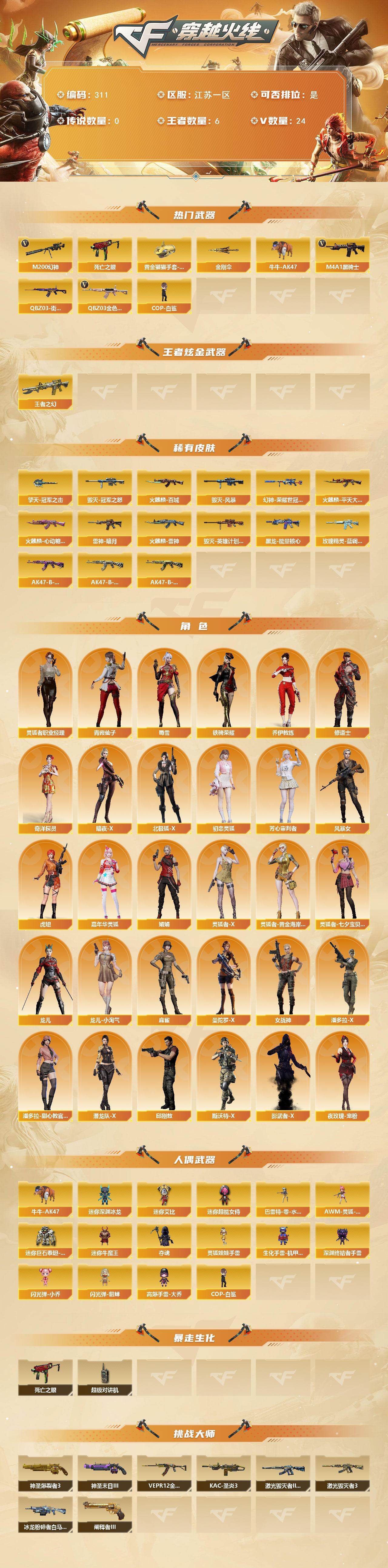 [14297915]江苏一区-24V-6王者-0炫金 【热门武器】:QBZ03-金色蔷薇,M200-幻神,死亡之眼,QBZ03-街机,牛牛-AK47,M4A1-黑骑士,COP-白鲨,黄金猫猫手套-白鲨,金刚伞 【王者炫金武器】:王者之幻 【皮肤】:M200-幻神-荣耀世冠白鲨,雷神-暗月,火麒麟-雷神,火麒麟-平天大圣,火麒麟-百城,火麒麟-心动糖果,毁灭-冠军之怒,毁灭-风暴*2,毁灭-英雄计划 皮肤,黑龙-能量核心,玫瑰精灵-蓝调梦幻 皮肤,AK47-B-常胜将军-曹操*2,AK47-B-常胜将军-刘备*2,AK47-B-常胜将军-孙权,擎天-冠军之击 【角色】:奇洋探员,乔伊教练,修道士,暗夜-X,北极狐-X,初恋灵狐,芳心审判者,风暴女,虎妞,嘉年华灵狐,娟娟,灵狐者-X,灵狐者-黄金海岸,灵狐者-七夕宝贝,灵狐者-职业经理,龙儿,龙儿-小淘气,麻雀,曼陀罗-X,女战神,潘多拉-X,潘多拉-甜心教官,潜龙队-X,邱刚敖,青霞仙子,斯沃特-X,蜀雪,铁骑荣耀,夜玫瑰-宠粉,影武者-X 【人偶武器】:COP-白鲨,巴雷特-零-水下丽影,AWM-灵狐-15周年嘉年华,牛牛-AK47,迷你深渊冰龙,迷你牛魔王,夺魂*2,生化手雷-机甲核心,深渊终结者手雷*4,闪光弹-小乔,闪光弹-貂蝉,高爆手雷-大乔,迷你艾比,迷你超能女侍,迷你巨石泰坦-魔花研究所,灵狐娃娃手雷 【暴走生化】:死亡之眼,超级对讲机 【挑战大师】:神圣爆裂者III,冰龙粉碎者-白马银枪*2,激光毁灭者III-白马银枪*2,VEPR-12-金魔,激光毁灭者III*2,KAC-圣炎切割者III,神圣爆裂者-末日III*2,阐释者III*2 【英雄级武器】:AK47-火麒麟,M4A1-雷神,M4A1-黑骑士,AK47-黑武士,AK12-天启,无影-神兵利器,M4A1-玫瑰精灵,QBZ03-金色蔷薇,王者之翼-觉醒版,AK-47-猩红传说,黑骑士-海王,AK47-B-常胜将军,Barrett-毁灭,M200-幻神,王者之决-觉醒版,屠龙,擎天,麒麟刺,高爆手雷-竞技荣光,烟雾弹-雷霆王者-觉醒版*2 【道具】:BS战队炫彩背包,CFS限定背包,炫彩背包,老虎背包,背包-洛丽塔,虎牙炫彩背包,超级背包*2,黄金曼提柯尔的背包,黄金超能特工背包,女皇终结者-魔龙之吻,救世主-黑桃战神,黄金生化钩,绿色巨人,灵魂忍者,迷雾幽灵,生