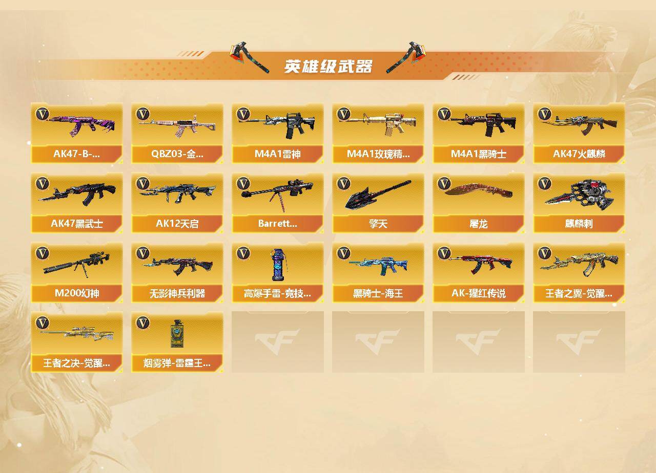 【英雄级武器】:AK47-火麒麟,M4A1-雷神,M4A1-黑骑士,AK47-黑武士,AK12-天启,无影-神兵利器,M4A1-玫瑰精灵,QBZ03-金色蔷薇,王者之翼-觉醒版,AK-47-猩红传说,黑骑士-海王,AK47-B-常胜将军,Barrett-毁灭,M200-幻神,王者之决-觉醒版,屠龙,擎天,麒麟刺,高爆手雷-竞技荣光,烟雾弹-雷霆王者-觉醒版*2
