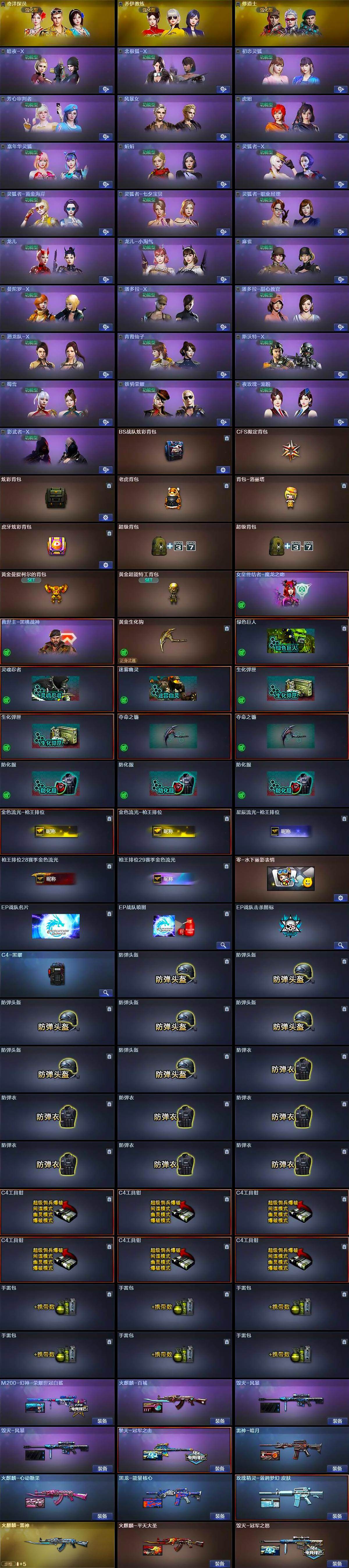 【道具】:BS战队炫彩背包,CFS限定背包,炫彩背包,老虎背包,背包-洛丽塔,虎牙炫彩背包,超级背包*2,黄金曼提柯尔的背包,黄金超能特工背包,女皇终结者-魔龙之吻,救世主-黑桃战神,黄金生化钩,绿色巨人,灵魂忍者,迷雾幽灵,生