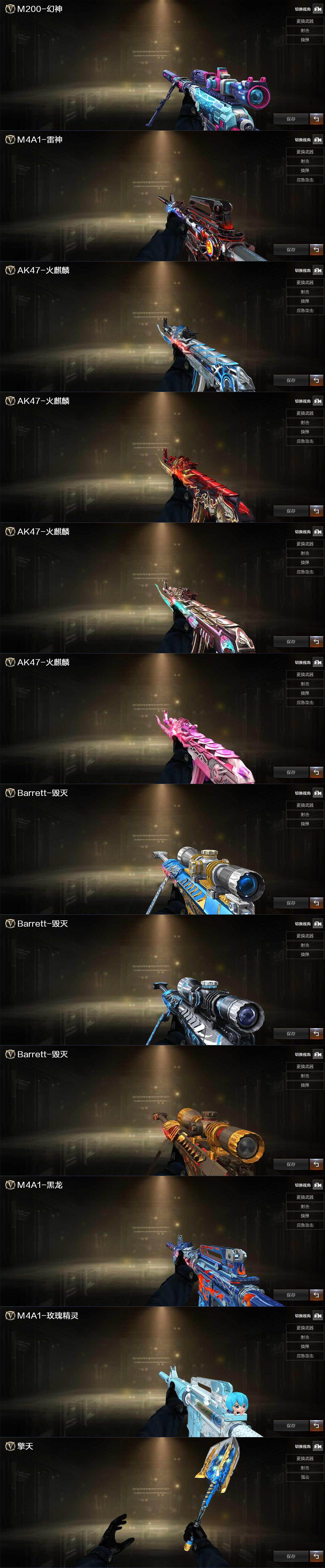 【热门武器】:QBZ03-金色蔷薇,M200-幻神,死亡之眼,QBZ03-街机,牛牛-AK47,M4A1-黑骑士,COP-白鲨,黄金猫猫手套-白鲨,金刚伞