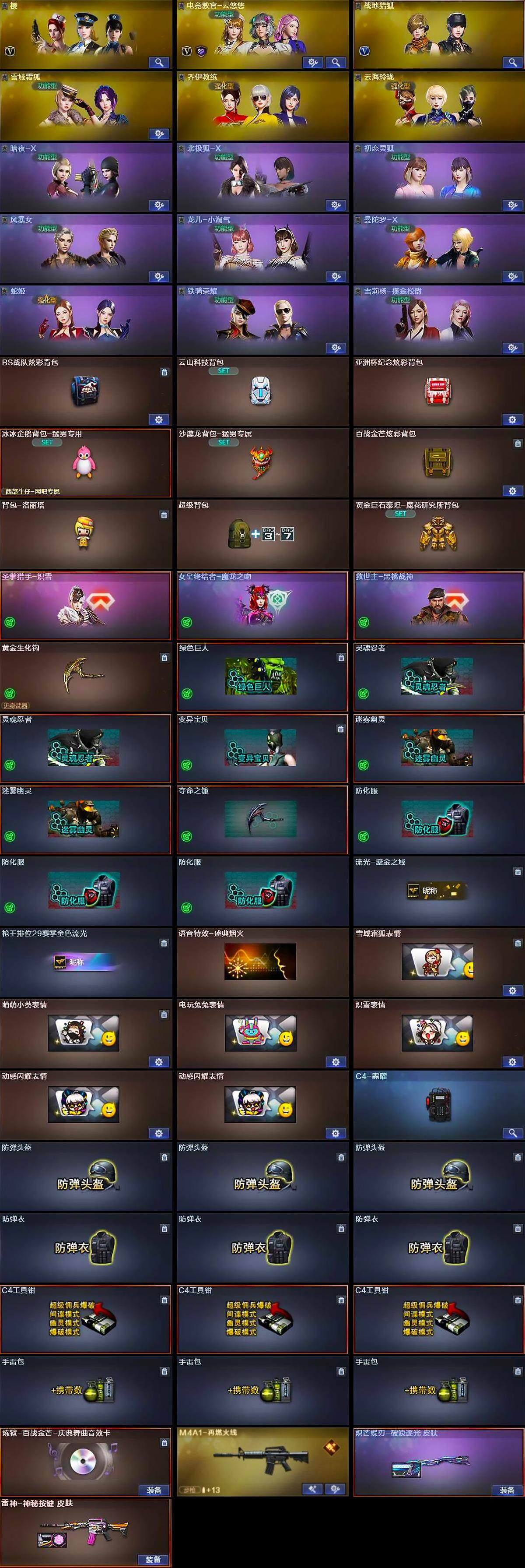 【道具】:BS战队炫彩背包,云山科技背包,亚洲杯纪念炫彩背包,冰冰企鹅背包-猛男专用,沙漠龙背包-猛男专属,百战金芒炫彩背包,背包-洛丽塔,超级背包,黄金巨石泰坦-魔花研究所背包,圣拳猎手-炽雪,女皇终结者-魔龙之吻,救世主-黑桃战神,黄金生化钩,绿色巨人,灵魂忍者*2,变异宝贝,迷雾幽灵*2,夺命之镰,防化服*3,流光-鎏金之域,枪王排位29赛季金色流光,语音特效-盛典烟火,雪域霜狐表情,萌萌小葵表情,电玩兔兔表情,炽雪表情,动感闪耀表情*2,C4-黑曜,防弹头盔*3,防弹衣*3,C4工具钳*3,手雷包*3