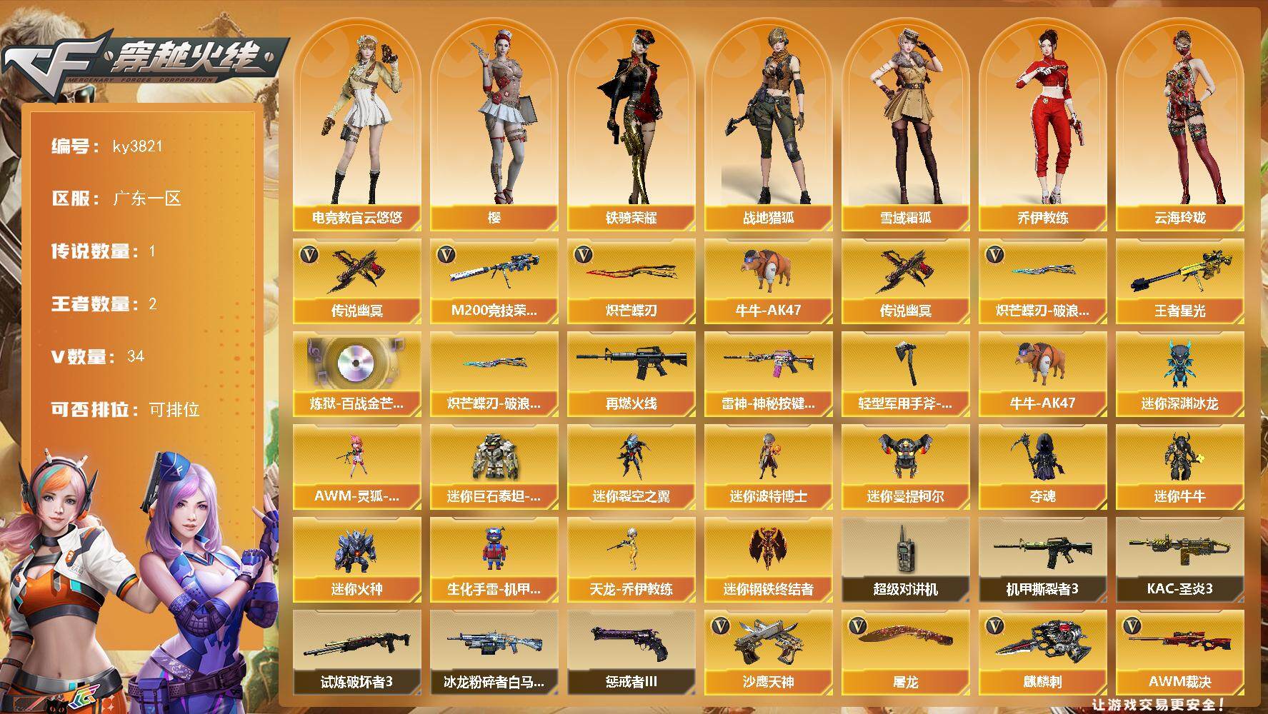 [14299318]广东一区-34V-2王者-0炫金 【传说武器】:传说幽冥 【热门武器】:传说幽冥,M200-竞技荣光,牛牛-AK47,炽芒蝶刃,炽芒蝶刃-破浪逐光 皮肤 【王者炫金武器】:王者星光 【音效卡】:炼狱-百战金芒-庆典舞曲音效卡 【皮肤】:M4A1-再燃火线,雷神-神秘按键 皮肤,轻型军用手斧-再燃火线,炽芒蝶刃-破浪逐光 皮肤 【角色】:樱,电竞教官-云悠悠,战地猎狐,雪域霜狐,乔伊教练,云海玲珑,暗夜-X,北极狐-X,初恋灵狐,风暴女,龙儿-小淘气,曼陀罗-X,蛇姬,铁骑荣耀,雪莉杨-摸金校尉 【人偶武器】:天龙-乔伊教练,迷你钢铁终结者,AWM-灵狐-15周年嘉年华*2,牛牛-AK47,迷你深渊冰龙*3,迷你裂空之翼,迷你波特博士,迷你曼提柯尔,夺魂,迷你牛牛,迷你火种,生化手雷-机甲核心*3,迷你巨石泰坦-魔花研究所 【暴走生化】:超级对讲机 【挑战大师】:冰龙粉碎者-白马银枪,机甲撕裂者III,试炼破坏者III,KAC-圣炎切割者III,惩戒者III 【英雄级武器】:AWM-裁决,M200-竞技荣光,炼狱-百战金芒,沙鹰-天神,屠龙*3,麒麟刺,擎天-竞技荣光*2,炽芒蝶刃,麒麟刺-百战金芒,高爆手雷-竞技荣光*3,闪光弹-竞技荣光*4,烟雾弹-竞技荣光*3,M4A1-赤狱骑士,M4A1-苍鸣雷神,Barrett-碧霄极光*2 【道具】:BS战队炫彩背包,云山科技背包,亚洲杯纪念炫彩背包,冰冰企鹅背包-猛男专用,沙漠龙背包-猛男专属,百战金芒炫彩背包,背包-洛丽塔,超级背包,黄金巨石泰坦-魔花研究所背包,圣拳猎手-炽雪,女皇终结者-魔龙之吻,救世主-黑桃战神,黄金生化钩,绿色巨人,灵魂忍者*2,变异宝贝,迷雾幽灵*2,夺命之镰,防化服*3,流光-鎏金之域,枪王排位29赛季金色流光,语音特效-盛典烟火,雪域霜狐表情,萌萌小葵表情,电玩兔兔表情,炽雪表情,动感闪耀表情*2,C4-黑曜,防弹头盔*3,防弹衣*3,C4工具钳*3,手雷包*3 【特殊枪械】: