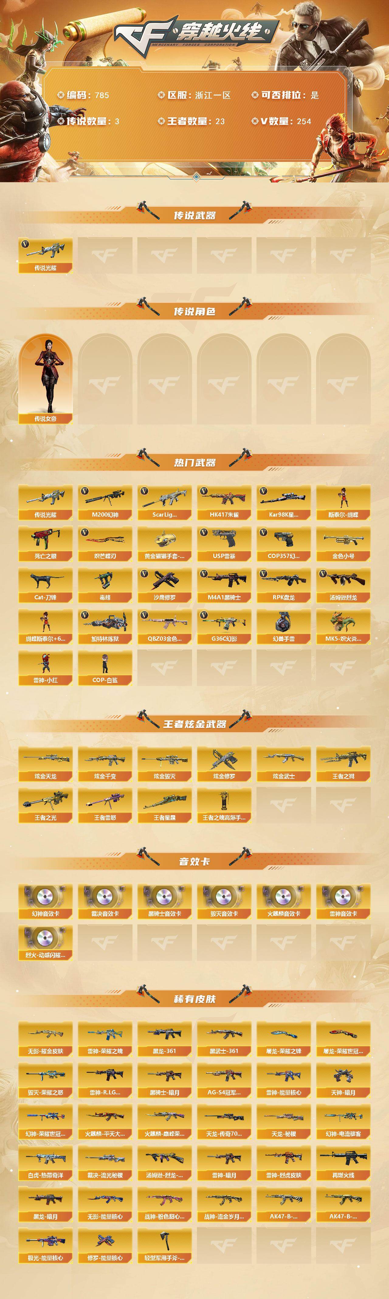 [14302718]浙江一区-254V-23王者-10炫金 【传说武器】:传说光耀*2 【传说角色】:传说女帝 【热门武器】:传说光耀*2,G36C-幻影,QBZ03-金色蔷薇,Scar Light-白虎,HK417-朱雀,M200-幻神,死亡之眼,Kar98K-星神,金色小号,Cat-刀锋,毒蜂,M4A1-黑骑士*6,汤姆逊-烈龙*6,RPK-盘龙*5,加特林-炼狱*7,斯泰尔-蝴蝶,MK5-炽火炎龙,雷神-小红,COP-白鲨,USP-雷暴*2,COP 357-幻灵,沙鹰-修罗*6,炽芒蝶刃,黄金猫猫手套-白鲨,高爆手雷-幻兽*7 【王者炫金武器】:王者之戮,王者之光*2,王者雷怒,王者星霆,炫金千变,炫金武士,炫金毁灭*5,炫金天龙,炫金修罗*2,王者之魄高爆手雷 【音效卡】:烈火-动感闪耀 音效卡,M200-幻神音效卡,AK47-火麒麟音效卡,M4A1-雷神音效卡,M4A1-黑骑士音效卡,Barrett-毁灭音效卡,AWM-裁决音效卡 【皮肤】:M200-幻神-荣耀世冠白鲨,幻神-电流骇客 皮肤,白虎-热带奇洋 皮肤,裁决-流光秘银,汤姆逊-烈龙-末日皮肤*2,雷神-暗月,雷神-能量核心,雷神-荣耀之魄,雷神-R.LGD-CFPLS18冠军,雷神-烈虎皮肤,M4A1-再燃火线,火麒麟-平天大圣*2,火麒麟-巅峰荣耀,毁灭-荣耀之怒,黑龙-暗月,M4A1-黑龙-361,黑骑士-暗月,黑骑士-AG-S4冠军典藏,无影-能量核心,无影耀金皮肤,AK47-黑武士-361,超新星-深海萌鲨 皮肤,战神-粉色甜心皮肤,战神-流金岁月皮肤,AK47-B-常胜将军-刘备,AK47-B-常胜将军-孙权*2,天龙-秘银*2,AWM-天龙-传奇70KG,极光-能量核心,修罗-能量核心,天神-暗月,屠龙-荣耀之锋,屠龙-荣耀世冠AG,轻型军用手斧-再燃火线 【角色】:零,蝴蝶,魅影,炫,凌霄,影豹,战地猎狐,王者-零,王者之瞳,王者玲珑-小乔,奇洋探员,乔伊教练,修道士,云海玲珑,飞虎队-X,风暴女,虎妞,嘉年华灵狐,灵狐者-黄金海岸,铁骑荣耀,影武者-X,雅典娜 【人偶武器】:雷神-小红,COP-白鲨,火麒麟-灵狐,MK5-炽火炎龙,斯泰尔-蝴蝶,AWM-灵狐-15周年嘉年华,COP-旗袍,Cat-刀锋,M4A1-刀锋,迷你深渊冰龙,迷你裂空之翼*5,夺魂,迷你牛牛,迷你生化手雷*3,生化手雷-机甲
