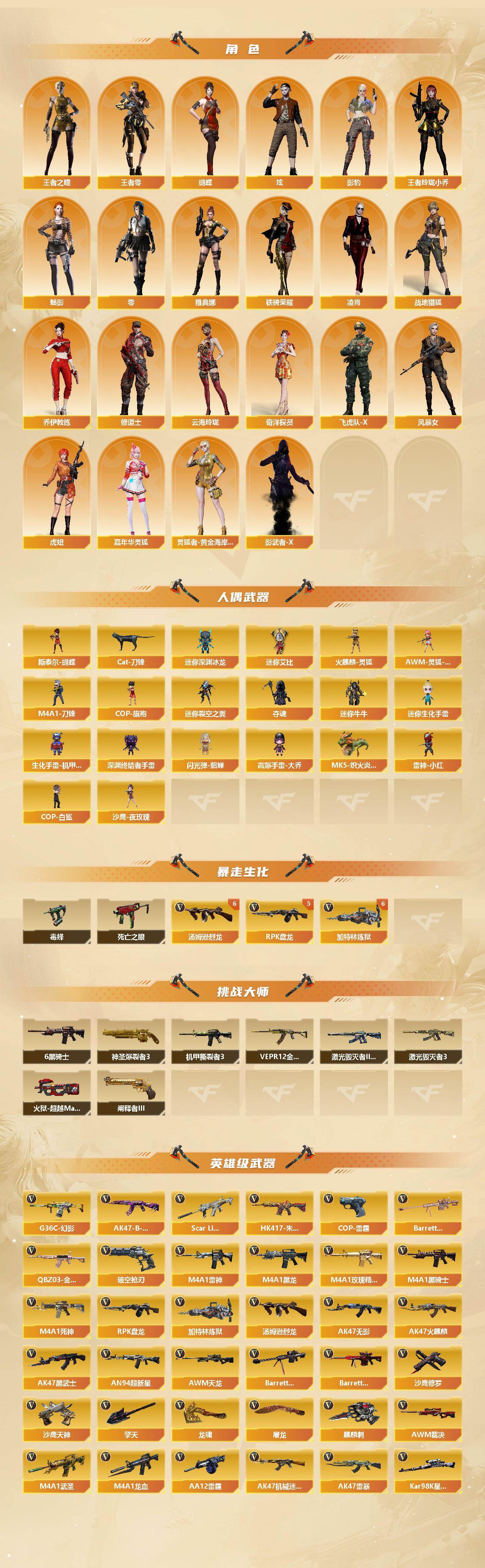 【人偶武器】:雷神-小红,COP-白鲨,火麒麟-灵狐,MK5-炽火炎龙,斯泰尔-蝴蝶,AWM-灵狐-15周年嘉年华,COP-旗袍,Cat-刀锋,M4A1-刀锋,迷你深渊冰龙,迷你裂空之翼*5,夺魂,迷你牛牛,迷你生化手雷*3,生化手雷-机甲