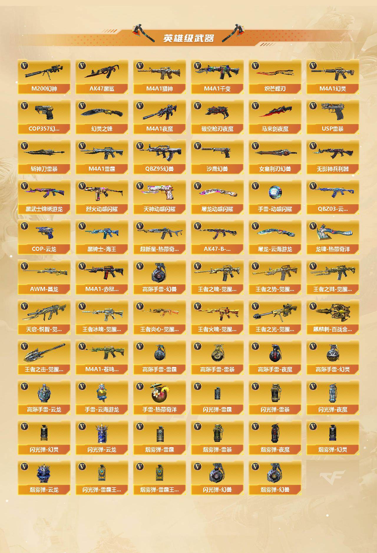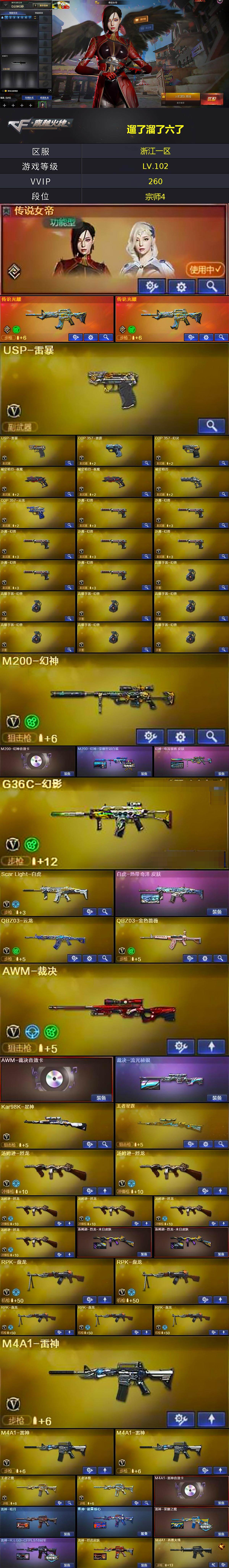 【热门武器】:传说光耀*2,G36C-幻影,QBZ03-金色蔷薇,Scar Light-白虎,HK417-朱雀,M200-幻神,死亡之眼,Kar98K-星神,金色小号,Cat-刀锋,毒蜂,M4A1-黑骑士*6,汤姆逊-烈龙*6,RPK-盘龙*5,加特林-炼狱*7,斯泰尔-蝴蝶,MK5-炽火炎龙,雷神-小红,COP-白鲨,USP-雷暴*2,COP 357-幻灵,沙鹰-修罗*6,炽芒蝶刃,黄金猫猫手套-白鲨,高爆手雷-幻兽*7