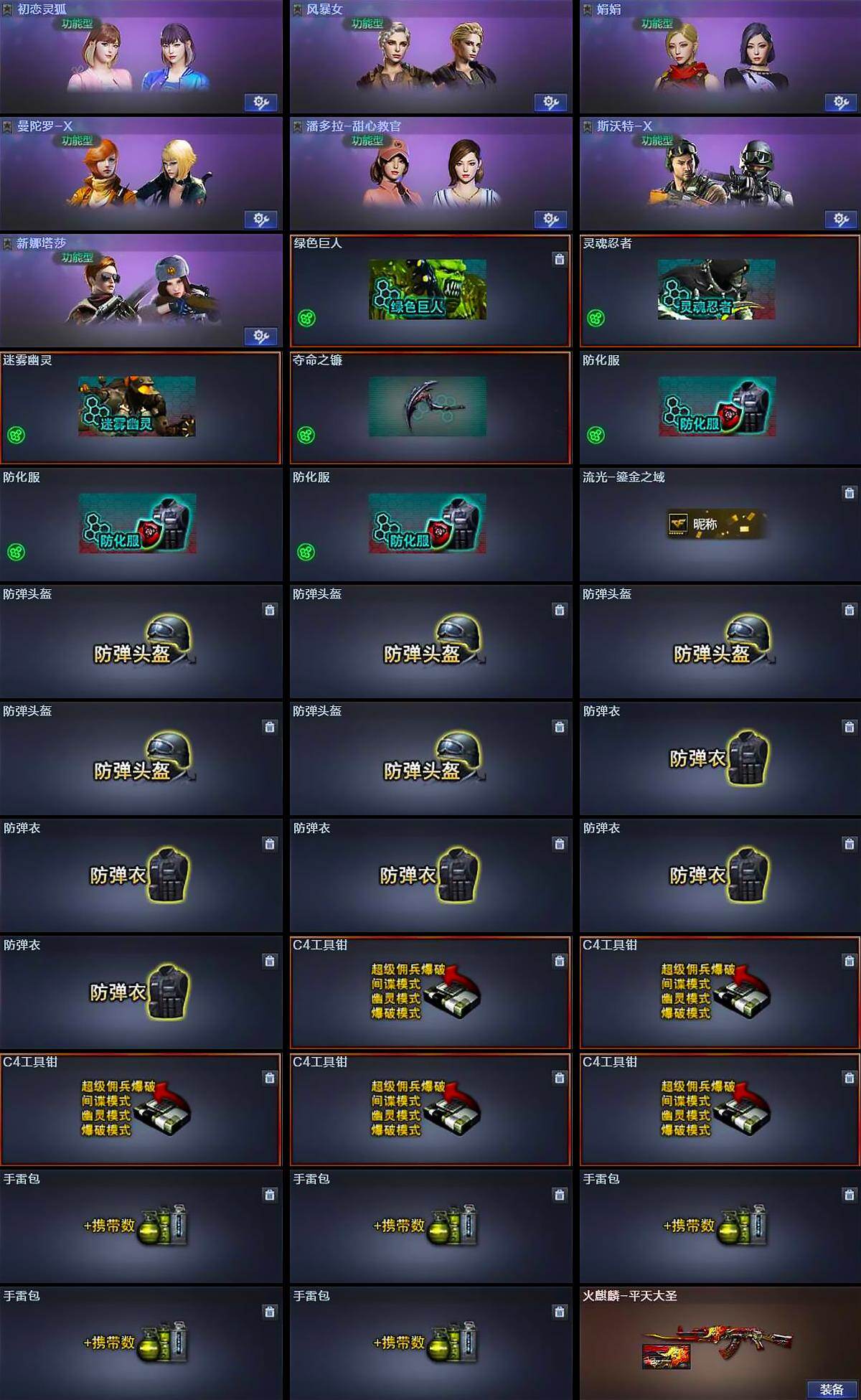 【道具】:绿色巨人,灵魂忍者,迷雾幽灵,夺命之镰,防化服*3,流光-鎏金之域,防弹头盔*5,防弹衣*5,C4工具钳*5,手雷包*5
