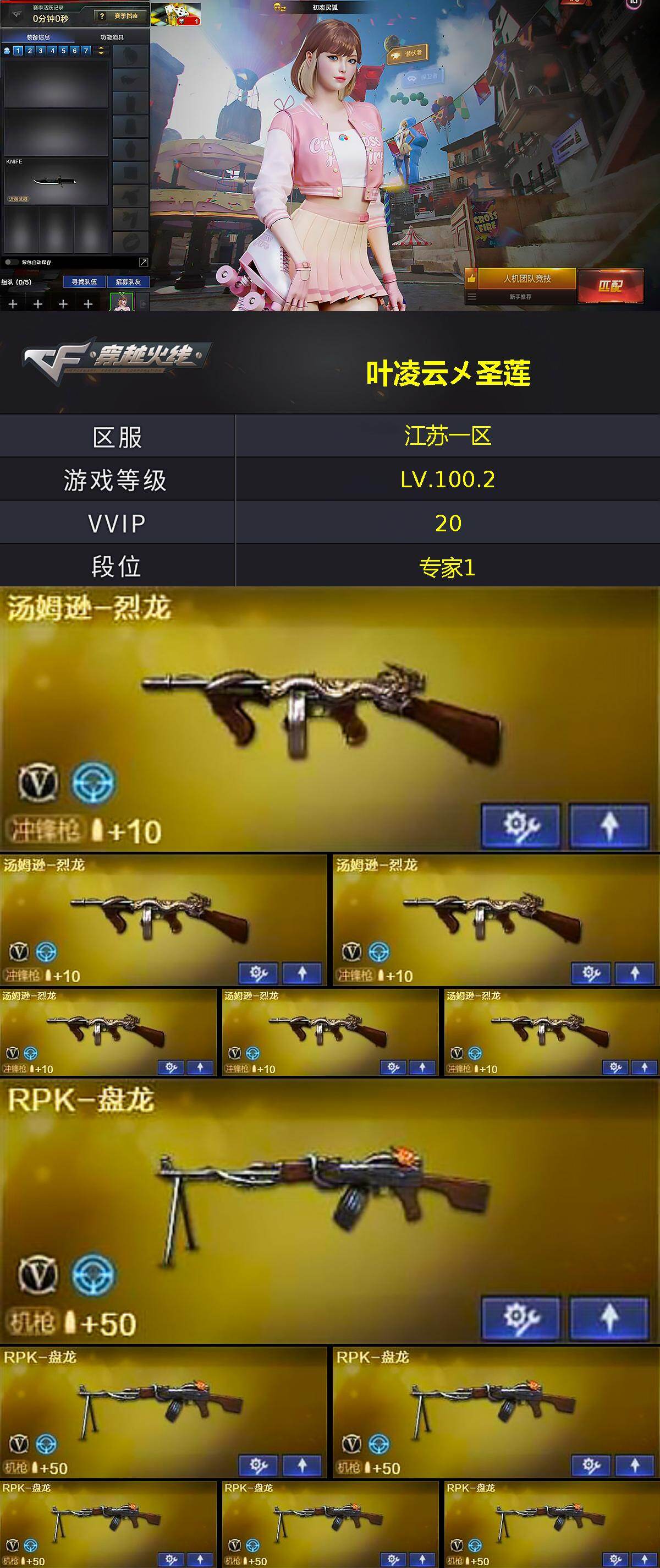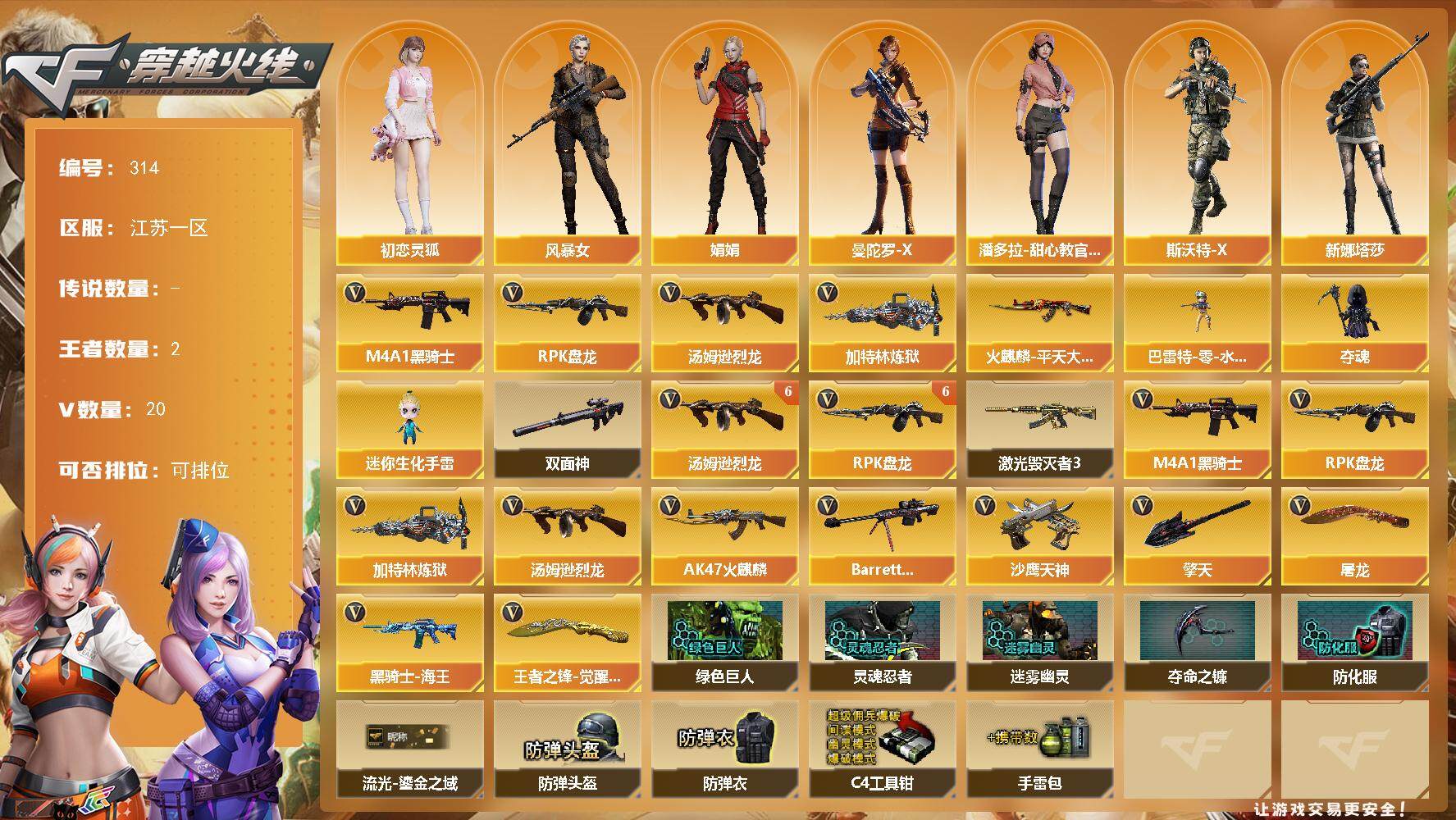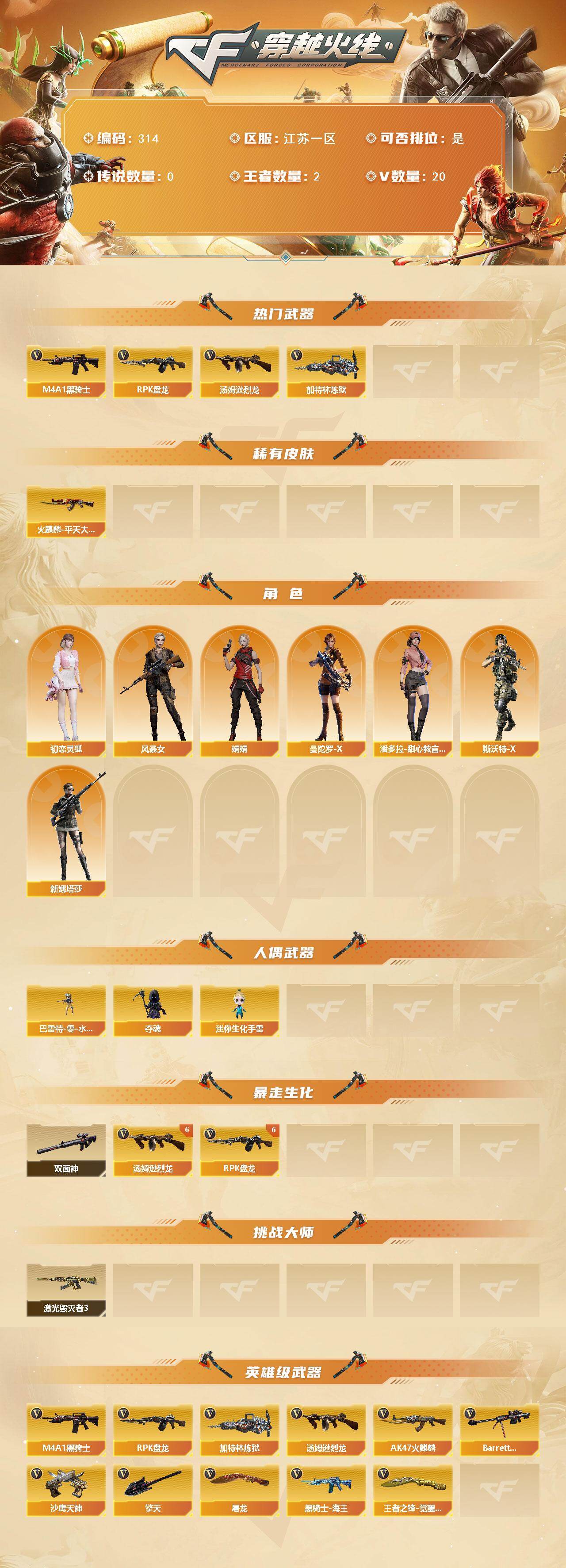 [14304375]江苏一区-20V-2王者-0炫金 【热门武器】:M4A1-黑骑士,汤姆逊-烈龙*6,RPK-盘龙*6,加特林-炼狱 【皮肤】:火麒麟-平天大圣 【角色】:初恋灵狐,风暴女,娟娟,曼陀罗-X,潘多拉-甜心教官,斯沃特-X,新娜塔莎 【人偶武器】:巴雷特-零-水下丽影,夺魂,迷你生化手雷 【暴走生化】:双面神 【挑战大师】:激光毁灭者III 【英雄级武器】:AK47-火麒麟,M4A1-黑骑士,黑骑士-海王,Barrett-毁灭,RPK-盘龙*6,加特林-炼狱,汤姆逊-烈龙*6,沙鹰-天神,屠龙,擎天,王者之锋-觉醒版*2 【道具】:绿色巨人,灵魂忍者,迷雾幽灵,夺命之镰,防化服*3,流光-鎏金之域,防弹头盔*5,防弹衣*5,C4工具钳*5,手雷包*5 【特殊枪械】:1黑骑士,6烈龙,6盘龙,1炼狱