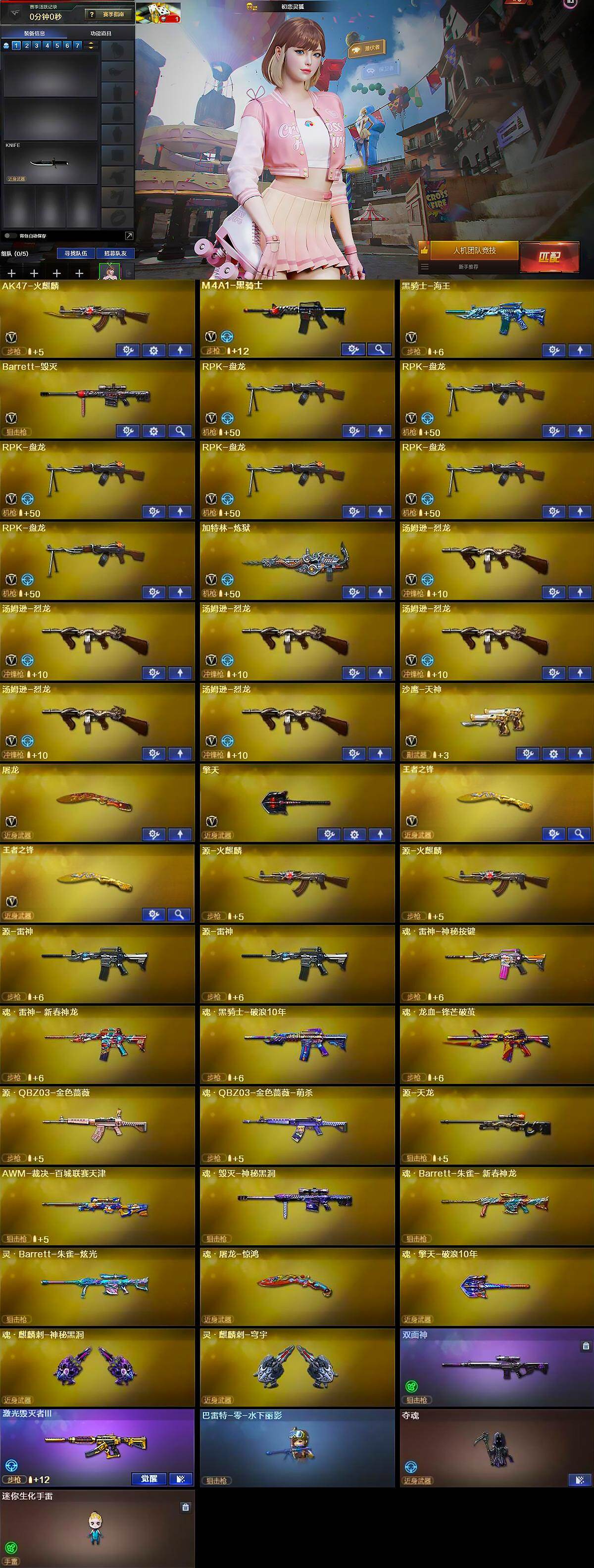 【英雄级武器】:AK47-火麒麟,M4A1-黑骑士,黑骑士-海王,Barrett-毁灭,RPK-盘龙*6,加特林-炼狱,汤姆逊-烈龙*6,沙鹰-天神,屠龙,擎天,王者之锋-觉醒版*2