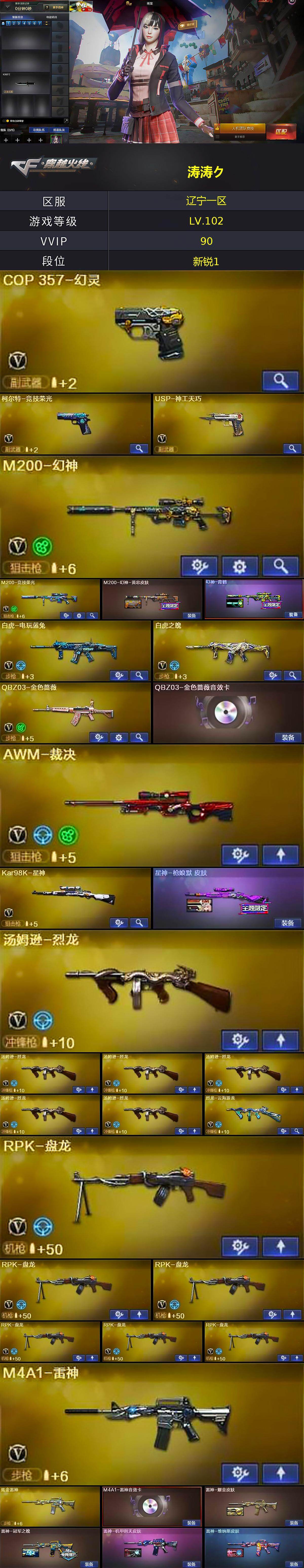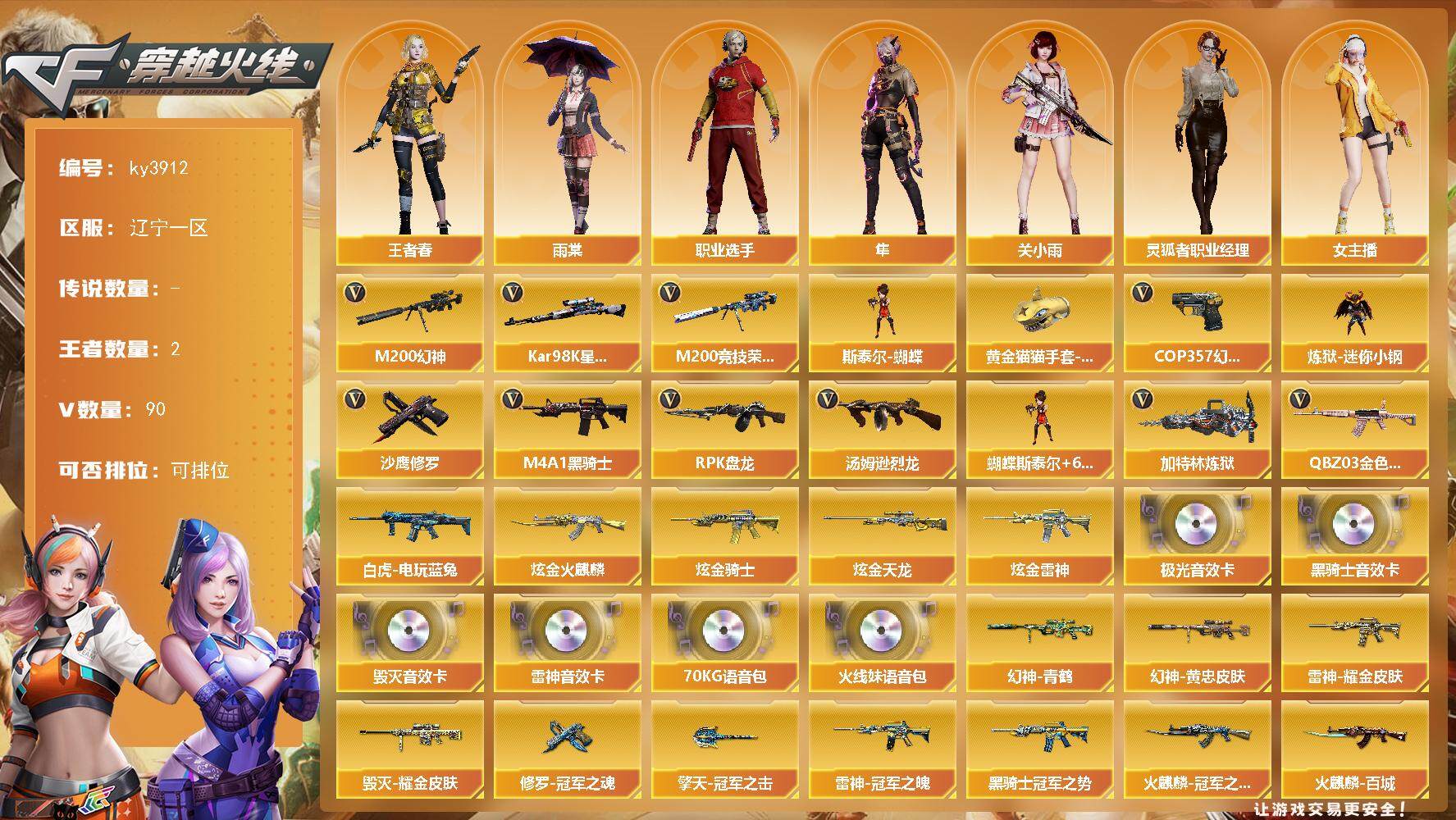 [14305239]辽宁一区-90V-2王者-4炫金 【热门武器】:QBZ03-金色蔷薇,M200-幻神,M200-竞技荣光,白虎-电玩蓝兔,Kar98K-星神,炼狱-迷你小钢,M4A1-黑骑士*3,汤姆逊-烈龙*6,RPK-盘龙*6,加特林-炼狱*2,斯泰尔-蝴蝶,COP 357-幻灵,沙鹰-修罗*5,黄金猫猫手套-白鲨 【王者炫金武器】:炫金火麒麟,炫金骑士,炫金雷神,炫金天龙 【音效卡】:M4A1-雷神音效卡,M4A1-黑骑士音效卡,Barrett-毁灭音效卡,Barrett-极光音效卡,70KG语音包,火线妹语音包 【皮肤】:M200-幻神-黄忠皮肤,幻神-青鹤,星神-枪娘默 皮肤,雷神-耀金皮肤,雷神-冠军之魄,雷神-机甲刑天皮肤,雷神-维纳斯皮肤,火麒麟-雷神,火麒麟-冠军之心,火麒麟-百城,火麒麟-心动糖果,毁灭耀金皮肤,M4A1-千变-孔明皮肤,黑龙-能量核心,黑骑士-冠军之势,战神-粉色甜心皮肤*2,战神-紫绶金章皮肤,战神-流金岁月皮肤,极光-能量核心,修罗-冠军之魂,擎天-冠军之击 【角色】:雨棠,关小雨,隼,王者春,乔伊教练,云海玲珑,暗夜-X,电竞少女,芳心审判者,虎妞,嘉年华灵狐,娟娟,灵狐-花神,灵狐者-X,灵狐者-职业经理,龙儿,曼陀罗-礼服,女主播,潘多拉-X,潘多拉-甜心教官,潜龙队-X,斯沃特-X,蜀雪,铁骑荣耀,新娜塔莎,夜玫瑰-幻能朋克,樱-战斗天使,职业选手 【人偶武器】:火麒麟-灵狐,炼狱-迷你小钢,斯泰尔-蝴蝶,斯泰尔-枪娘暗刃,AWM-灵狐-15周年嘉年华,黄金迷你深渊冰龙,迷你牛魔王,迷你生化手雷*2,生化手雷-机甲核心,闪光弹-小乔,迷你超能女侍,AK12-夜玫瑰 【暴走生化】:双面神,超级对讲机 【挑战大师】:神圣爆裂者III,AK47-冰龙粉碎者,冰龙粉碎者-白马银枪,激光毁灭者III-白马银枪,VEPR-12-金魔,激光毁灭者III 【英雄级武器】:M4A1-千变,AK47-火麒麟*2,M4A1-黑龙*3,M4A1-雷神,M4A1-黑骑士*3,AK47-黑武士,AN94-超新星,AK47-黑鲨,QBZ03-天罚,M4A1-神工天巧,无影-神兵利器,QBZ03-金色蔷薇,烈火-动感闪耀,AK-47-猩红传说*2,AK47-B-战神,白虎-电玩蓝兔,白虎之魄-觉醒版,AWM-天龙*2,Barrett-毁灭*2,Barrett-极