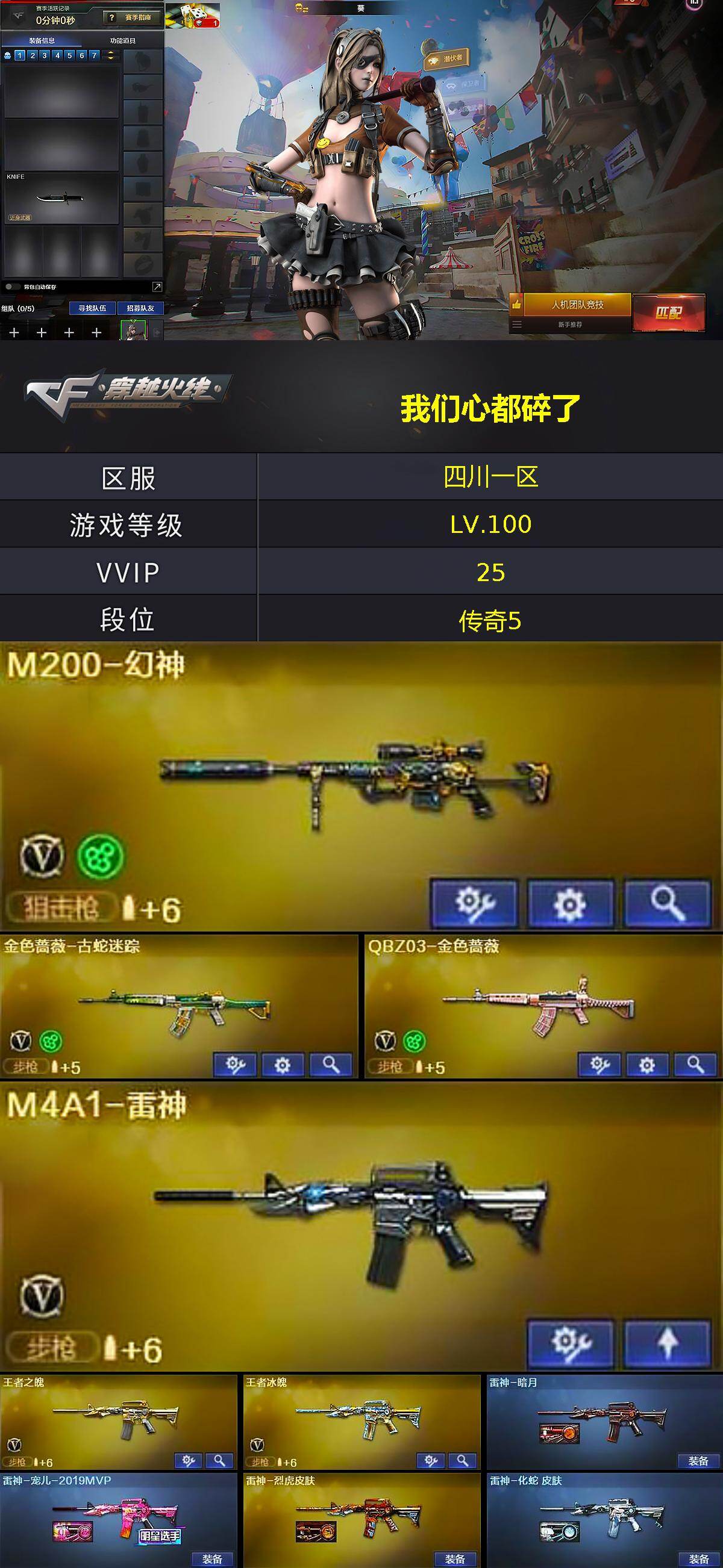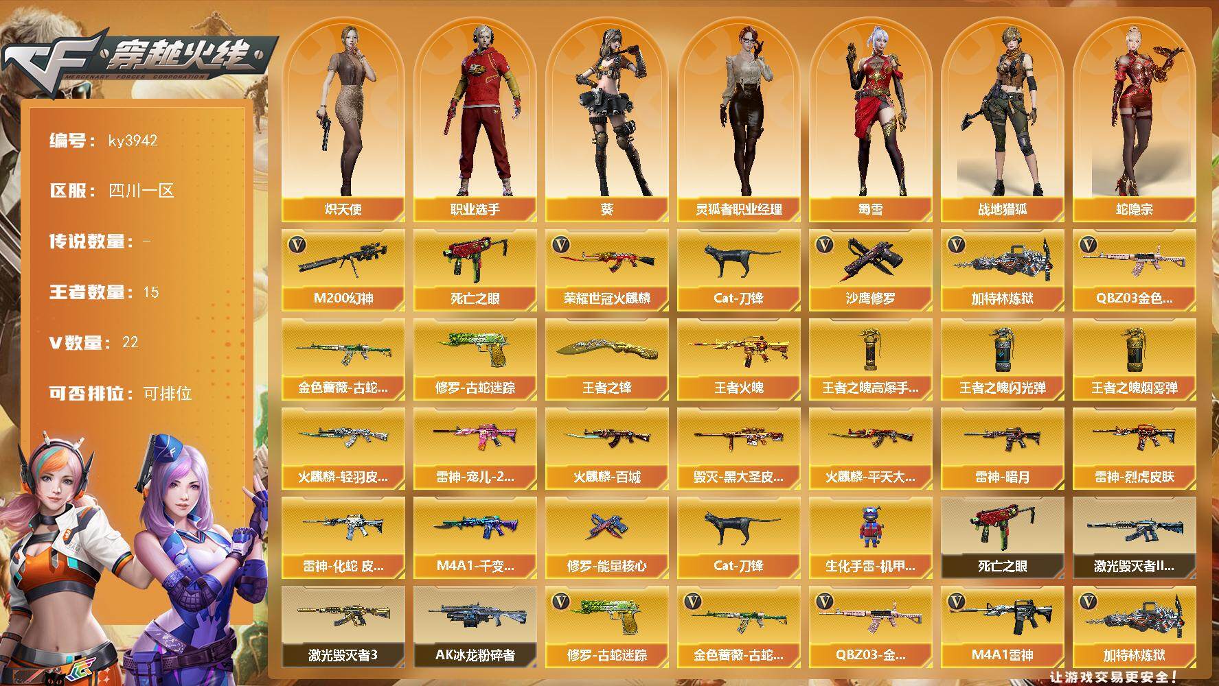 [14305600]四川一区-22V-15王者-0炫金 【热门武器】:QBZ03-金色蔷薇,M200-幻神,金色蔷薇-古蛇迷踪,修罗-古蛇迷踪,死亡之眼,荣耀世冠-火麒麟,Cat-刀锋,加特林-炼狱*2,沙鹰-修罗*2 【王者炫金武器】:王者火魄,王者之锋,王者之魄高爆手雷*4,王者之魄闪光弹*4,王者之魄烟雾弹 【皮肤】:雷神-暗月,雷神-宠儿-2019MVP,雷神-烈虎皮肤,雷神-化蛇 皮肤,火麒麟-轻羽皮肤,火麒麟-平天大圣,火麒麟-百城,毁灭-黑大圣皮肤,M4A1-千变-孔明皮肤,修罗-能量核心 【角色】:葵,战地猎狐,蛇隐宗,炽天使,暗夜-X,电竞少女,飞虎队-X,娟娟,0号玩家,灵狐-花神,灵狐者-黄金海岸,灵狐者-七夕宝贝,灵狐者-职业经理,麻雀,萌儿,潘多拉-甜心教官,蛇姬,斯沃特-X,蜀雪,兔囡囡,雪莉杨-摸金校尉,职业选手 【人偶武器】:Cat-刀锋,生化手雷-机甲核心*2 【暴走生化】:死亡之眼 【挑战大师】:AK47-冰龙粉碎者,激光毁灭者III-白马银枪,激光毁灭者III 【英雄级武器】:M4A1-雷神,AN94-超新星,黑武士-锦绣游龙,金色蔷薇-古蛇迷踪,QBZ03-金色蔷薇,王者之心-觉醒版,王者之魄-觉醒版,王者冰魄-觉醒版,荣耀世冠-火麒麟,Barrett-毁灭,M200-幻神,加特林-炼狱*2,沙鹰-修罗*2,修罗-古蛇迷踪,屠龙,王者之锋-觉醒版,高爆手雷-幻灵*2,高爆手雷-竞技荣光,高爆手雷-古蛇迷踪,闪光弹-幻灵,闪光弹-竞技荣光,闪光弹-云龙,烟雾弹-幻灵,烟雾弹-竞技荣光,烟雾弹-古蛇迷踪,M4A1-赤狱骑士,AWM-昌龙 【道具】:CFS限定背包,XROCK炫彩背包,古蛇迷踪炫彩背包,超级背包,救世主-黑桃战神,绿色巨人,灵魂忍者,迷雾幽灵,夺命之镰,防化服*2,星辰流光-枪王排位,流光-再燃火线,枪王排位28赛季金色流光,枪王排位29赛季金色流光,古蛇迷踪打击特效,蛇隐宗表情,EP战队名片,EP战队喷图,EP战队击杀图标,防弹头盔*4,防弹衣*4,C4工具钳*4,手雷包*4 【特殊枪械】:2炼狱