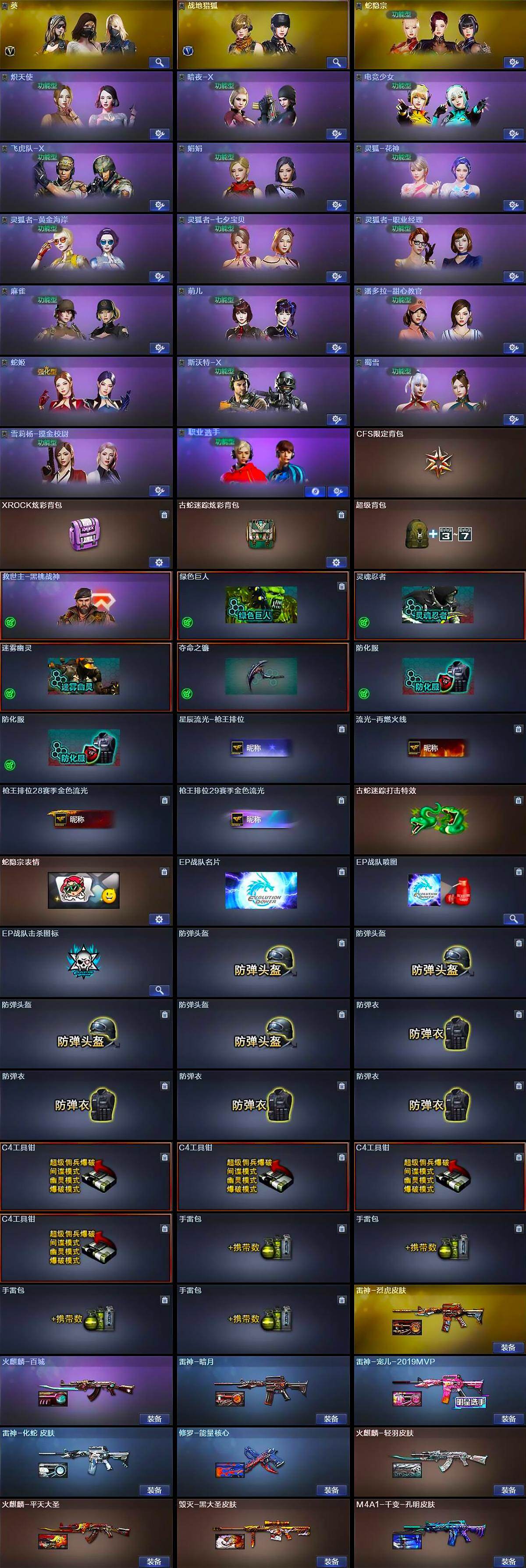 【道具】:CFS限定背包,XROCK炫彩背包,古蛇迷踪炫彩背包,超级背包,救世主-黑桃战神,绿色巨人,灵魂忍者,迷雾幽灵,夺命之镰,防化服*2,星辰流光-枪王排位,流光-再燃火线,枪王排位28赛季金色流光,枪王排位29赛季金色流光,古蛇迷踪打击特效,蛇隐宗表情,EP战队名片,EP战队喷图,EP战队击杀图标,防弹头盔*4,防弹衣*4,C4工具钳*4,手雷包*4