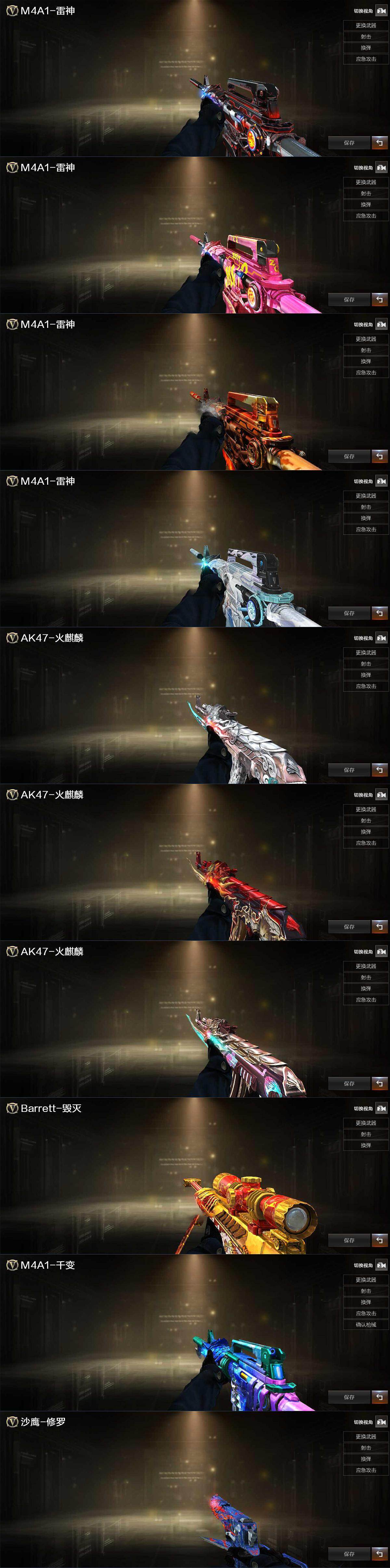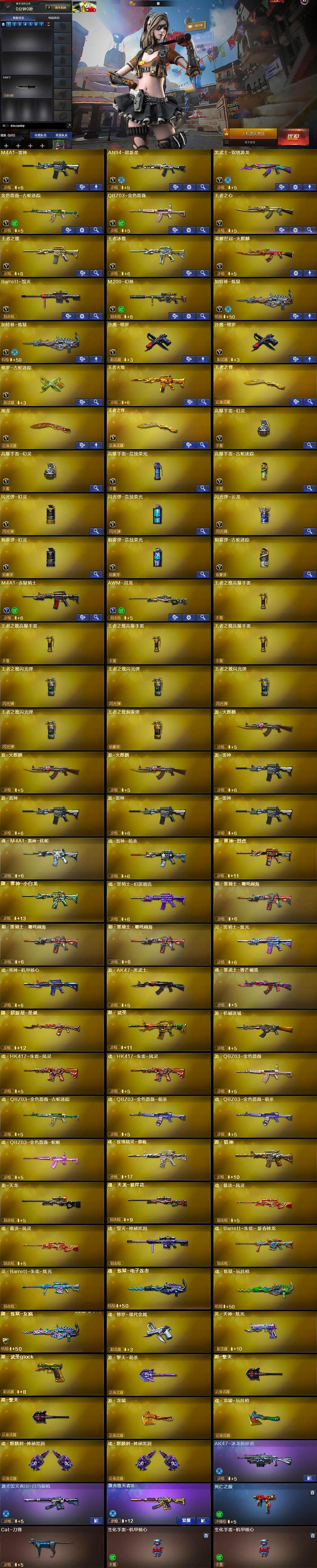【英雄级武器】:M4A1-雷神,AN94-超新星,黑武士-锦绣游龙,金色蔷薇-古蛇迷踪,QBZ03-金色蔷薇,王者之心-觉醒版,王者之魄-觉醒版,王者冰魄-觉醒版,荣耀世冠-火麒麟,Barrett-毁灭,M200-幻神,加特林-炼狱*2,沙鹰-修罗*2,修罗-古蛇迷踪,屠龙,王者之锋-觉醒版,高爆手雷-幻灵*2,高爆手雷-竞技荣光,高爆手雷-古蛇迷踪,闪光弹-幻灵,闪光弹-竞技荣光,闪光弹-云龙,烟雾弹-幻灵,烟雾弹-竞技荣光,烟雾弹-古蛇迷踪,M4A1-赤狱骑士,AWM-昌龙