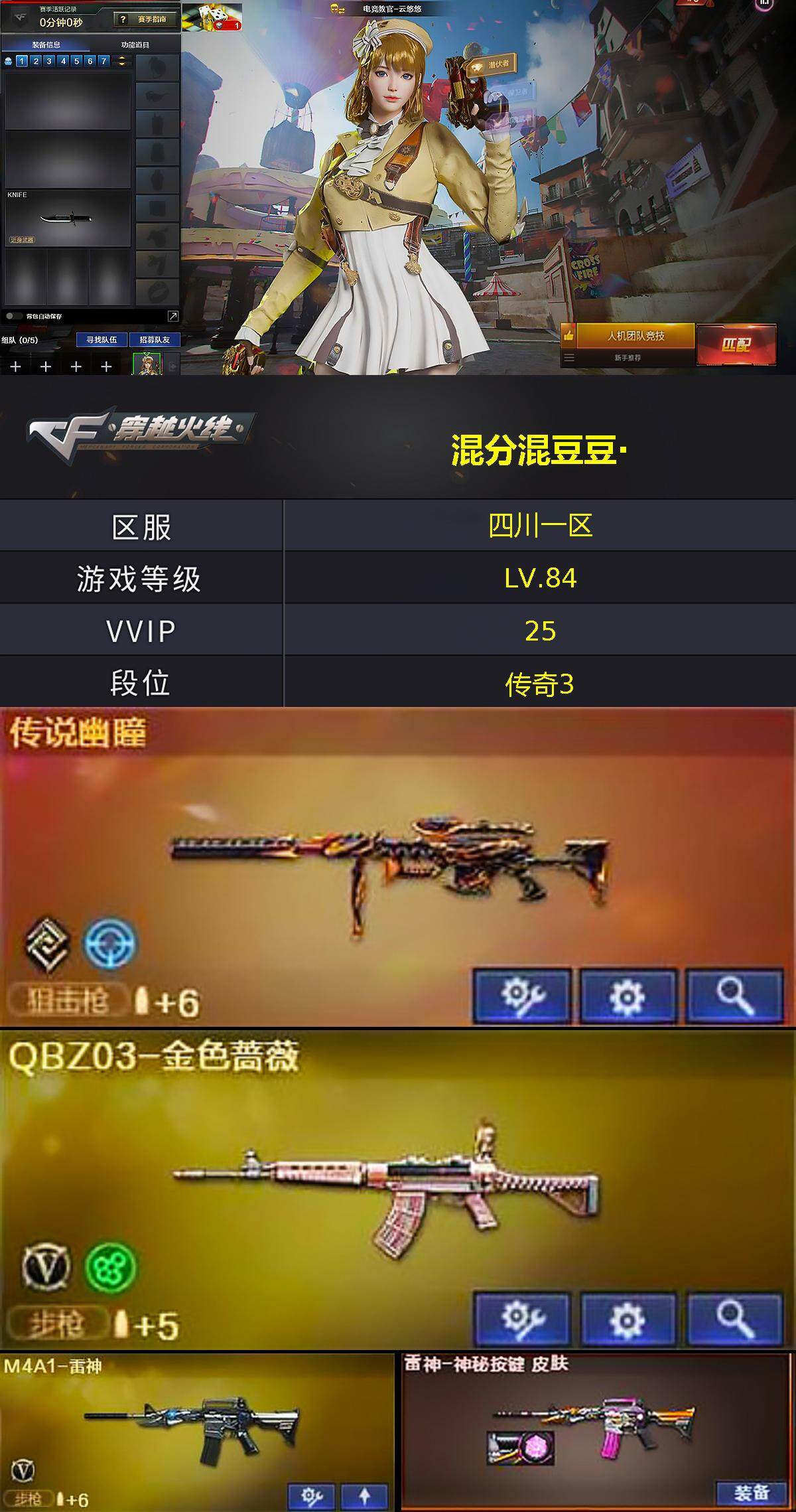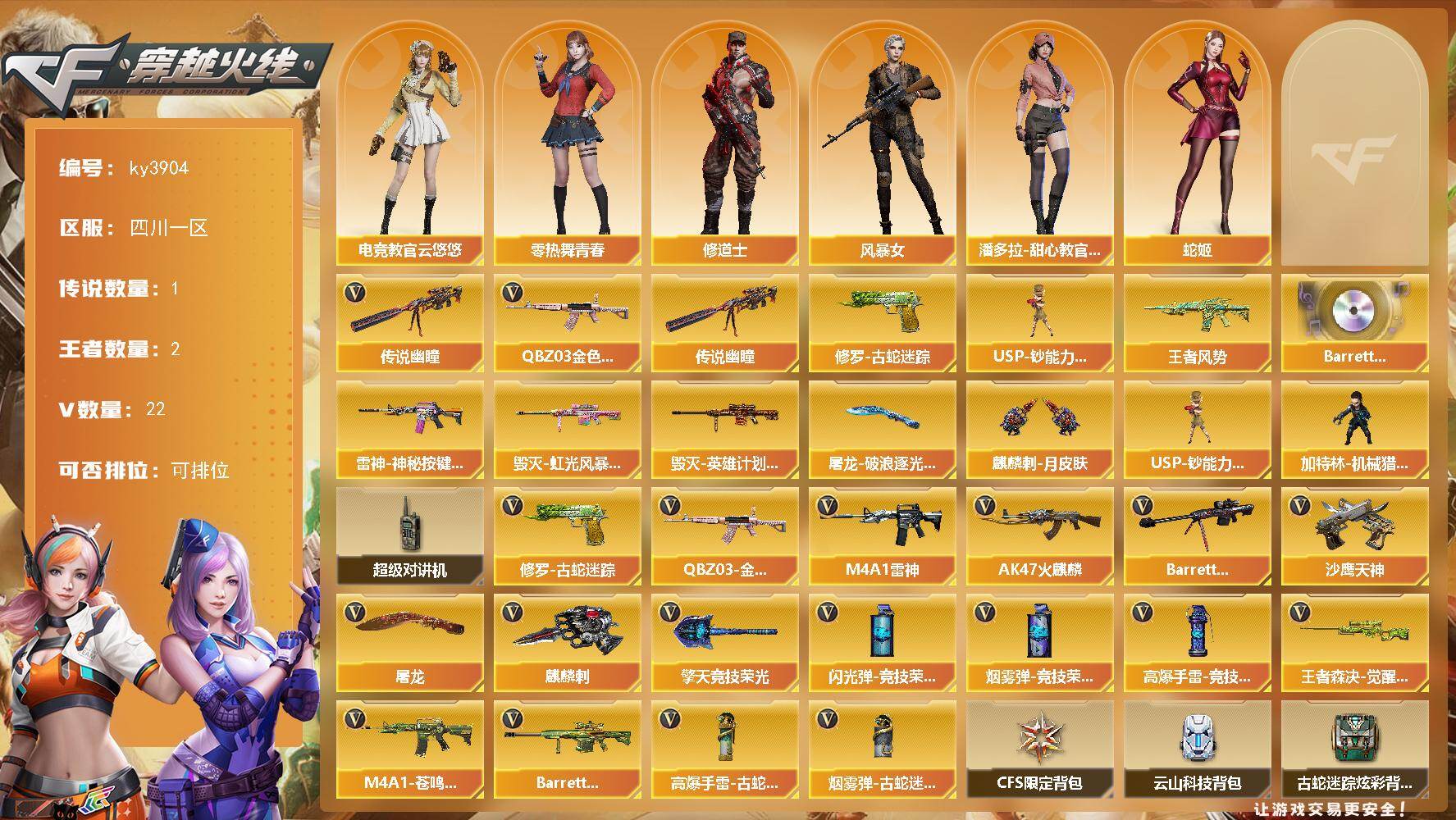 [14305869]四川一区-22V-2王者-0炫金 【传说武器】:传说幽瞳 【热门武器】:传说幽瞳,QBZ03-金色蔷薇,修罗-古蛇迷踪,USP-钞能力灵狐 【王者炫金武器】:王者风势 【音效卡】:Barrett-碧霄极光音效卡 【皮肤】:雷神-神秘按键 皮肤,毁灭-虹光风暴 皮肤,毁灭-英雄计划 皮肤,屠龙-破浪逐光 皮肤,麒麟刺-月皮肤 【角色】:电竞教官-云悠悠,修道士,风暴女,零-热舞青春,潘多拉-甜心教官,蛇姬 【人偶武器】:加特林-机械猎手,USP-钞能力灵狐 【暴走生化】:超级对讲机 【英雄级武器】:AK47-火麒麟,M4A1-雷神,QBZ03-金色蔷薇,Barrett-毁灭,王者森决-觉醒版,沙鹰-天神*2,修罗-古蛇迷踪,屠龙,麒麟刺,擎天-竞技荣光,高爆手雷-竞技荣光*2,高爆手雷-古蛇迷踪,闪光弹-竞技荣光*4,烟雾弹-竞技荣光*3,烟雾弹-古蛇迷踪,M4A1-苍鸣雷神,Barrett-碧霄极光 【道具】:CFS限定背包,云山科技背包,古蛇迷踪炫彩背包,超级背包,女皇终结者-魔龙之吻,救世主-黑桃战神,绿色巨人,灵魂忍者,迷雾幽灵,夺命之镰,防化服*3,枪王排位28赛季金色流光,枪王排位29赛季金色流光,古蛇迷踪打击特效,蛇隐宗表情,动感闪耀表情,EP战队名片,EP战队喷图,EP战队击杀图标,防弹头盔*3,防弹衣*3,C4工具钳*3,手雷包*3 【特殊枪械】:
