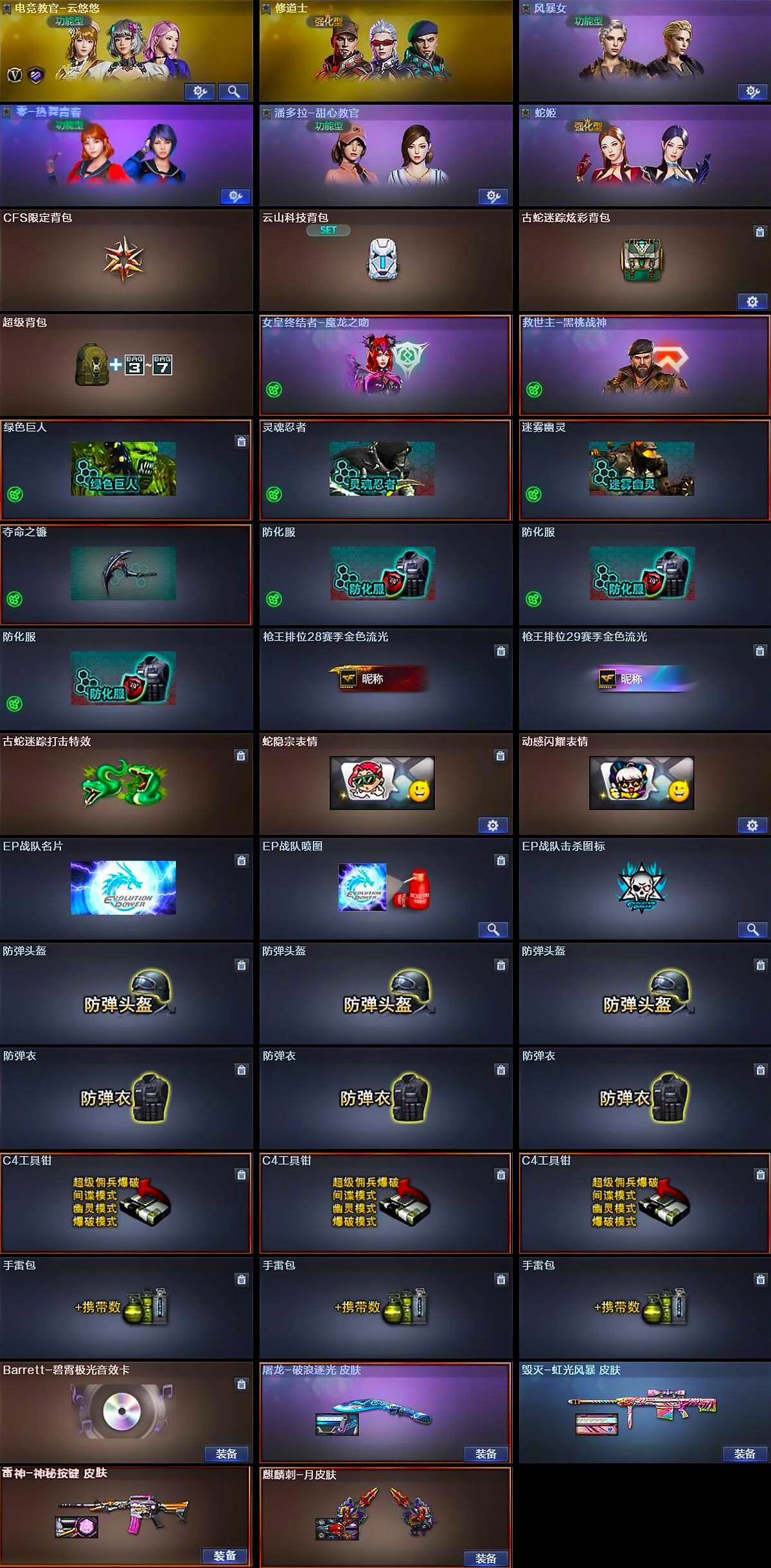 【道具】:CFS限定背包,云山科技背包,古蛇迷踪炫彩背包,超级背包,女皇终结者-魔龙之吻,救世主-黑桃战神,绿色巨人,灵魂忍者,迷雾幽灵,夺命之镰,防化服*3,枪王排位28赛季金色流光,枪王排位29赛季金色流光,古蛇迷踪打击特效,蛇隐宗表情,动感闪耀表情,EP战队名片,EP战队喷图,EP战队击杀图标,防弹头盔*3,防弹衣*3,C4工具钳*3,手雷包*3