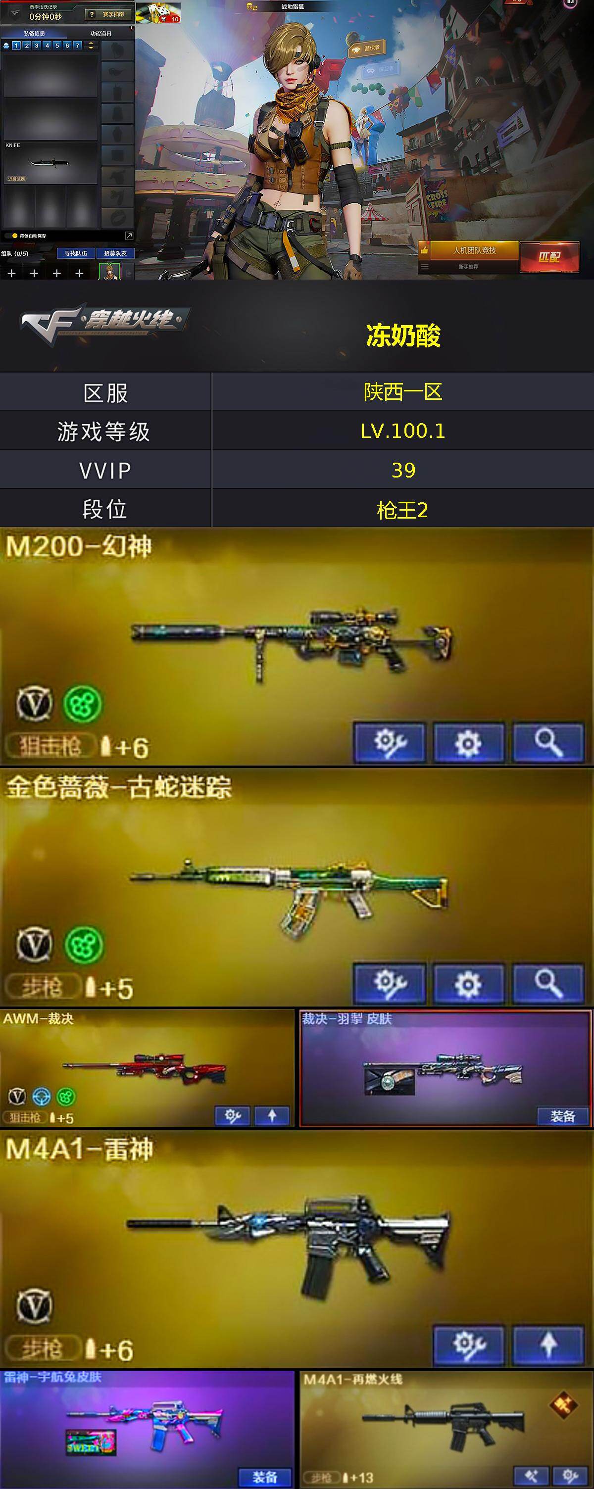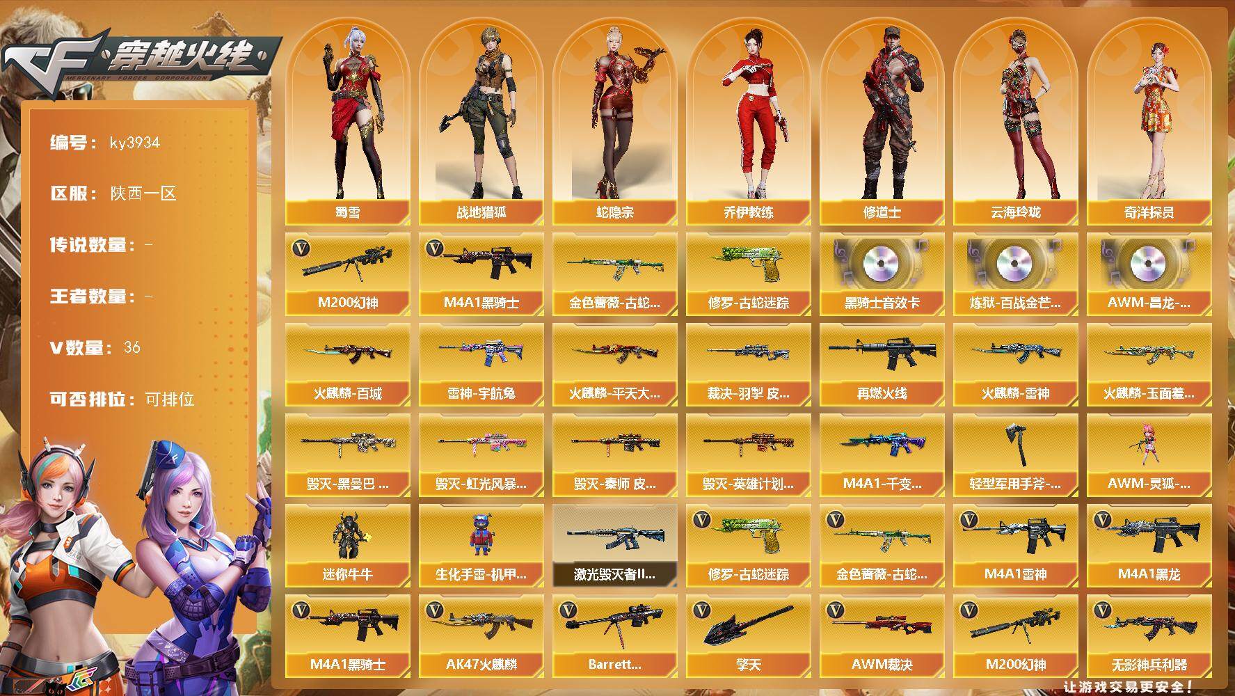 [14306247]陕西一区-36V-0王者-0炫金 【热门武器】:M200-幻神,金色蔷薇-古蛇迷踪,修罗-古蛇迷踪,M4A1-黑骑士 【音效卡】:M4A1-黑骑士音效卡,炼狱-百战金芒-庆典舞曲音效卡,AWM-昌龙-怀旧音效卡 【皮肤】:裁决-羽掣 皮肤,雷神-宇航兔皮肤,M4A1-再燃火线,火麒麟-雷神,火麒麟-平天大圣,火麒麟-百城,火麒麟-玉面羞花 皮肤,毁灭-黑曼巴 皮肤,毁灭-虹光风暴 皮肤,毁灭-秦师 皮肤,毁灭-英雄计划 皮肤,M4A1-千变-孔明皮肤,轻型军用手斧-再燃火线 【角色】:战地猎狐,蛇隐宗,奇洋探员,乔伊教练,修道士,云海玲珑,暗夜-X,电竞少女,芳心审判者,风暴女,虎妞,嘉年华灵狐,疾风,兰妹妹,猎狐者-追月,0号玩家,龙儿,龙儿-小淘气,麻雀,曼陀罗-X,曼陀罗-礼服,玫瑰花神,萌儿,娜塔莉娅,潘多拉-X,潘多拉-甜心教官,蛇姬,斯沃特-X,蜀雪,兔囡囡,维纳斯,雪莉杨,雪莉杨-摸金校尉,樱-战斗天使,智影 【人偶武器】:AWM-灵狐-15周年嘉年华*2,迷你牛牛,生化手雷-机甲核心*2 【挑战大师】:激光毁灭者III-白马银枪 【英雄级武器】:AK47-火麒麟,M4A1-黑龙,M4A1-雷神,M4A1-黑骑士,无影-神兵利器,金色蔷薇-古蛇迷踪,烈火-动感闪耀,Barrett-毁灭*2,AWM-裁决,M200-幻神,炼狱-百战金芒,天神-动感闪耀,修罗-古蛇迷踪,擎天*2,屠龙-动感闪耀,麒麟刺-百战金芒,高爆手雷-雷霆,高爆手雷-雷暴,手雷-动感闪耀,高爆手雷-古蛇迷踪,闪光弹-雷霆,闪光弹-雷暴,烟雾弹-雷霆,烟雾弹-雷暴,烟雾弹-古蛇迷踪,M4A1-赤狱骑士,AWM-昌龙,Barrett-碧霄极光 【道具】:亚洲杯纪念炫彩背包,全能枪王背包,古蛇迷踪炫彩背包,百战金芒炫彩背包,超级背包,迷你冰龙背包,女皇终结者-魔龙之吻,救世主-黑桃战神,绿色巨人,灵魂忍者,变异宝贝,迷雾幽灵,夺命之镰,防化服*2,金色流光-枪王排位*2,星辰流光-枪王排位,巅峰赛先锋-金色流光,枪王排位28赛季金色流光,枪王排位29赛季金色流光,语音特效-盛典烟火,古蛇迷踪打击特效,蛇隐宗表情,萌萌小葵表情,电玩兔兔表情,动感闪耀表情*2,EP战队击杀图标,C4-再燃火线,防弹头盔*3,防弹衣*3,C4工具钳*3,手雷包*3 【特殊枪械】:1黑骑士