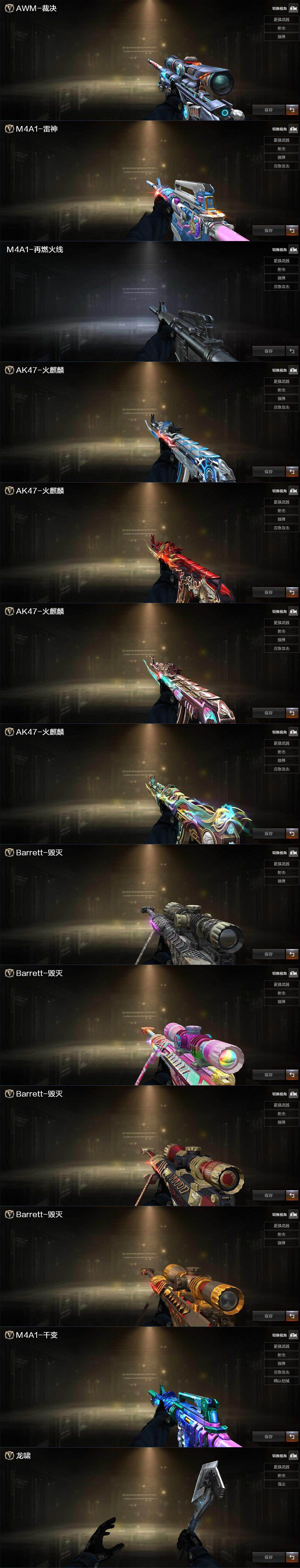 【英雄级武器】:AK47-火麒麟,M4A1-黑龙,M4A1-雷神,M4A1-黑骑士,无影-神兵利器,金色蔷薇-古蛇迷踪,烈火-动感闪耀,Barrett-毁灭*2,AWM-裁决,M200-幻神,炼狱-百战金芒,天神-动感闪耀,修罗-古蛇迷踪,擎天*2,屠龙-动感闪耀,麒麟刺-百战金芒,高爆手雷-雷霆,高爆手雷-雷暴,手雷-动感闪耀,高爆手雷-古蛇迷踪,闪光弹-雷霆,闪光弹-雷暴,烟雾弹-雷霆,烟雾弹-雷暴,烟雾弹-古蛇迷踪,M4A1-赤狱骑士,AWM-昌龙,Barrett-碧霄极光