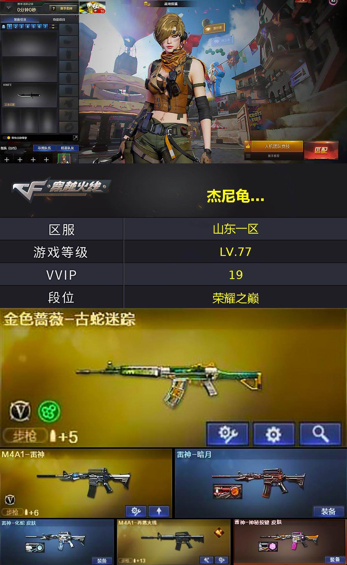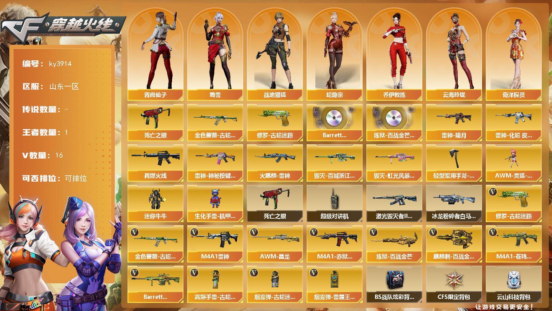[14306835]山东一区-16V-1王者-0炫金 【热门武器】:金色蔷薇-古蛇迷踪,修罗-古蛇迷踪,死亡之眼 【音效卡】:Barrett-碧霄极光音效卡,炼狱-百战金芒-庆典舞曲音效卡 【皮肤】:雷神-暗月,雷神-化蛇 皮肤,M4A1-再燃火线,雷神-神秘按键 皮肤,火麒麟-雷神,毁灭-百城浙江 皮肤,毁灭-虹光风暴 皮肤,轻型军用手斧-再燃火线 【角色】:战地猎狐,蛇隐宗,奇洋探员,乔伊教练,云海玲珑,暗夜-X,电竞少女,飞虎队-X,兰-新年限定,猎狐者-追月,0号玩家,龙儿,潘多拉-甜心教官,青霞仙子,蛇姬,斯沃特-X,蜀雪,维纳斯,雪莉杨,雪莉杨-摸金校尉,夜玫瑰-宠粉,樱-战斗天使,樱-缤纷夏日,影武者-X 【人偶武器】:AWM-灵狐-15周年嘉年华,迷你牛牛,生化手雷-机甲核心*2 【暴走生化】:死亡之眼,超级对讲机 【挑战大师】:冰龙粉碎者-白马银枪,激光毁灭者III-白马银枪 【英雄级武器】:M4A1-雷神,金色蔷薇-古蛇迷踪,炼狱-百战金芒,修罗-古蛇迷踪,麒麟刺-百战金芒,高爆手雷-古蛇迷踪,烟雾弹-古蛇迷踪,烟雾弹-雷霆王者-觉醒版,M4A1-赤狱骑士,M4A1-苍鸣雷神,AWM-昌龙,Barrett-碧霄极光*3 【道具】:BS战队炫彩背包,CFS限定背包,云山科技背包,亚洲杯纪念炫彩背包,古蛇迷踪炫彩背包,奇洋探员-海龟背包,女皇终结者-背包,炫彩背包-诺拉,百战金芒炫彩背包,背包-洛丽塔,超级背包,女皇终结者-魔龙之吻,救世主-黑桃战神,绿色巨人,灵魂忍者*2,变异宝贝,妖姬*2,迷雾幽灵*3,生化弹匣,夺命之镰,防化服*3,流光-鎏金之域,流光-再燃火线,枪王排位28赛季金色流光,枪王排位29赛季金色流光,语音特效-盛典烟火,古蛇迷踪打击特效,蛇隐宗表情,萌萌小葵表情,EP战队名片,EP战队喷图,EP战队击杀图标,C4-再燃火线,防弹头盔*3,防弹衣*3,C4工具钳*3,手雷包*3 【特殊枪械】: