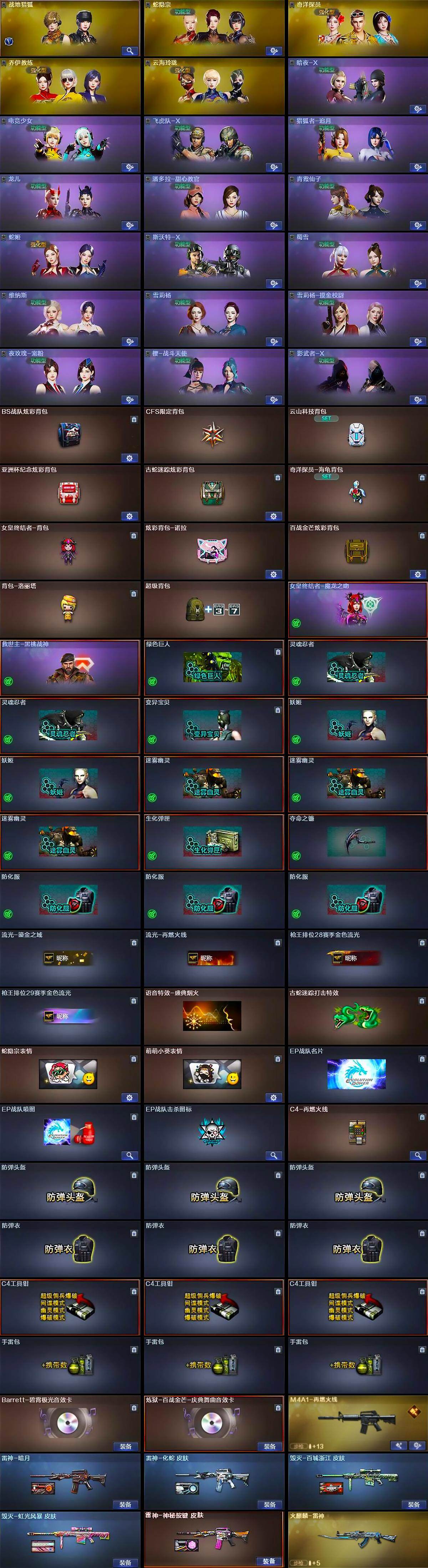 【道具】:BS战队炫彩背包,CFS限定背包,云山科技背包,亚洲杯纪念炫彩背包,古蛇迷踪炫彩背包,奇洋探员-海龟背包,女皇终结者-背包,炫彩背包-诺拉,百战金芒炫彩背包,背包-洛丽塔,超级背包,女皇终结者-魔龙之吻,救世主-黑桃战神,绿色巨人,灵魂忍者*2,变异宝贝,妖姬*2,迷雾幽灵*3,生化弹匣,夺命之镰,防化服*3,流光-鎏金之域,流光-再燃火线,枪王排位28赛季金色流光,枪王排位29赛季金色流光,语音特效-盛典烟火,古蛇迷踪打击特效,蛇隐宗表情,萌萌小葵表情,EP战队名片,EP战队喷图,EP战队击杀图标,C4-再燃火线,防弹头盔*3,防弹衣*3,C4工具钳*3,手雷包*3