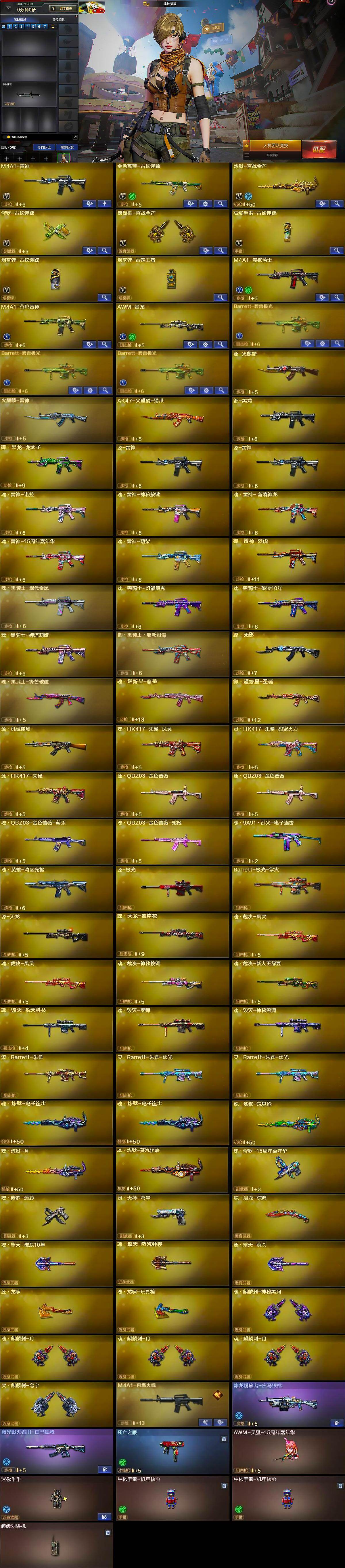 【英雄级武器】:M4A1-雷神,金色蔷薇-古蛇迷踪,炼狱-百战金芒,修罗-古蛇迷踪,麒麟刺-百战金芒,高爆手雷-古蛇迷踪,烟雾弹-古蛇迷踪,烟雾弹-雷霆王者-觉醒版,M4A1-赤狱骑士,M4A1-苍鸣雷神,AWM-昌龙,Barrett-碧霄极光*3