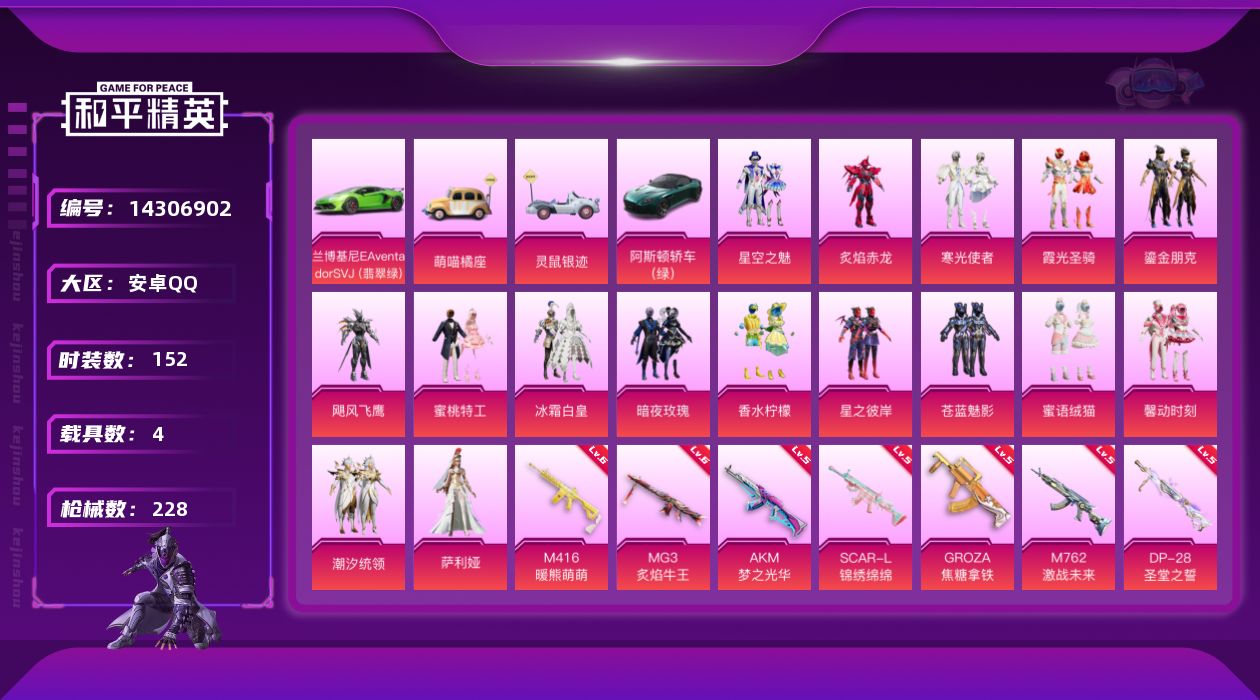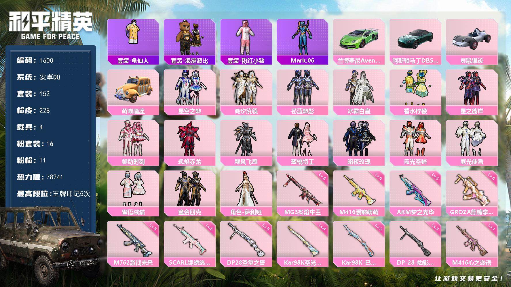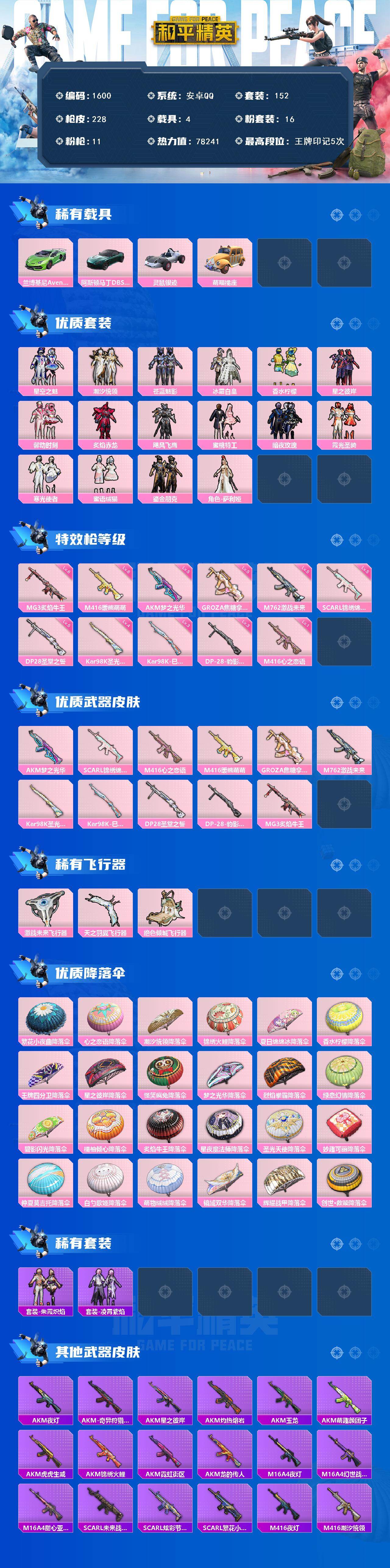 [14306902]安卓 手Q-16粉装-11特效枪-4载具-4粉色飞行器-78241热力值-5王牌印记-152套装-228枪皮