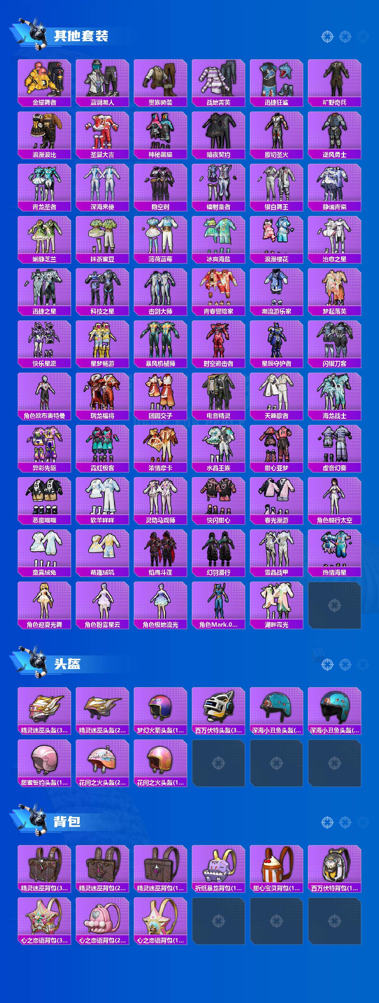 套装-星空之魅,套装-炙焰赤龙,套装-寒光使者,套装-霞光圣骑,套装-鎏金朋克,套装-飓风飞鹰,套装-蜜桃特工,套装-暗夜玫瑰,套装-香水柠檬,套装-星之彼岸,套装-苍蓝魅影,套装-蜜语绒猫,套装-馨动时刻,套装-潮汐统领,角色-萨利娅