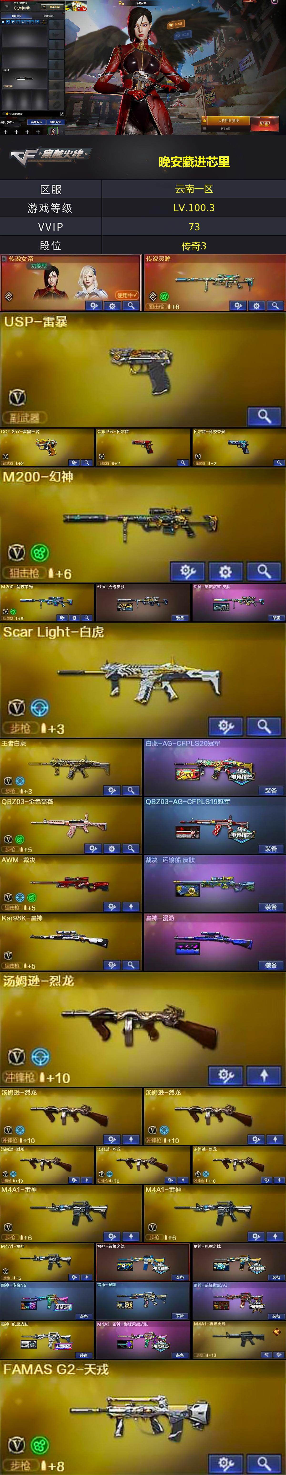 [14306923]云南一区-69V-26王者-1炫金 【传说武器】:传说灵眸 【传说角色】:传说女帝 【热门武器】:传说灵眸,QBZ03-金色蔷薇,Scar Light-白虎,HK417-朱雀,M4A1-青龙,M200-幻神,M200-竞技荣光,死亡之眼*2,荣耀世冠-柯尔特,Kar98K-星神,M4A1-黑骑士,汤姆逊-烈龙*6,斯泰尔-蝴蝶,USP-雷暴,沙鹰-修罗,金刚伞 【王者炫金武器】:炫金超新星 【音效卡】:M4A1-黑骑士音效卡,HK417-朱雀音效卡,QBZ03-天罚音效卡,Barrett-碧霄极光音效卡,炼狱-百战金芒-庆典舞曲音效卡 【皮肤】:幻神-周瑜皮肤,幻神-电流骇客 皮肤,白虎-AG-CFPLS20冠军,QBZ03-AG-CFPLS19冠军,裁决-运输船 皮肤,星神-漫游,雷神-荣耀之魄,雷神-冠军之魄,雷神-传奇N9,雷神-杨戬,雷神-荣耀世冠AG,雷神-航星皮肤,M4A1-雷神-巅峰荣耀皮肤,M4A1-再燃火线,火麒麟-华夏之心,传奇石头-横秒之巅,火麒麟-荣耀世冠AG,火麒麟-心动糖果,毁灭-荣耀之怒,毁灭-星空,毁灭-SV-CFPLS16冠军,毁灭-风暴,黑龙-冠军之武,黑骑士-暗月,战神-粉色甜心皮肤*2,战神-紫绶金章皮肤,战神-流金岁月皮肤,AK47-B-常胜将军-曹操*2,AK47-B-常胜将军-刘备,AK47-B-常胜将军-孙权*3,AWM-天龙-传奇70KG,AWM-天龙-传奇白鲨,屠龙-荣耀世冠AG,屠龙-惊鸿 皮肤,轻型军用手斧-再燃火线,麒麟刺-甜蜜糖果 皮肤,麒麟刺-荣耀世冠白鲨 【角色】:炫,电竞教官-云悠悠,王者-葵-貂蝉,王者春,王者玲珑,王者玲珑-小乔,雪域霜狐,奇洋探员,暗夜-X,初恋灵狐,飞虎队-X,风暴女,虎妞,嘉年华灵狐,灵狐者-X,龙儿,麻雀,曼陀罗-X,潘多拉-X,斯沃特-X,蜀雪,游珑儿,职业选手 【人偶武器】:斯泰尔-蝴蝶,巴雷特-零-水下丽影,COP-旗袍,迷你深渊冰龙*2,迷你波特博士*2,迷你曼提柯尔,夺魂,迷你牛牛*4,迷你火种*2,迷你生化手雷,生化手雷-机甲核心*2,闪光弹-貂蝉,高爆手雷-大乔,迷你艾比,灵狐娃娃手雷 【暴走生化】:死亡之眼*2,超级对讲机 【挑战大师】:神圣爆裂者III,冰龙粉碎者-白马银枪,激光毁灭者III-白马银枪*2,机甲撕裂者III,试炼破坏者III,神圣爆裂者-