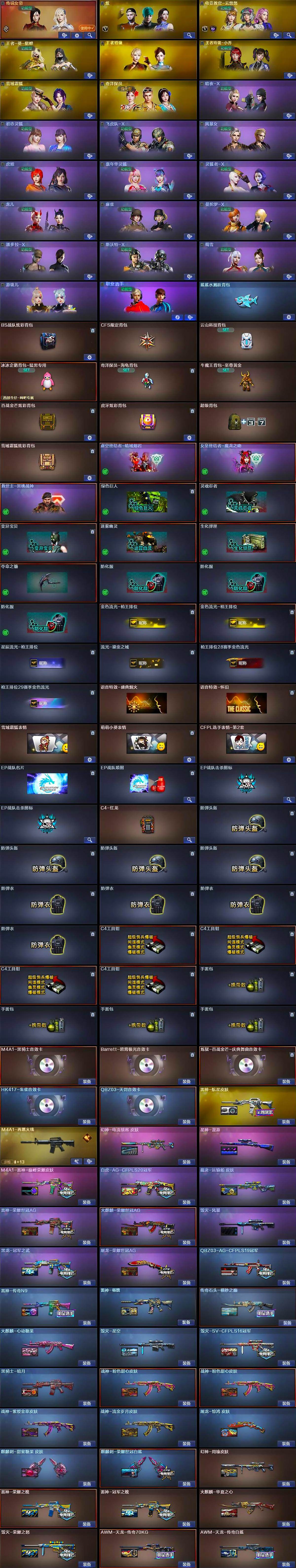 【皮肤】:幻神-周瑜皮肤,幻神-电流骇客 皮肤,白虎-AG-CFPLS20冠军,QBZ03-AG-CFPLS19冠军,裁决-运输船 皮肤,星神-漫游,雷神-荣耀之魄,雷神-冠军之魄,雷神-传奇N9,雷神-杨戬,雷神-荣耀世冠AG,雷神-航星皮肤,M4A1-雷神-巅峰荣耀皮肤,M4A1-再燃火线,火麒麟-华夏之心,传奇石头-横秒之巅,火麒麟-荣耀世冠AG,火麒麟-心动糖果,毁灭-荣耀之怒,毁灭-星空,毁灭-SV-CFPLS16冠军,毁灭-风暴,黑龙-冠军之武,黑骑士-暗月,战神-粉色甜心皮肤*2,战神-紫绶金章皮肤,战神-流金岁月皮肤,AK47-B-常胜将军-曹操*2,AK47-B-常胜将军-刘备,AK47-B-常胜将军-孙权*3,AWM-天龙-传奇70KG,AWM-天龙-传奇白鲨,屠龙-荣耀世冠AG,屠龙-惊鸿 皮肤,轻型军用手斧-再燃火线,麒麟刺-甜蜜糖果 皮肤,麒麟刺-荣耀世冠白鲨