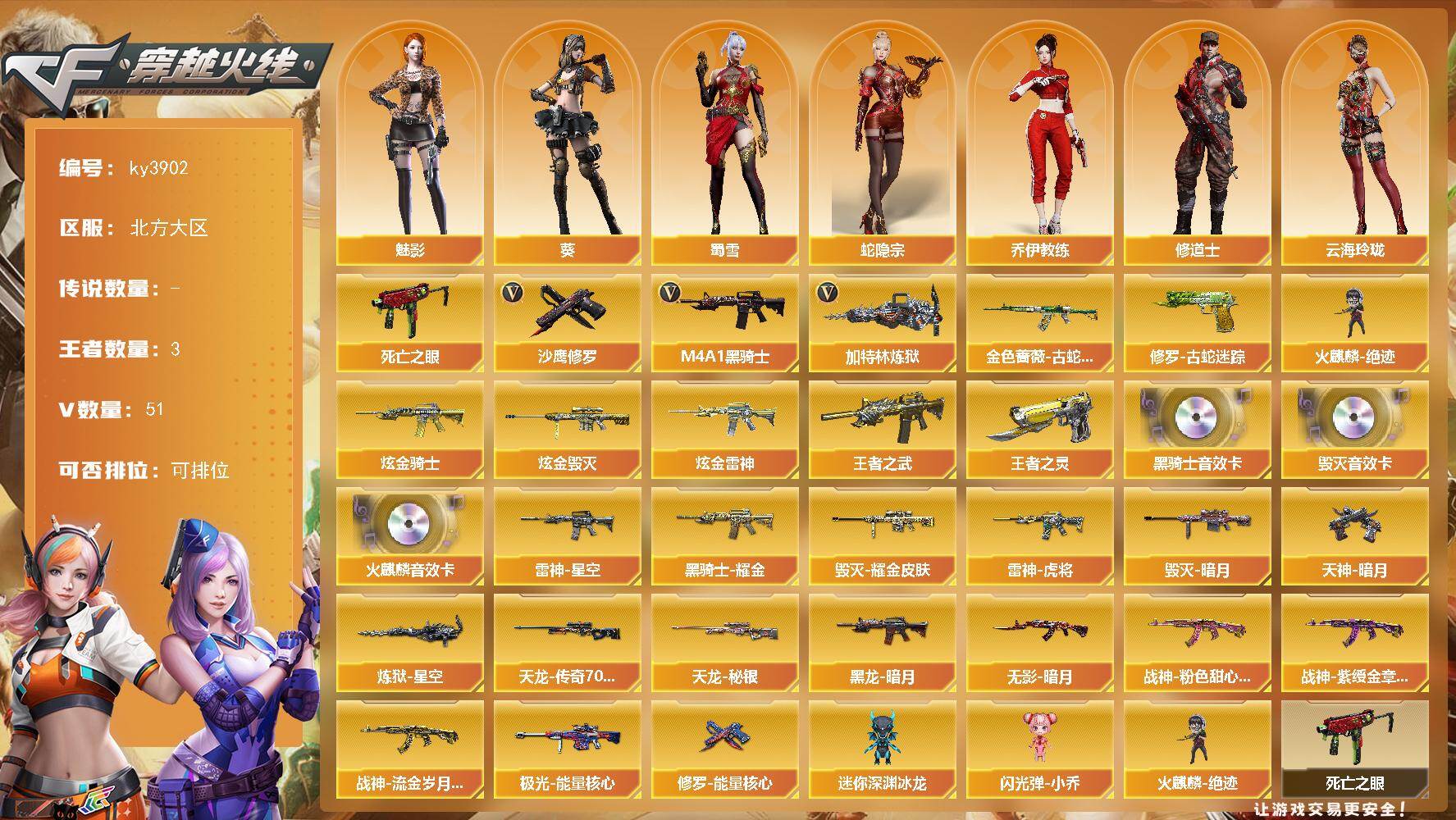[14307302]北方大区-51V-3王者-5炫金 【热门武器】:金色蔷薇-古蛇迷踪,修罗-古蛇迷踪,死亡之眼*2,M4A1-黑骑士*3,加特林-炼狱,火麒麟-绝迹,沙鹰-修罗*8 【王者炫金武器】:王者之武*2,王者之灵,炫金骑士,炫金雷神*3,炫金毁灭 【音效卡】:AK47-火麒麟音效卡,M4A1-黑骑士音效卡,Barrett-毁灭音效卡 【皮肤】:雷神-星空*4,雷神-虎将,毁灭-暗月,毁灭耀金皮肤,黑龙-暗月,黑骑士耀金皮肤,无影-暗月*2,战神-粉色甜心皮肤,战神-紫绶金章皮肤*7,战神-流金岁月皮肤*4,天龙-秘银,AWM-天龙-传奇70KG,极光-能量核心,炼狱-星空,修罗-能量核心*3,天神-暗月*2 【角色】:葵,魅影,蛇隐宗,乔伊教练,修道士,云海玲珑,灵狐者-黄金海岸,潘多拉-甜心教官,潜龙队-X,蛇姬,蜀雪 【人偶武器】:火麒麟-绝迹,迷你深渊冰龙,闪光弹-小乔 【暴走生化】:死亡之眼*2 【挑战大师】:AK47-冰龙粉碎者 【英雄级武器】:AK47-火麒麟,M4A1-黑龙,M4A1-雷神*2,M4A1-黑骑士*3,M4A1-死神,AK47-黑武士,AK47-黑鲨,M4A1-龙血,金色蔷薇-古蛇迷踪,AK-47-猩红传说*8,AK47-B-战神,AWM-天龙,Barrett-毁灭,Barrett-极光*2,AWM-裁决,加特林-炼狱,沙鹰-修罗*8,沙鹰-天神,修罗-古蛇迷踪,屠龙*4,龙啸,麒麟刺-堕天神,擎天*2,麒麟刺,高爆手雷-堕天神,高爆手雷-古蛇迷踪,闪光弹-堕天神,烟雾弹-堕天神,烟雾弹-古蛇迷踪,M4A1-赤狱骑士 【道具】:古蛇迷踪炫彩背包,炫彩背包,背包-洛丽塔,超级背包,女皇终结者-魔龙之吻,救世主-黑桃战神,绿色巨人,灵魂忍者,迷雾幽灵,夺命之镰,防化服*2,枪王排位29赛季金色流光,古蛇迷踪打击特效,蛇隐宗表情,云海游龙表情,防弹头盔*2,防弹衣*2,C4工具钳*2,手雷包*2 【特殊枪械】:3黑骑士,1炼狱