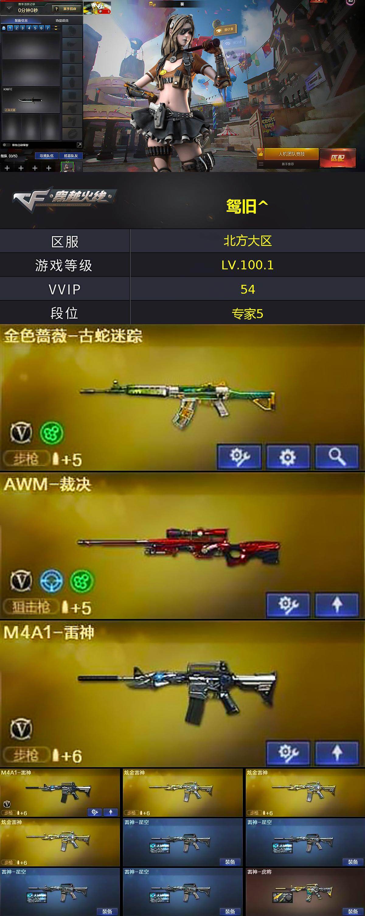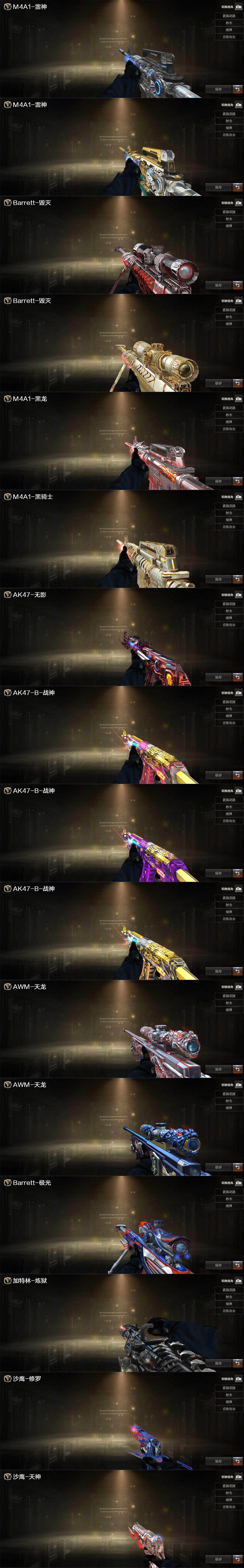【热门武器】:金色蔷薇-古蛇迷踪,修罗-古蛇迷踪,死亡之眼*2,M4A1-黑骑士*3,加特林-炼狱,火麒麟-绝迹,沙鹰-修罗*8