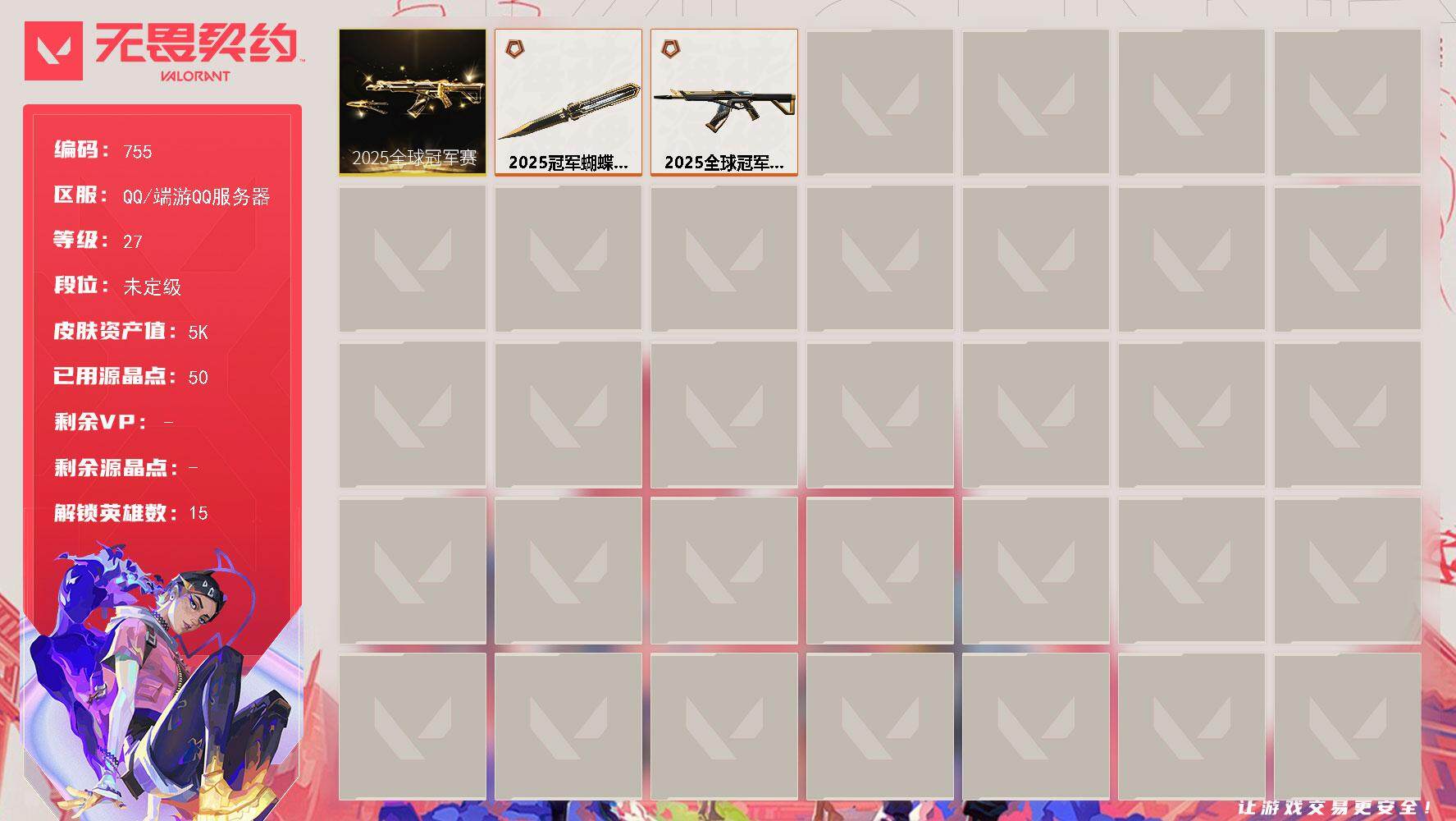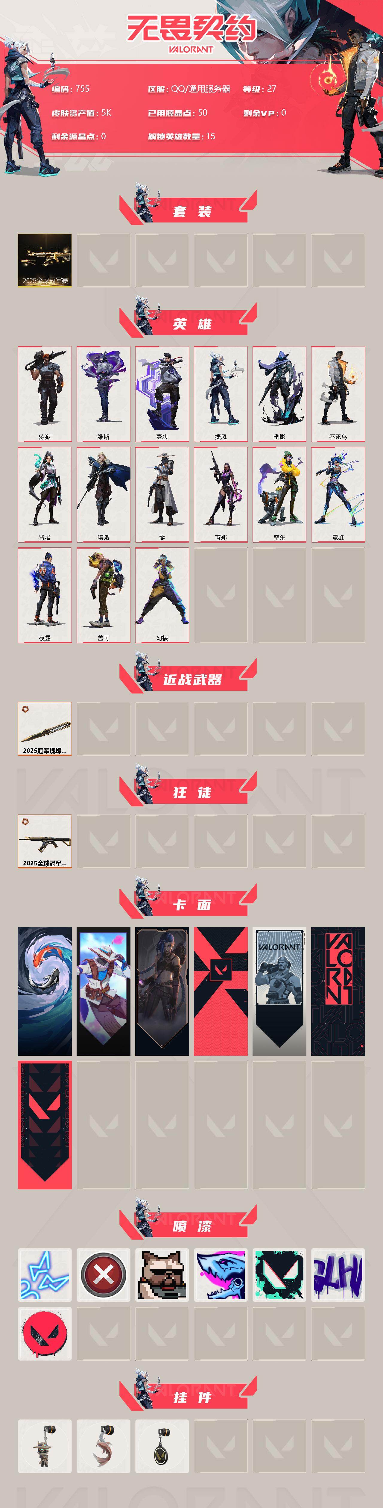 [14309733]【套装】:2025全球冠军赛套装 【英雄】:幻棱,炼狱,维斯,壹决,捷风,幽影,不死鸟,贤者,猎枭,零,芮娜,奇乐,霓虹,夜露,盖可 【近战 武器】:近战武器-2025全球冠军赛 蝴蝶刀 【狂徒】:狂徒-2025全球冠军赛 【卡面】:红鳞松叶 卡面,无畏契约GO!第一卷:零 卡面,《双城之战》金克丝 卡面,代号红色 卡面,新兵报到 卡面,V契约 卡面,无畏契约 卡面 【喷漆】:霓光四射 喷漆,买装还是存钱 喷漆,关门放狗 喷漆,暴走萝莉 喷漆,胜利属于无畏契约 喷漆,GLHF 喷漆,无畏契约 喷漆 【挂饰】:无畏契约GO!第一卷 零 挂饰,红鳞松叶 挂饰,无畏契约 纪念币 挂饰