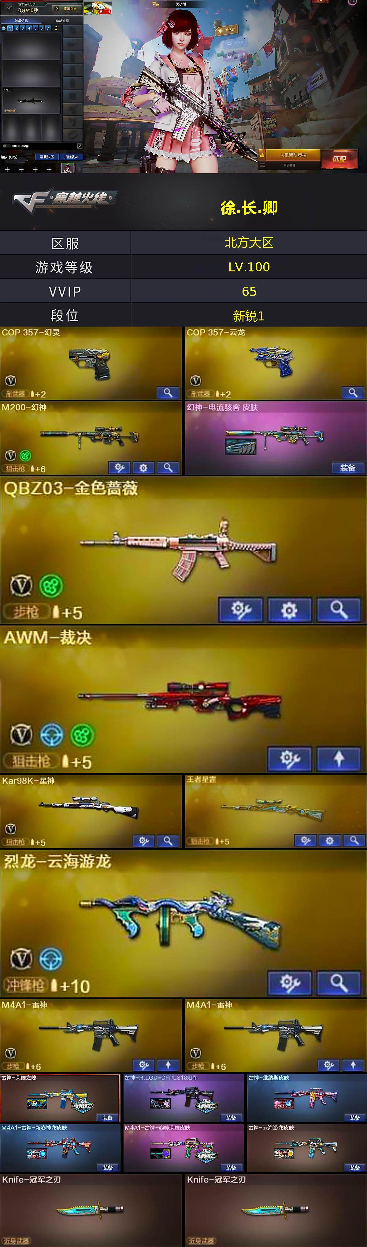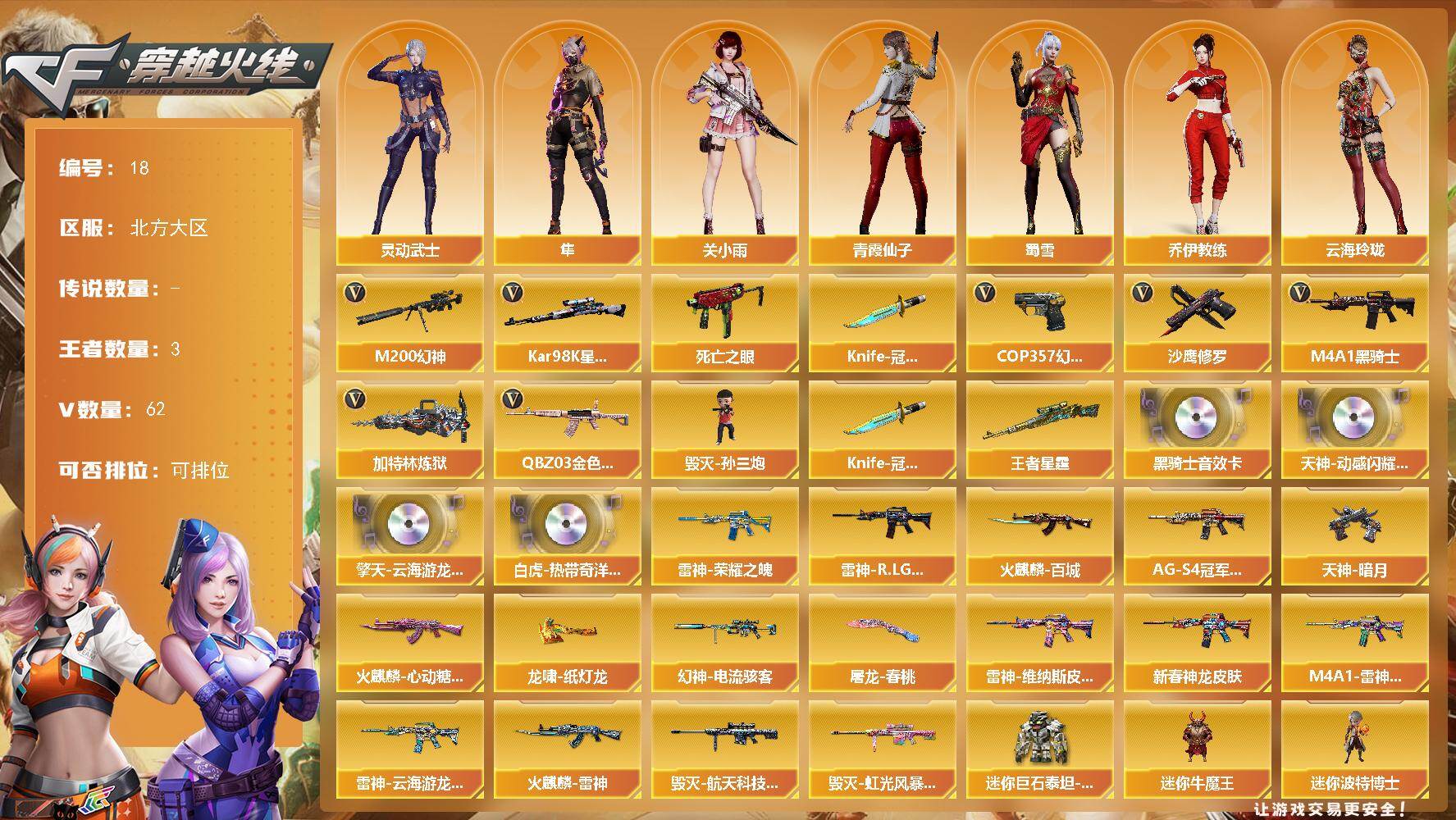 [14314168]北方大区-62V-3王者-0炫金 【热门武器】:QBZ03-金色蔷薇,M200-幻神,死亡之眼,Kar98K-星神,M4A1-黑骑士,加特林-炼狱,毁灭-孙三炮,COP 357-幻灵,沙鹰-修罗*2,Knife-冠军之刃*4 【王者炫金武器】:王者星霆 【音效卡】:天神-动感闪耀 音效卡,擎天-云海游龙音效卡,Scar Light-白虎-热带奇洋音效卡,M4A1-黑骑士音效卡 【皮肤】:幻神-电流骇客 皮肤,雷神-荣耀之魄,雷神-R.LGD-CFPLS18冠军,雷神-维纳斯皮肤,M4A1-雷神-新春神龙皮肤,M4A1-雷神-巅峰荣耀皮肤,雷神-云海游龙皮肤,火麒麟-雷神,火麒麟-百城,火麒麟-心动糖果,毁灭-航天科技皮肤,毁灭-虹光风暴 皮肤,黑骑士-AG-S4冠军典藏,天神-暗月,屠龙-春桃 皮肤,龙啸-纸灯龙皮肤 【角色】:关小雨,隼,奇洋探员,乔伊教练,云海玲珑,空,暗夜-X,北极狐-X,初恋灵狐,飞虎队-X,风暴女,虎妞,嘉年华灵狐,娟娟,兰-新年限定,猎狐者-追月,灵动武士,灵狐-花神,灵狐者-X,灵狐者-七夕宝贝,流浪蔷薇,龙儿,麻雀,曼陀罗-X,曼陀罗-礼服,潘多拉-X,潘多拉-甜心教官,潜龙队-X,青霞仙子,斯沃特-X,蜀雪,兔囡囡,维纳斯,新娜塔莎,夜玫瑰-幻能朋克,樱-战斗天使,影武者-X,游珑儿 【人偶武器】:毁灭-孙三炮,迷你牛魔王,迷你波特博士,夺魂,迷你牛牛*2,生化手雷-机甲核心,深渊终结者手雷*2,迷你巨石泰坦-魔花研究所,灵狐娃娃手雷 【暴走生化】:死亡之眼,超级对讲机 【挑战大师】:冰龙粉碎者-白马银枪,激光毁灭者III-白马银枪,神圣爆裂者-末日III 【英雄级武器】:AK47-火麒麟,M4A1-雷神*2,M4A1-黑骑士,AN94-超新星,AK47-机械迷城,无影-神兵利器,黑武士-锦绣游龙,超新星-热带奇洋,QBZ03-金色蔷薇,烈火-动感闪耀,天启-悦智-觉醒版,Barrett-毁灭,AWM-裁决,M200-幻神,Kar98K-星神,王者之怒-觉醒版,加特林-炼狱,烈龙-云海游龙,AA-12-雷霆,沙鹰-修罗*2,沙鹰-天神,COP 357-幻灵,COP 357-云龙,天神-动感闪耀,屠龙,龙啸,麒麟刺,幻灵之锋,屠龙-动感闪耀,擎天-云海游龙,龙啸-热带奇洋,高爆手雷-幻灵*5,手雷-动感闪耀,高爆手雷-云龙*3,手雷