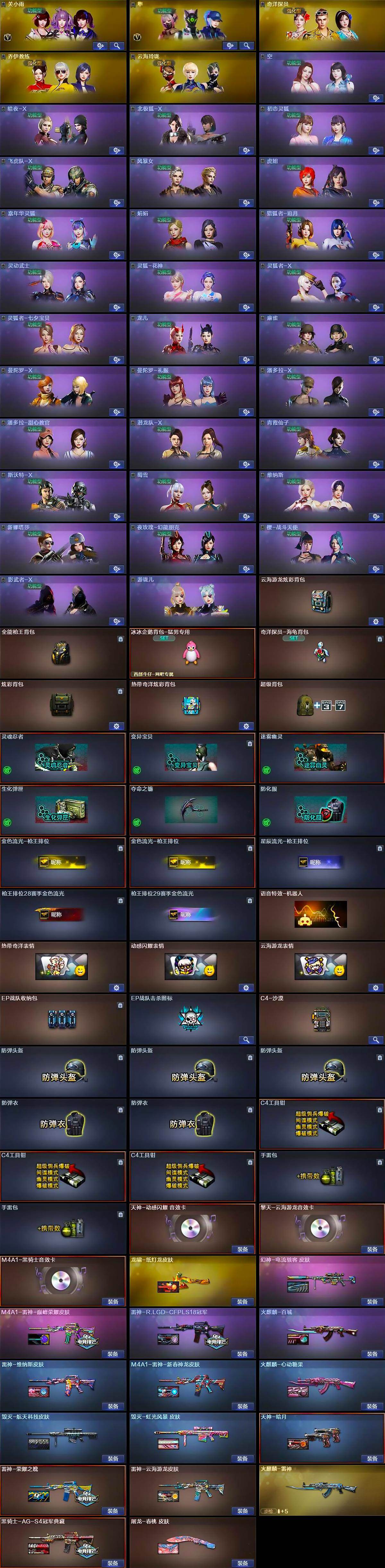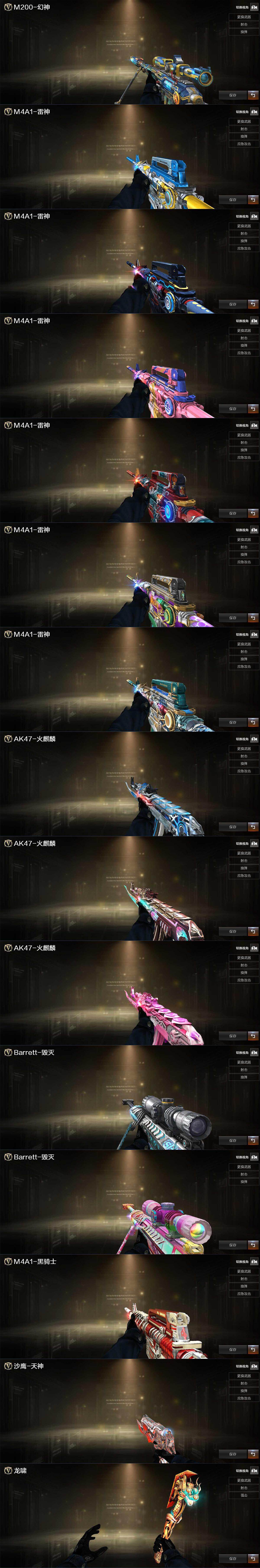 【英雄级武器】:AK47-火麒麟,M4A1-雷神*2,M4A1-黑骑士,AN94-超新星,AK47-机械迷城,无影-神兵利器,黑武士-锦绣游龙,超新星-热带奇洋,QBZ03-金色蔷薇,烈火-动感闪耀,天启-悦智-觉醒版,Barrett-毁灭,AWM-裁决,M200-幻神,Kar98K-星神,王者之怒-觉醒版,加特林-炼狱,烈龙-云海游龙,AA-12-雷霆,沙鹰-修罗*2,沙鹰-天神,COP 357-幻灵,COP 357-云龙,天神-动感闪耀,屠龙,龙啸,麒麟刺,幻灵之锋,屠龙-动感闪耀,擎天-云海游龙,龙啸-热带奇洋,高爆手雷-幻灵*5,手雷-动感闪耀,高爆手雷-云龙*3,手雷