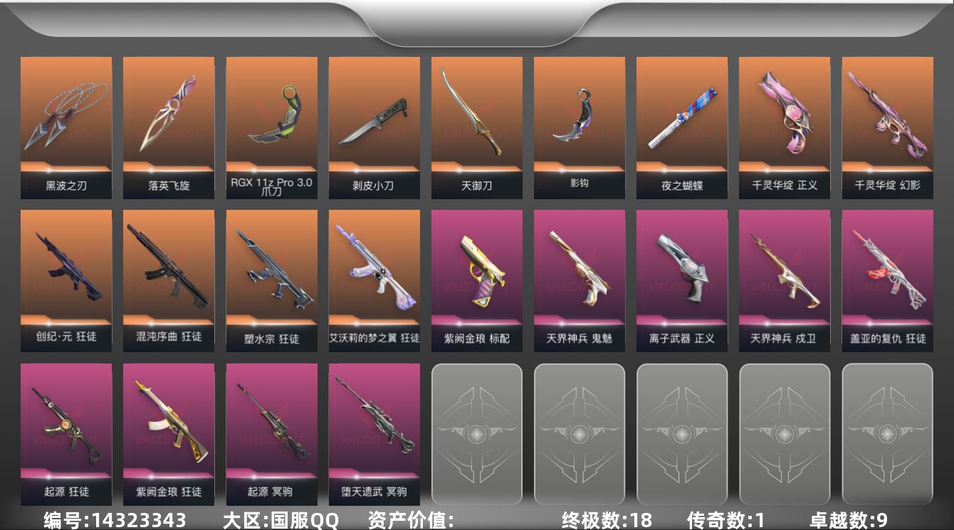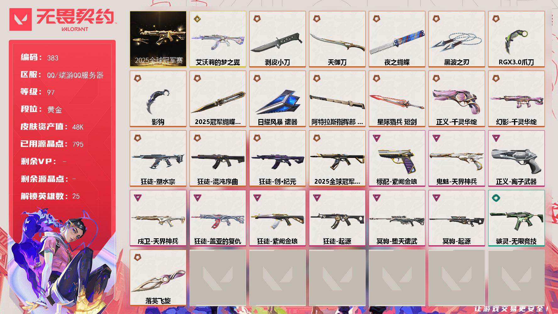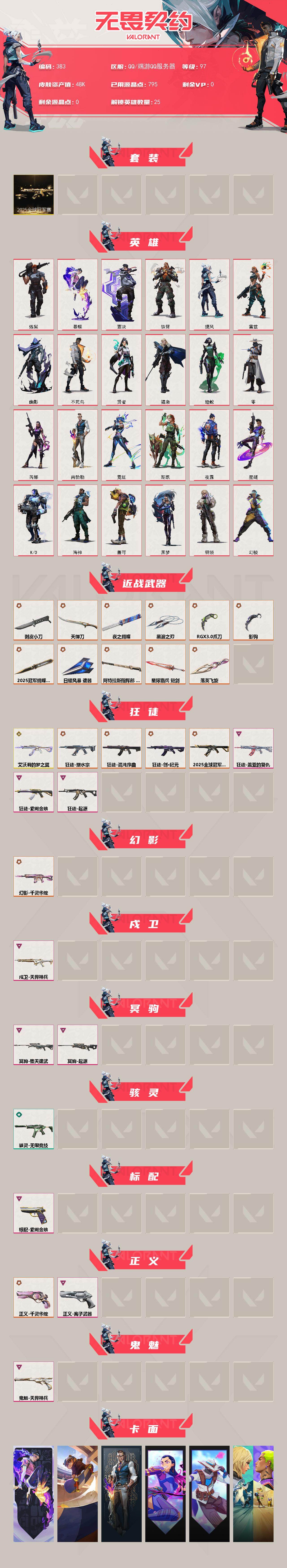 [14323343]【套装】:2025全球冠军赛套装 【英雄】:幻棱,炼狱,暮蝶,壹决,铁臂,捷风,雷兹,幽影,不死鸟,贤者,猎枭,蝰蛇,零,芮娜,尚勃勒,霓虹,斯凯,夜露,星礈,K/O,海神,盖可,黑梦,钢锁 【近战 武器】:近战武器-2025全球冠军赛 蝴蝶刀,近战武器-影钩,近战武器-剥皮小刀,近战武器-RGX 11z Pro//3.0 爪刀,近战武器-黑波之刃,近战武器-落英飞旋,近战武器-夜之蝴蝶,近战武器-天御刀,近战武器-日耀风暴 遗器,近战武器-阿特拉斯指挥部 甩棍,近战武器-星际猎兵 短剑 【狂徒】:狂徒-艾沃莉的梦之翼,狂徒-2025全球冠军赛,狂徒-混沌序曲,狂徒-塑水宗,狂徒-创·纪元,狂徒-盖亚的复仇,狂徒-起源,狂徒-紫阙金琅 【幻影】:幻影-千灵华绽 【戍卫】:戍卫-天界神兵 【冥驹】:冥驹-堕天遗武,冥驹-起源 【骇灵】:骇灵-无限竞技 【标配】:标配-紫阙金琅 【正义】:正义-千灵华绽,正义-离子武器 【鬼魅】:鬼魅-天界神兵 【卡面】:无畏契约:暮蝶 卡面,Clutch 卡面,无畏契约:尚勃勒 卡面,无畏契约GO!第一卷:芮娜 卡面,无畏契约GO!第一卷:零 卡面,钢锁vs盖可 卡面,代号红色 卡面,新兵报到 卡面,V契约 卡面,无畏契约 卡面 【喷漆】:伤心心 喷漆,审判之爪 喷漆,致命优雅 喷漆,买装还是存钱 喷漆,酷熊冲浪 喷漆,胜利属于无畏契约 喷漆,GLHF 喷漆,无畏契约 喷漆 【挂饰】:天外飞客 挂饰,《双城之战》魄罗 挂饰,无畏契约 纪念币 挂饰